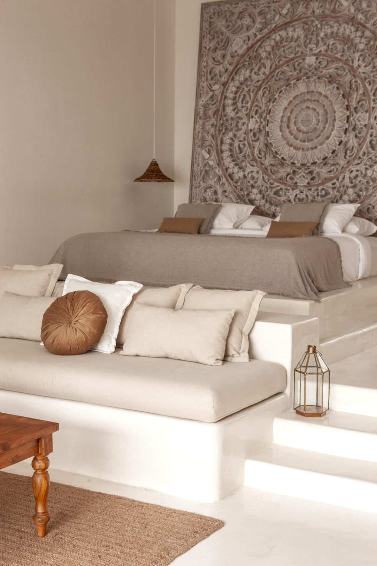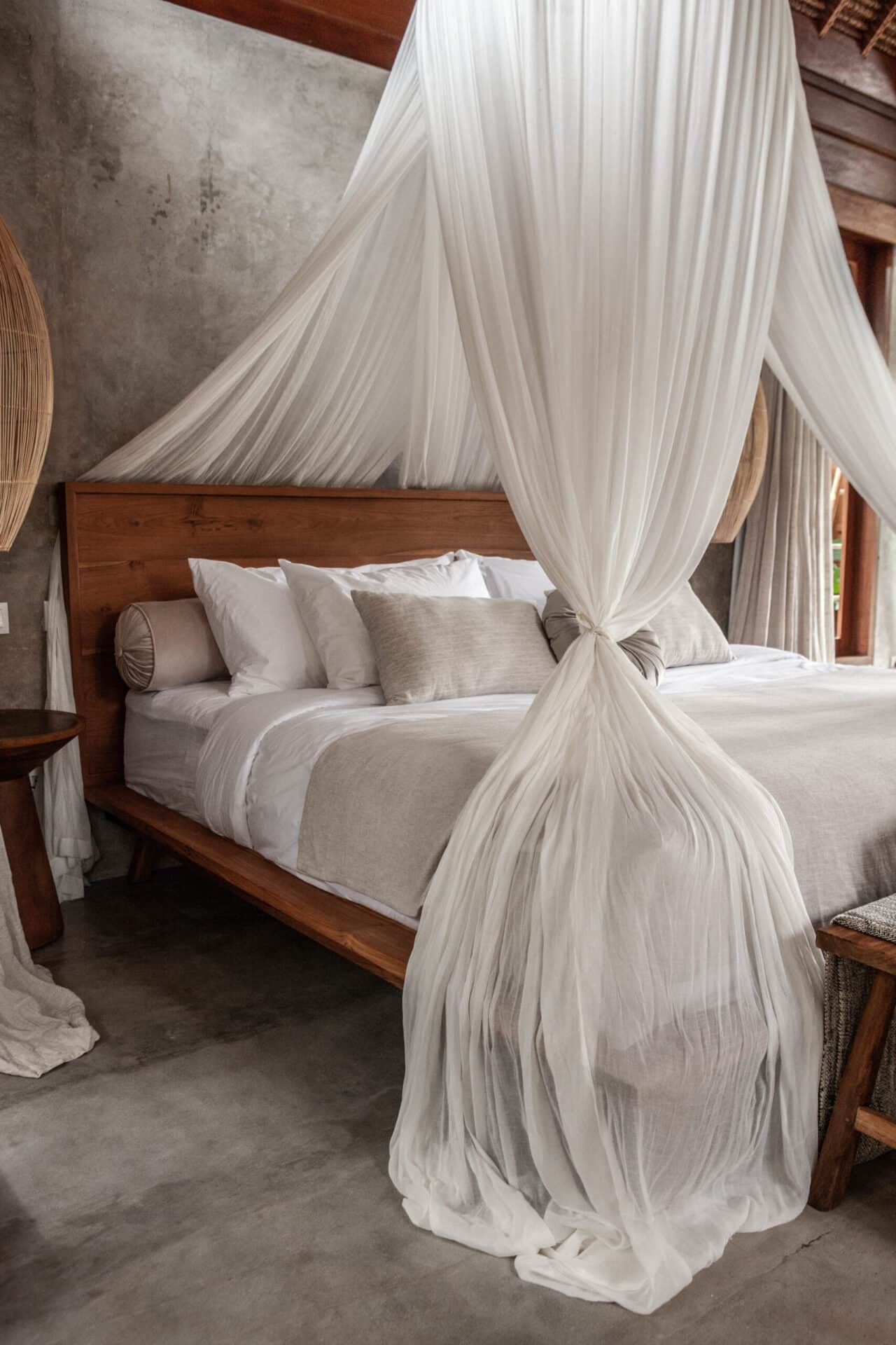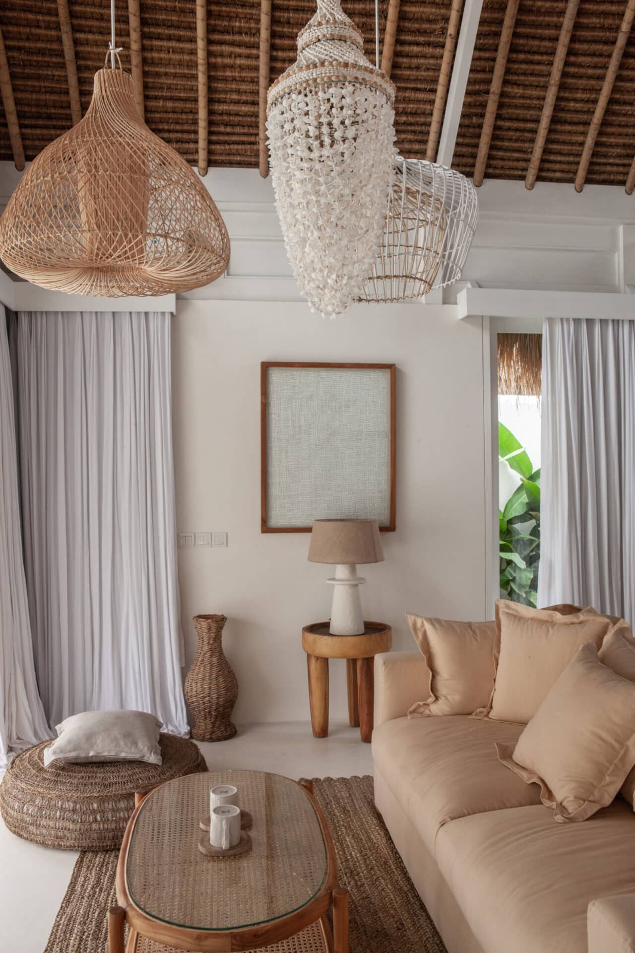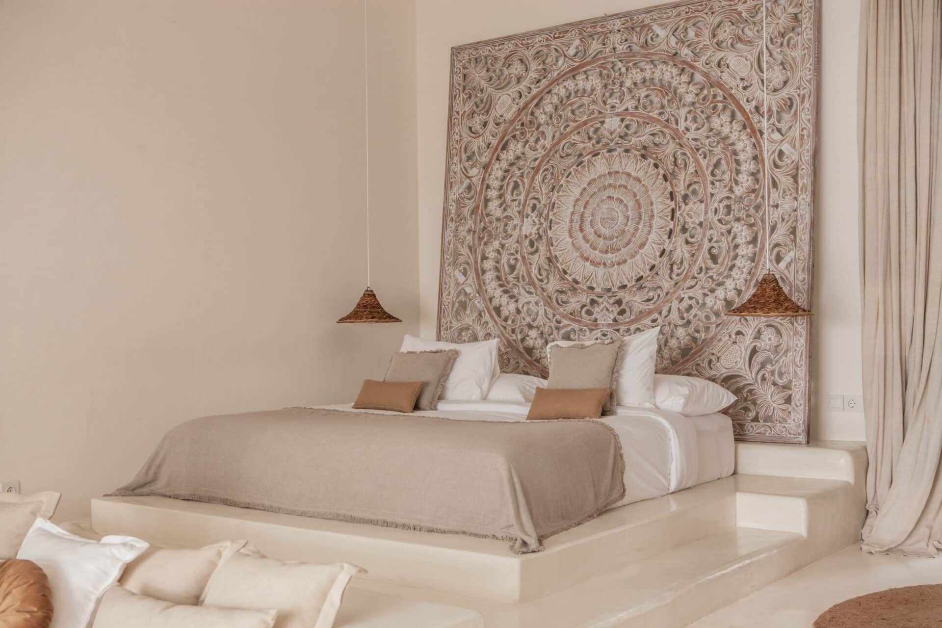 The interiors are intentionally calm and tactile. Flowing canopy drapes, neutral linen upholstery, and custom rattan furniture create an atmosphere of effortless comfort. Statement elements such as carved wall art panels, woven pendant lighting, and handcrafted coffee tables add depth and character without overwhelming the space. Every room is designed to feel open yet intimate, balancing structure with softness.
