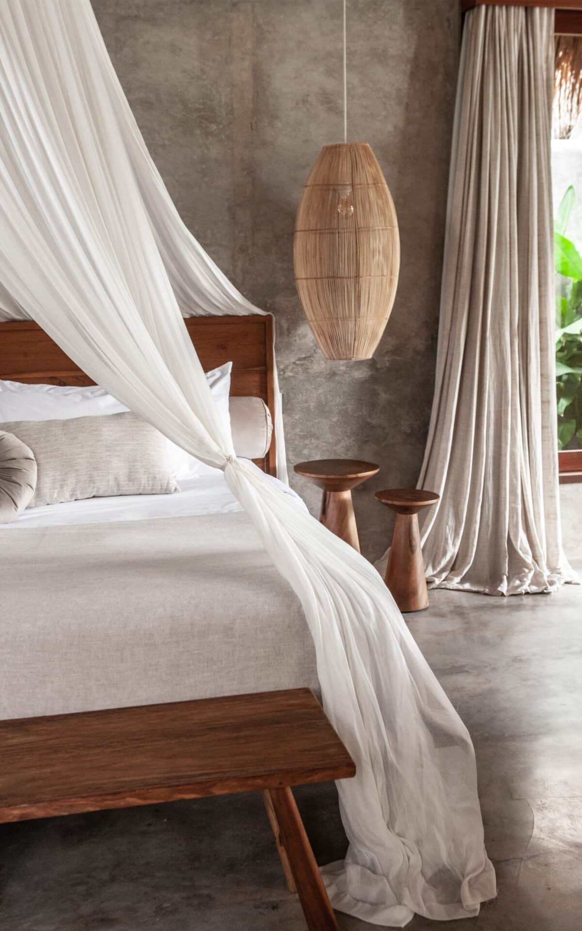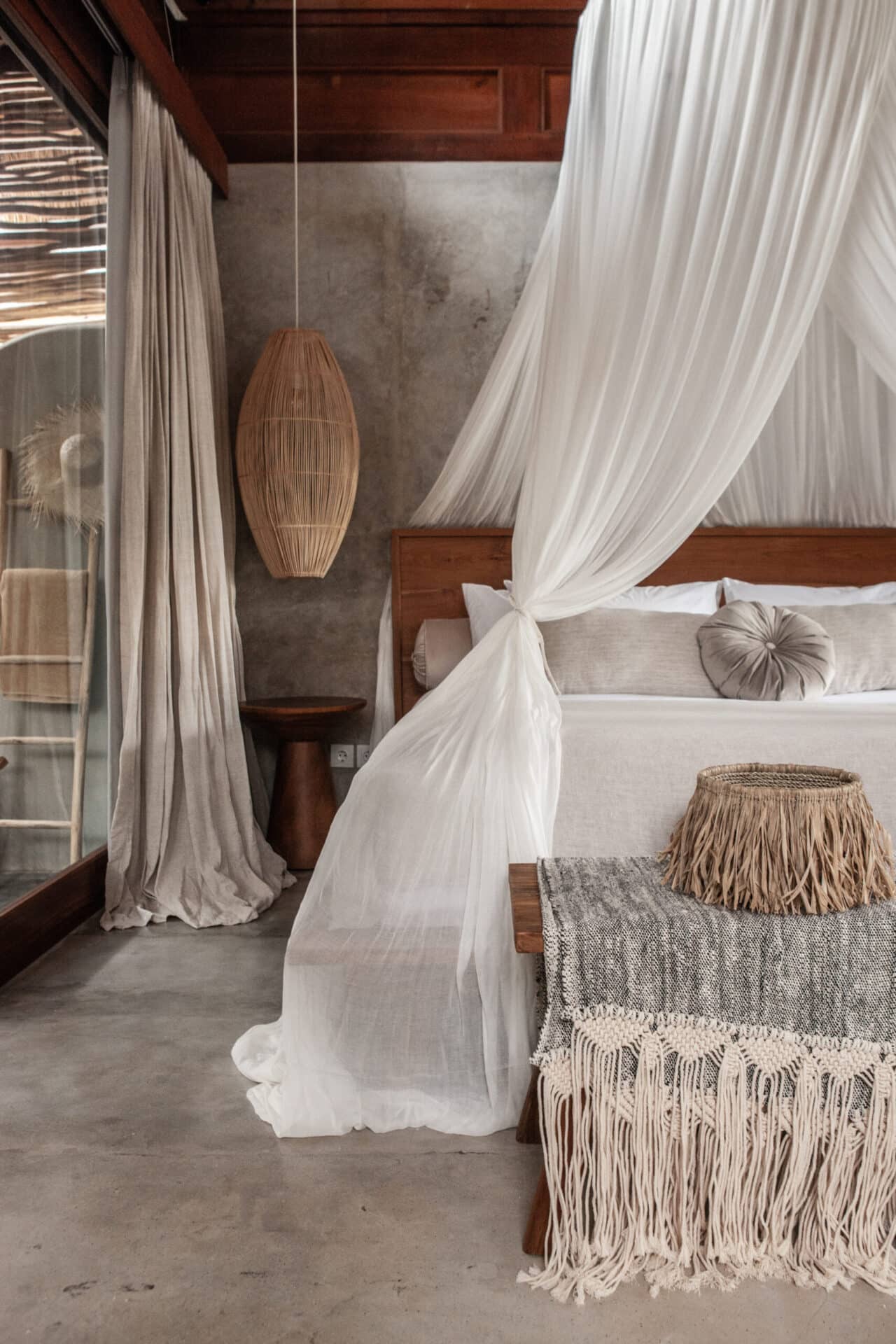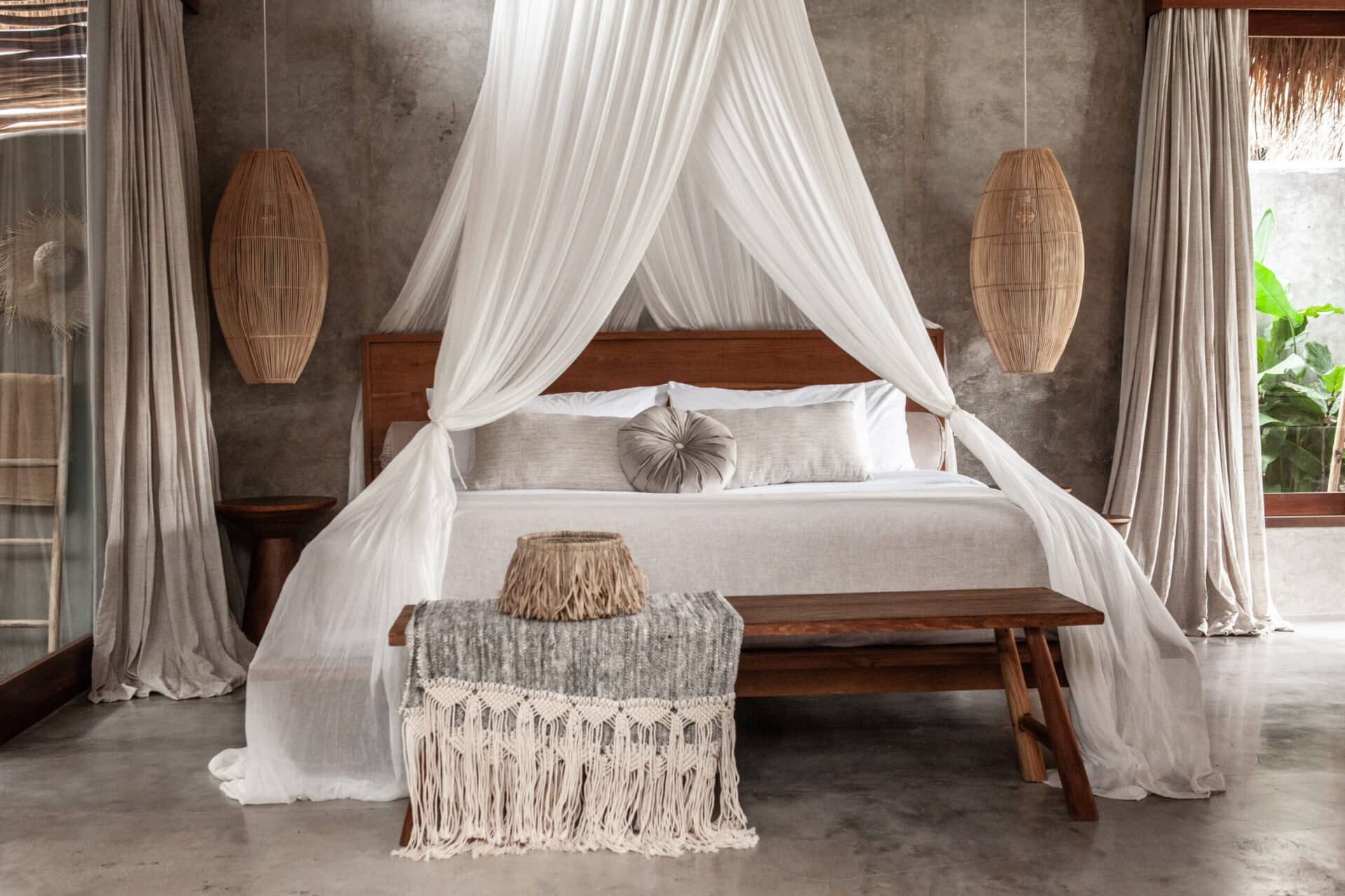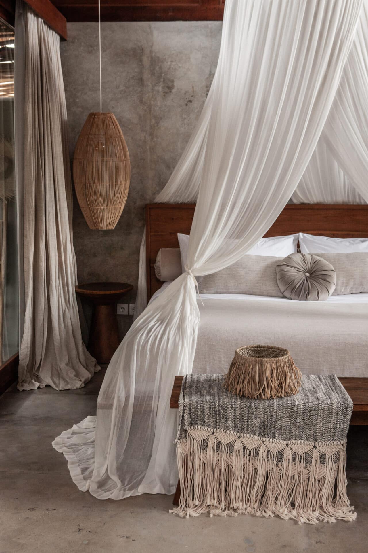 The interiors are intentionally calm and tactile. Flowing canopy drapes, neutral linen upholstery, and custom rattan furniture create an atmosphere of effortless comfort. Statement elements such as carved wall art panels, woven pendant lighting, and handcrafted coffee tables add depth and character without overwhelming the space. Every room is designed to feel open yet intimate, balancing structure with softness.