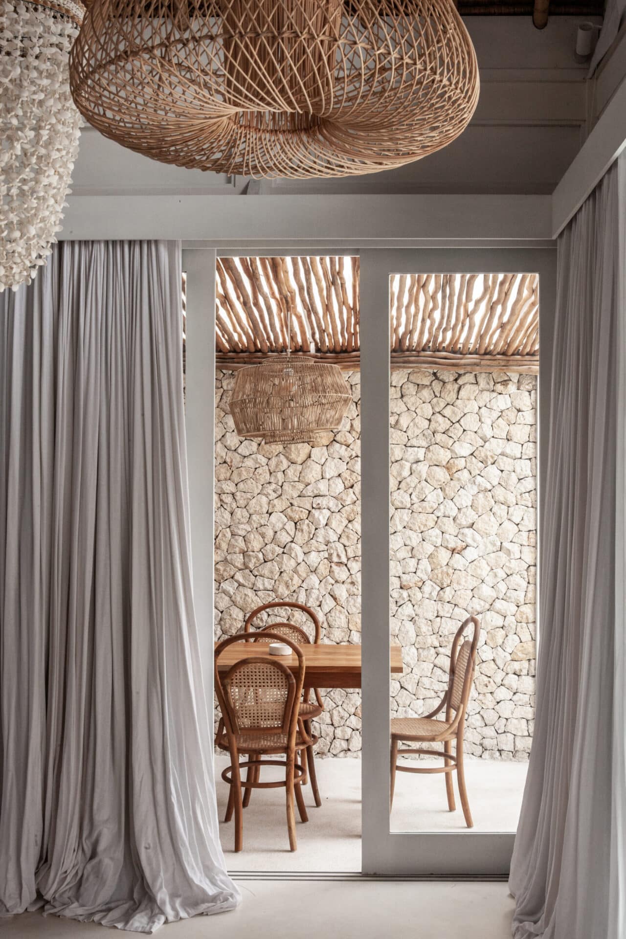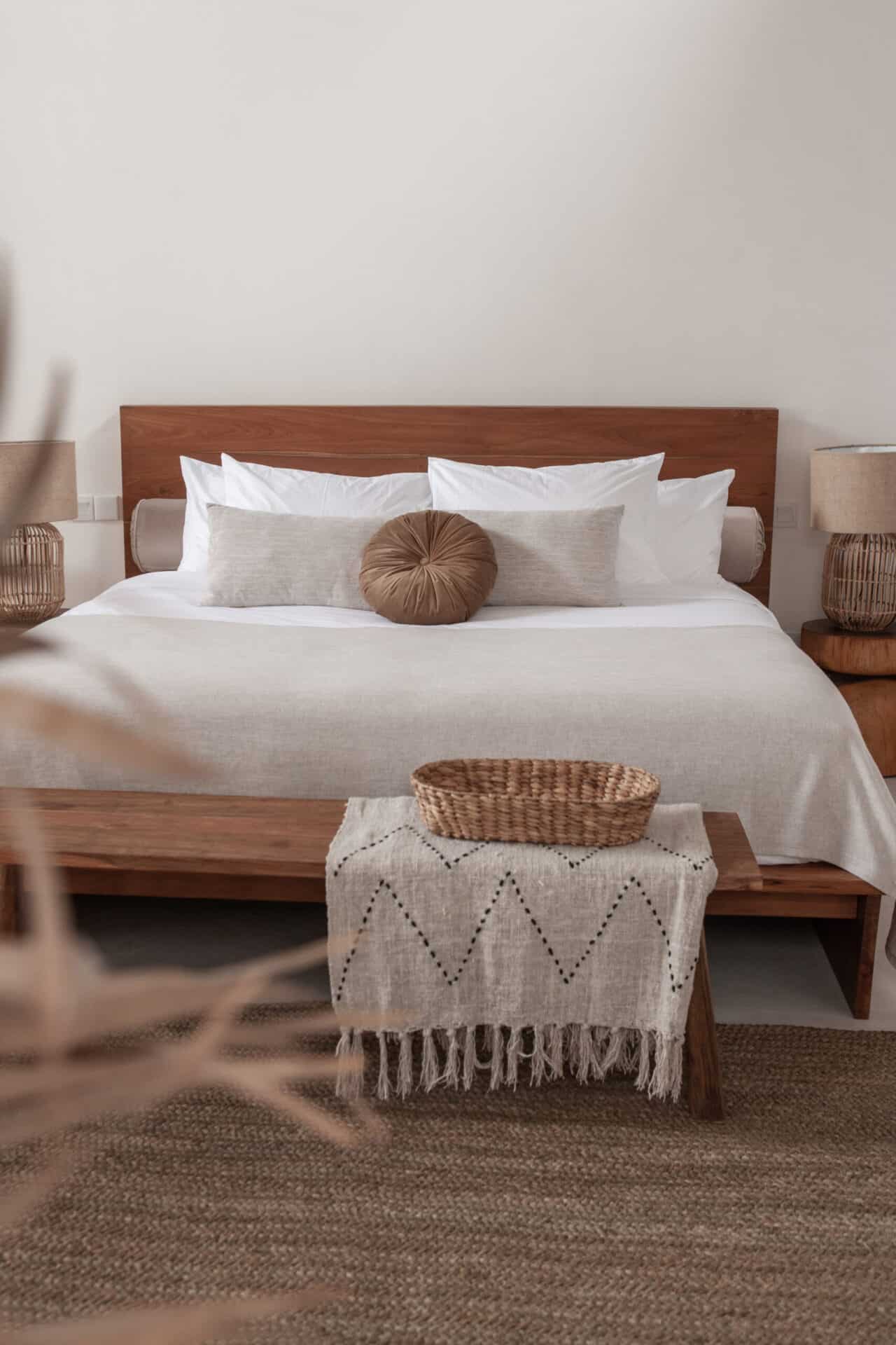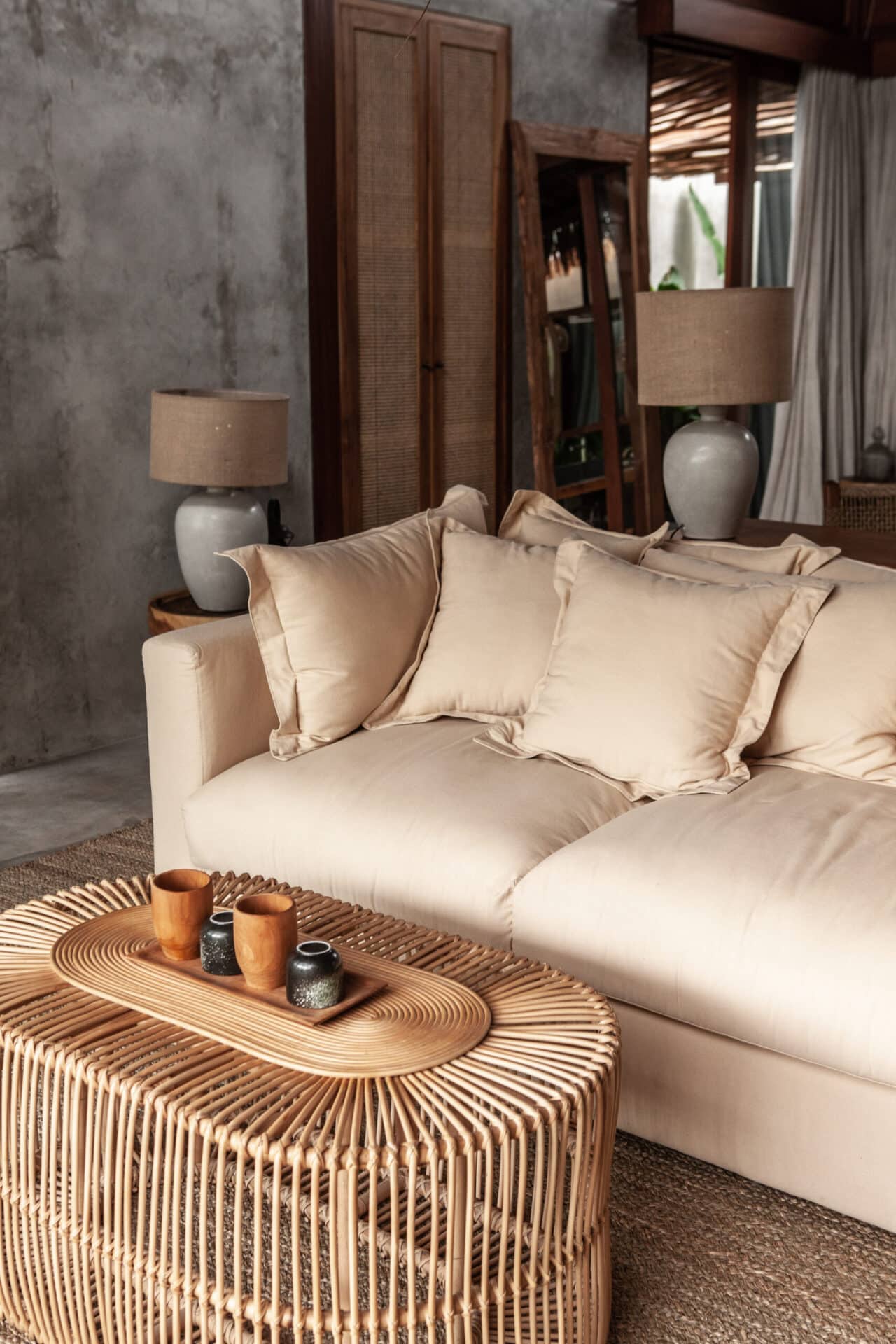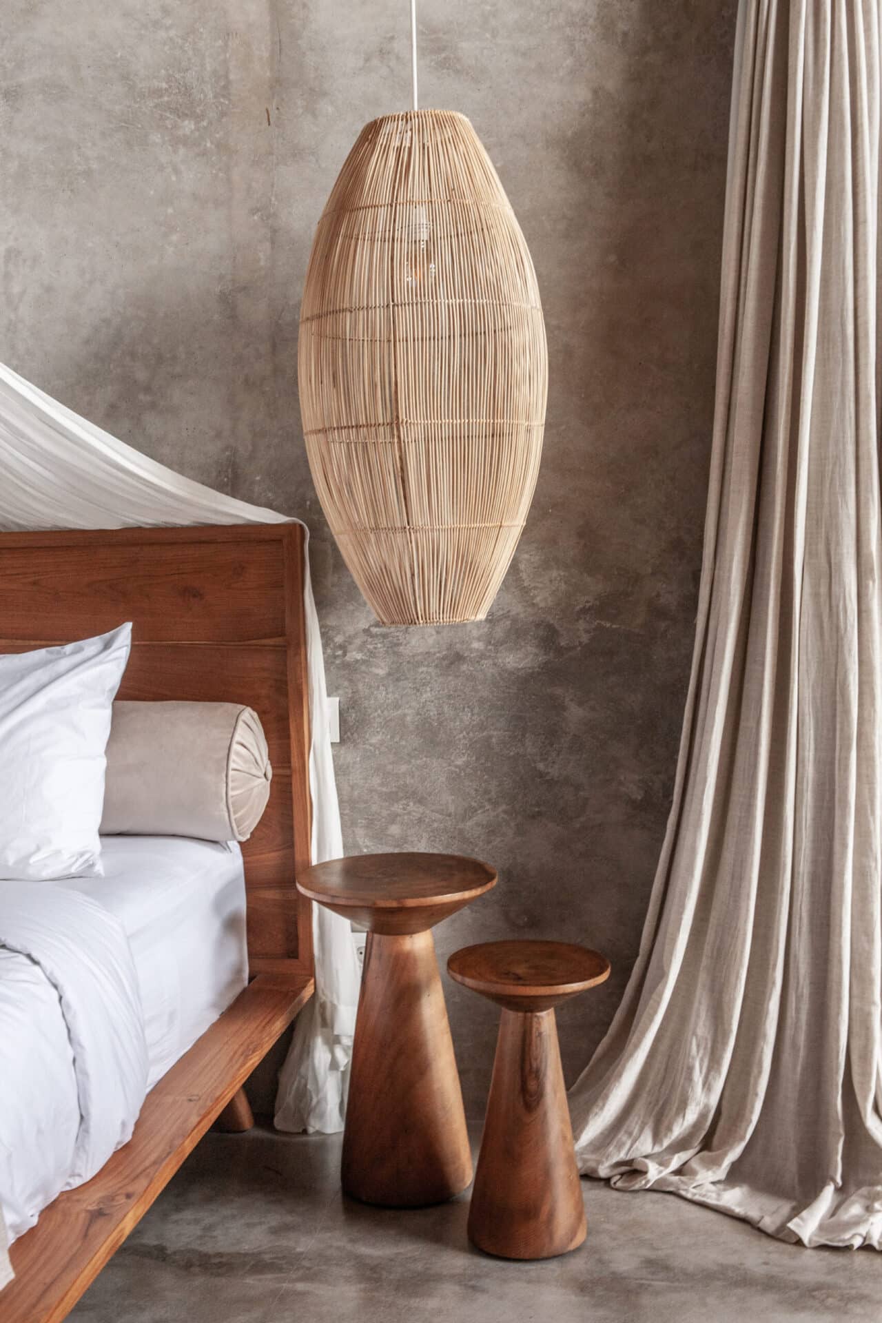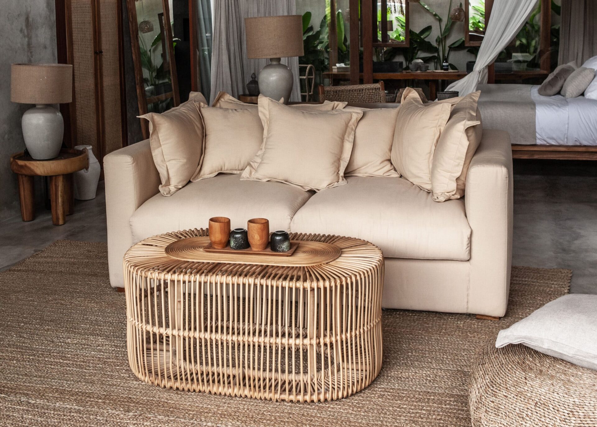 The interiors are intentionally calm and tactile. Flowing canopy drapes, neutral linen upholstery, and custom rattan furniture create an atmosphere of effortless comfort. Statement elements such as carved wall art panels, woven pendant lighting, and handcrafted coffee tables add depth and character without overwhelming the space. Every room is designed to feel open yet intimate, balancing structure with softness.