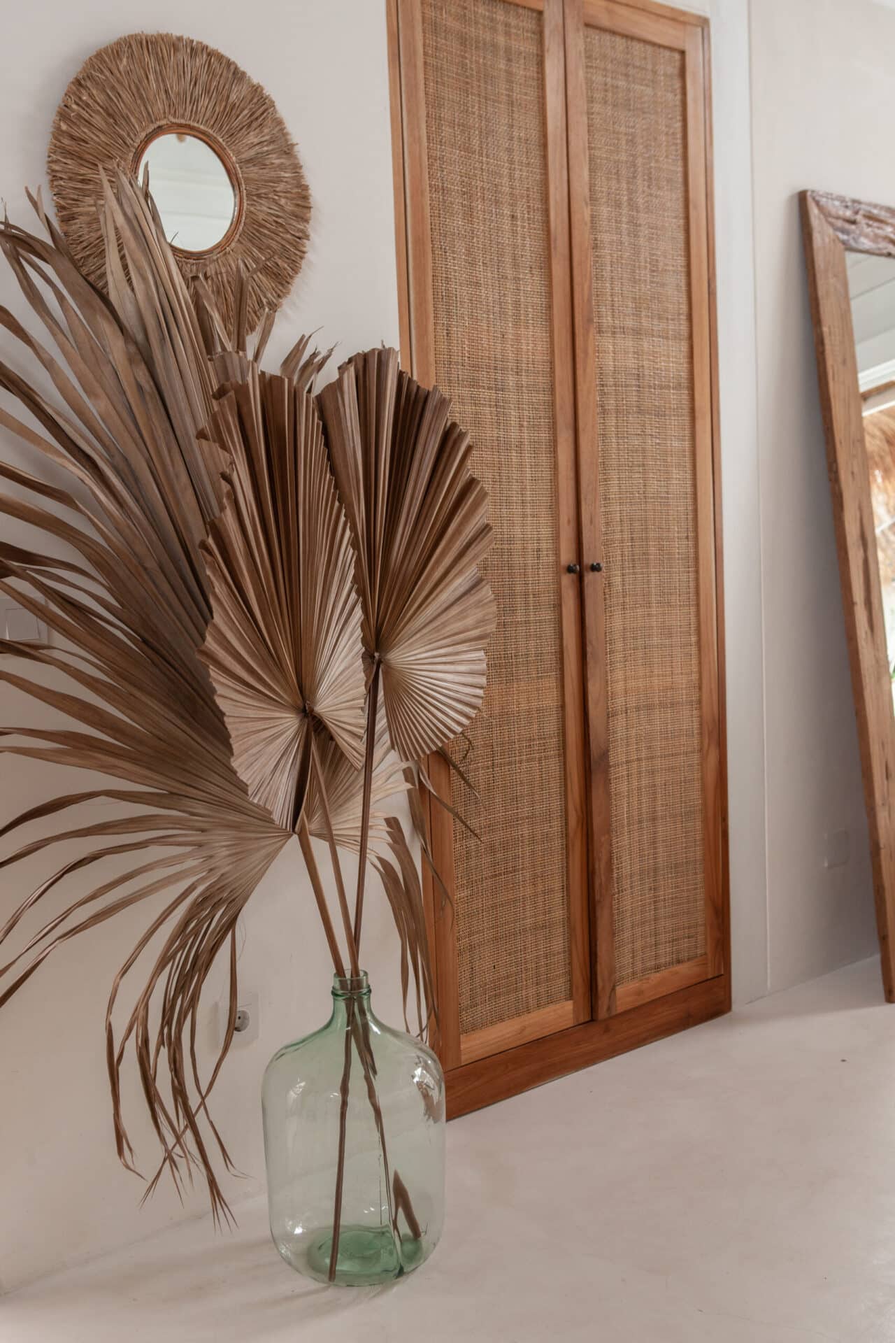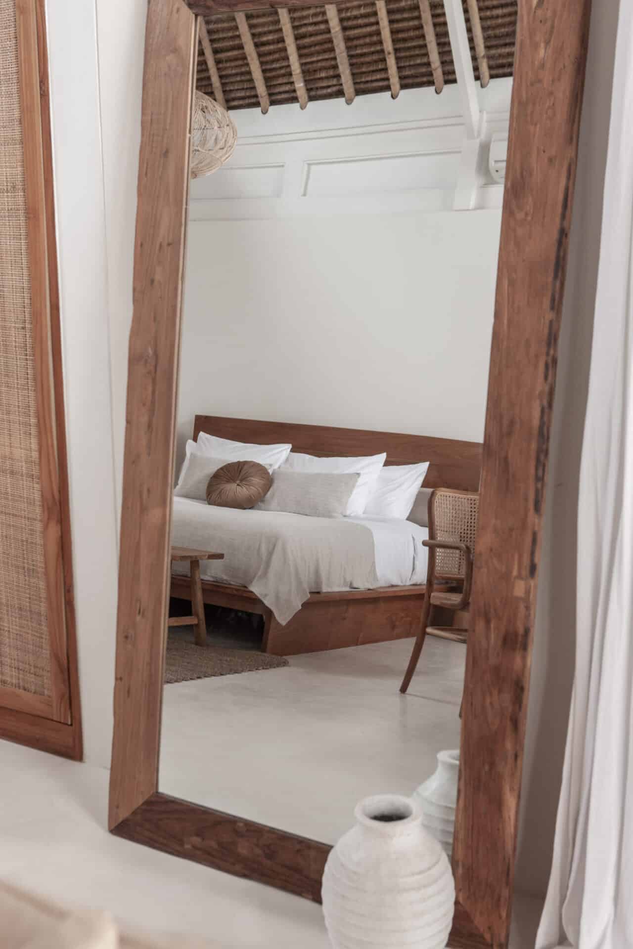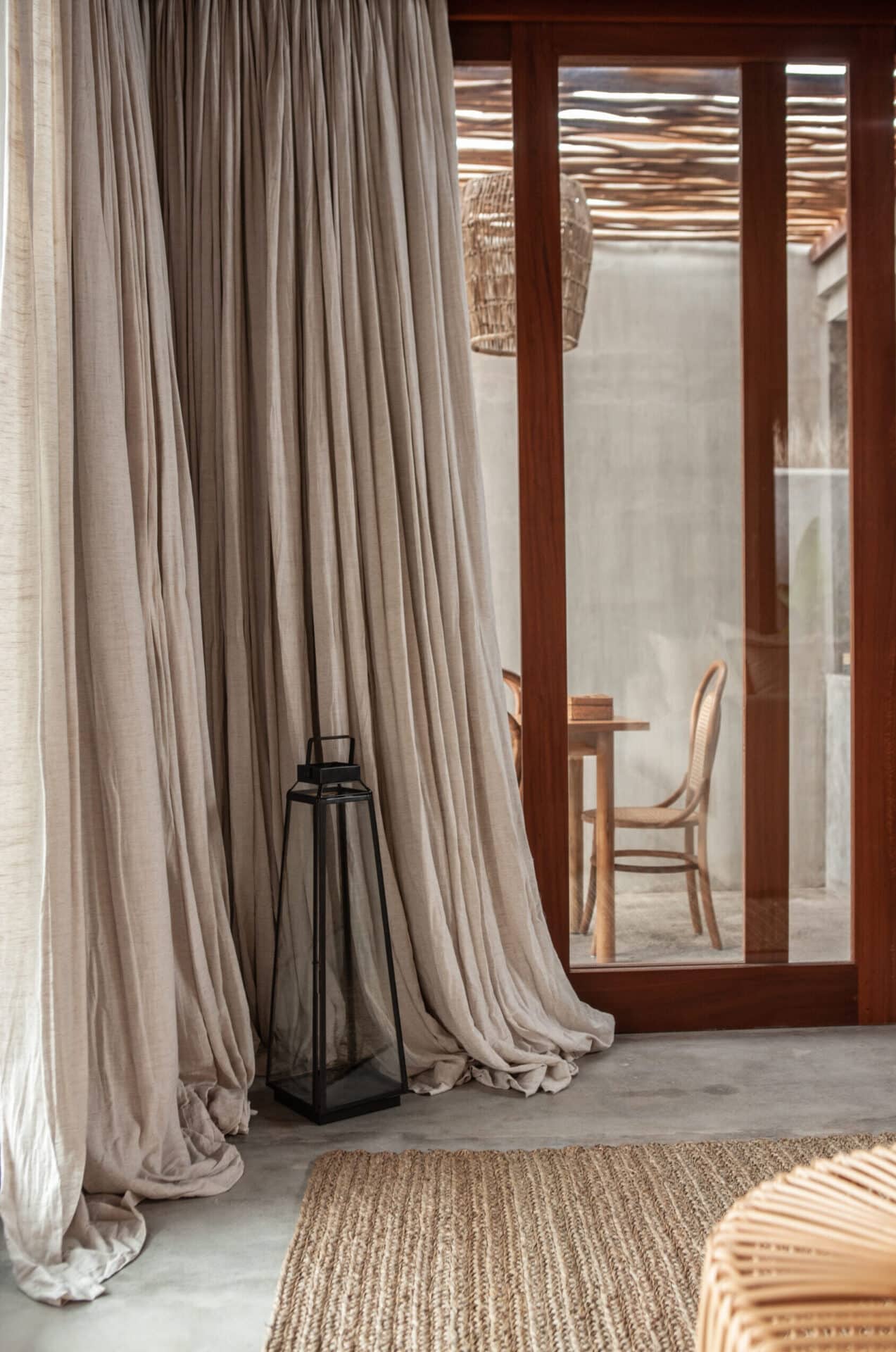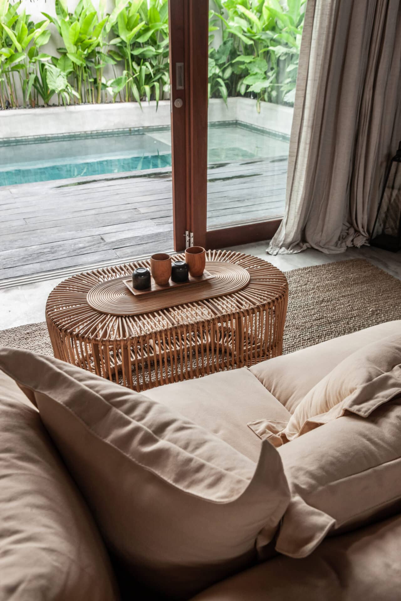 The interiors are intentionally calm and tactile. Flowing canopy drapes, neutral linen upholstery, and custom rattan furniture create an atmosphere of effortless comfort. Statement elements such as carved wall art panels, woven pendant lighting, and handcrafted coffee tables add depth and character without overwhelming the space. Every room is designed to feel open yet intimate, balancing structure with softness.