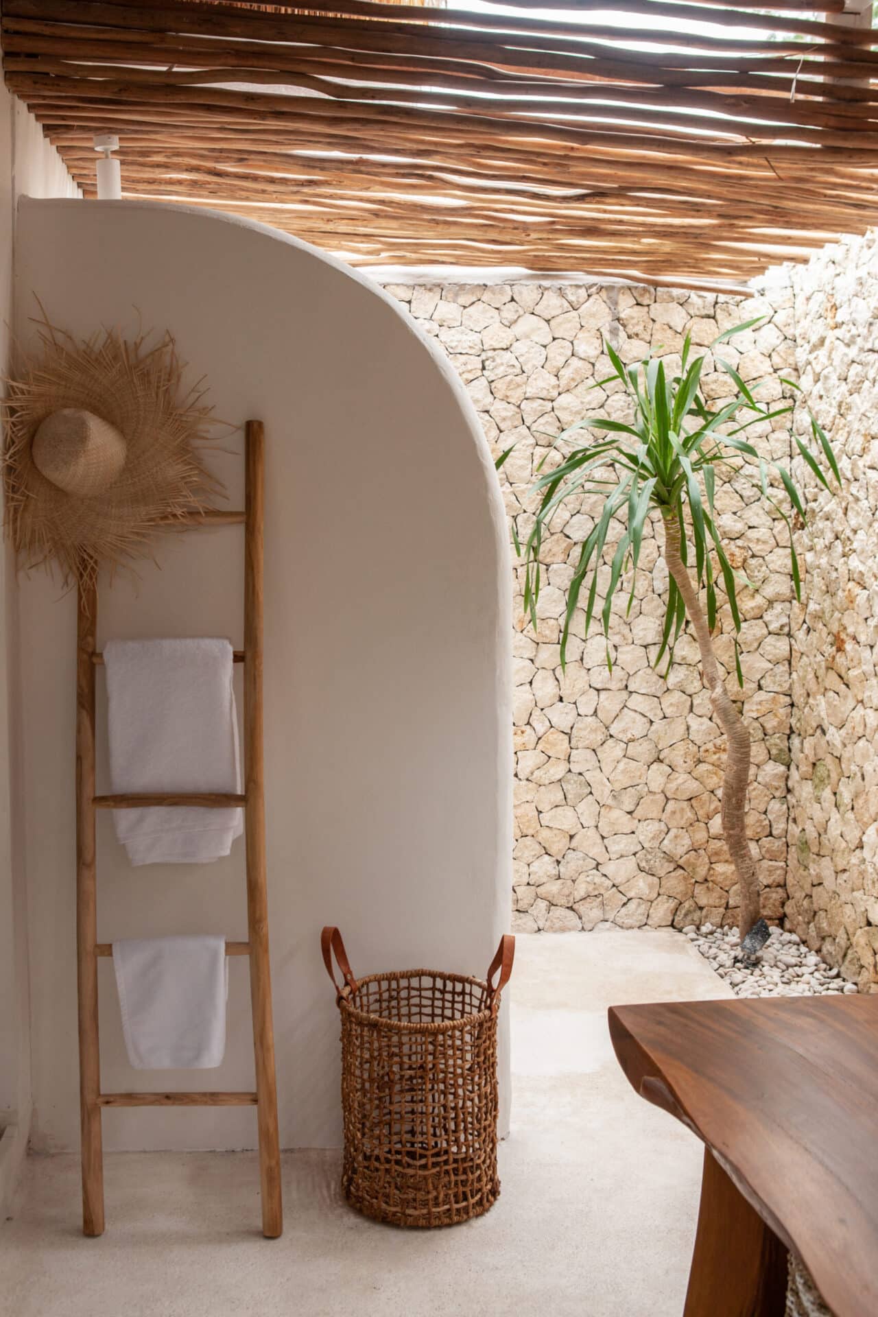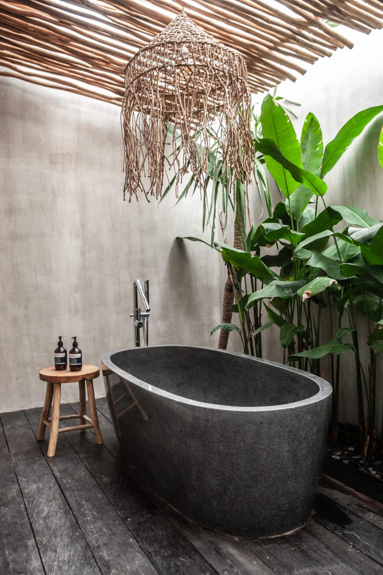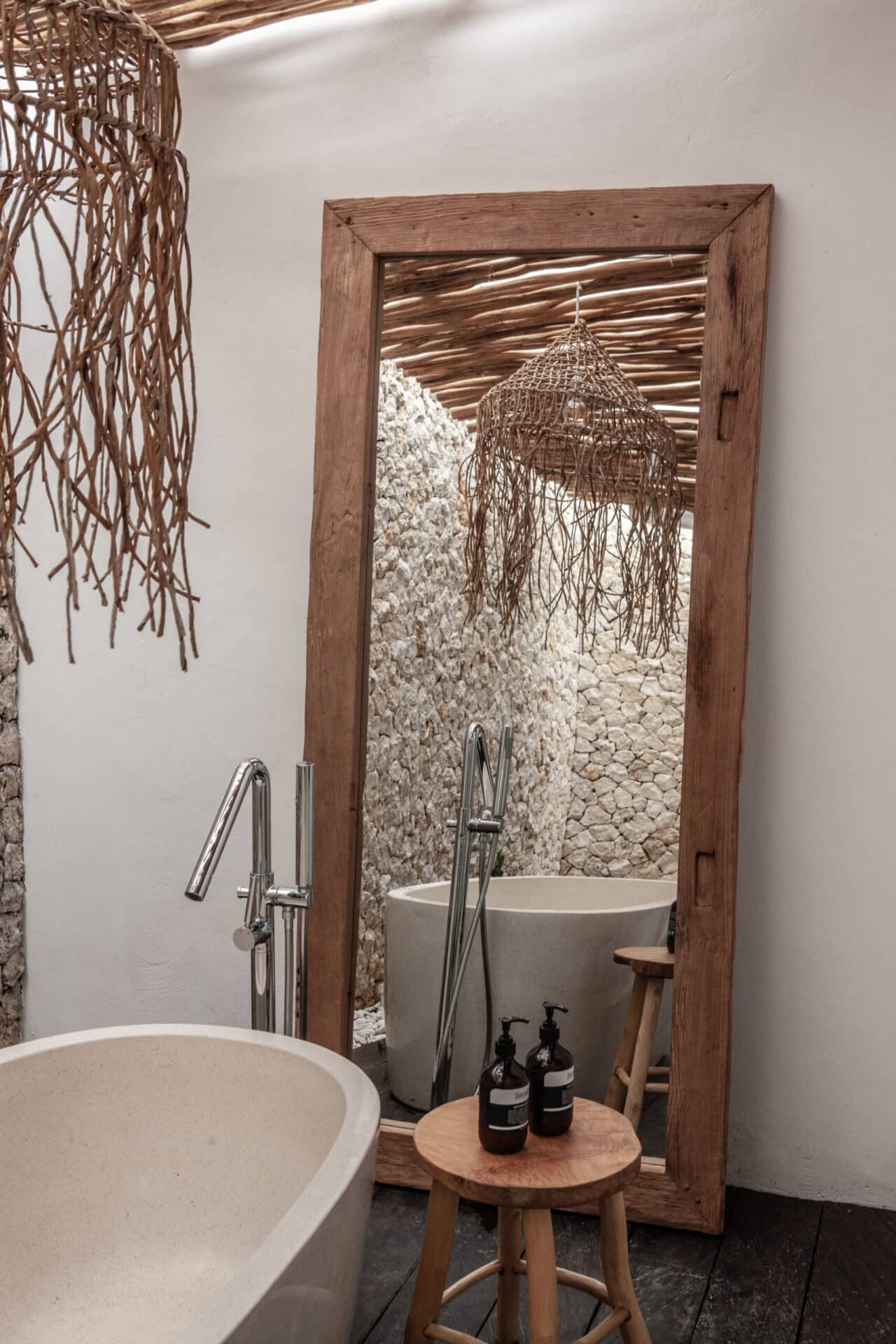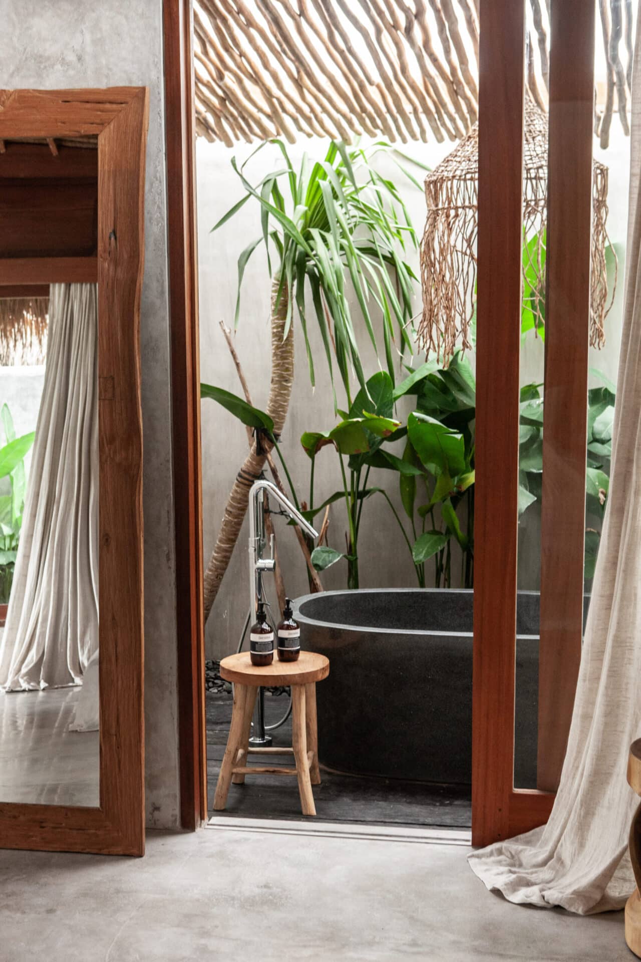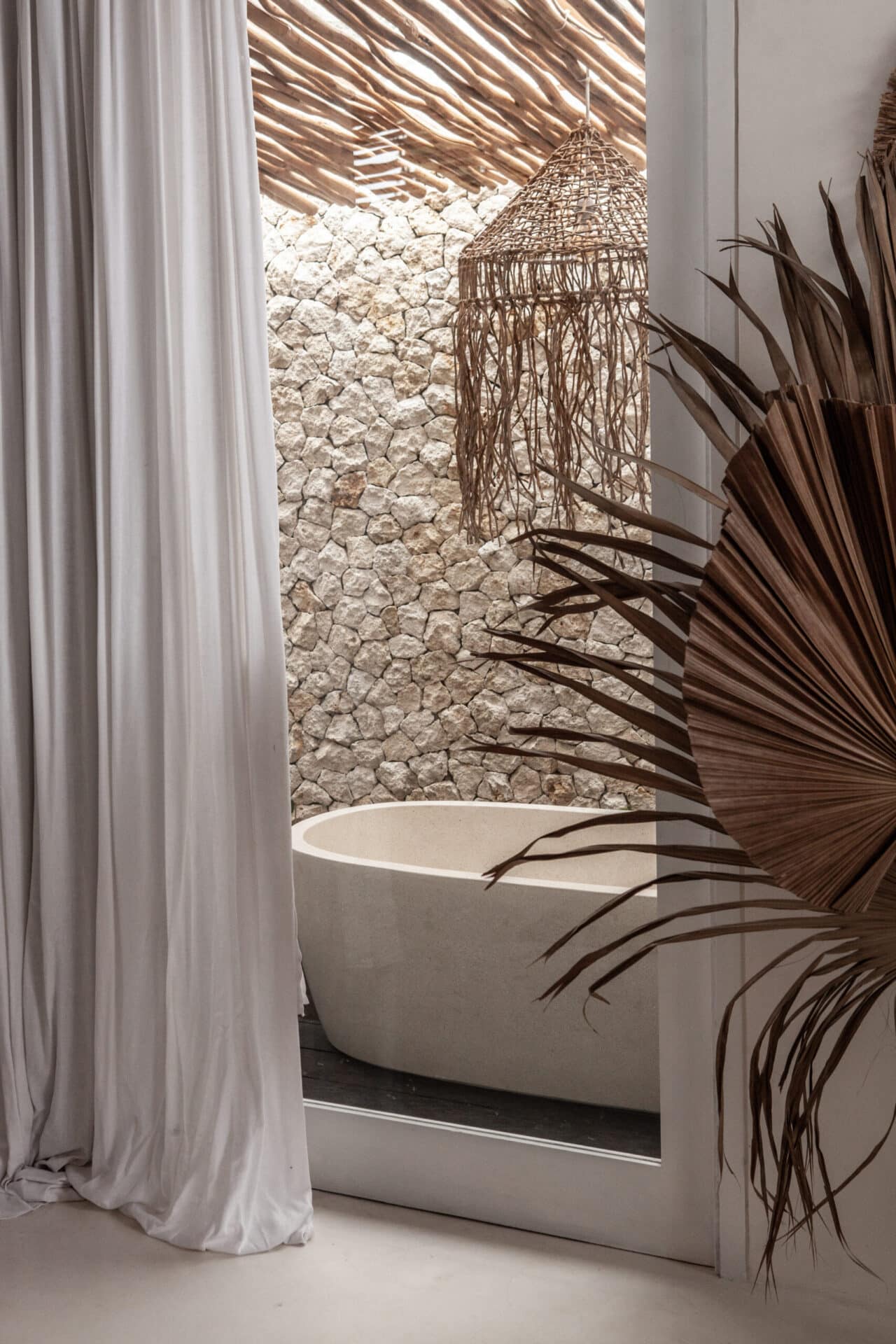 In the bathrooms and outdoor areas, the tropical concept continues through natural stone walls, freestanding bathtubs, timber decking, and lush greenery. The result is a cohesive Tropical Bohemian sanctuary that blends indoor and outdoor living seamlessly, offering a serene escape shaped by texture, light, and handcrafted detail.