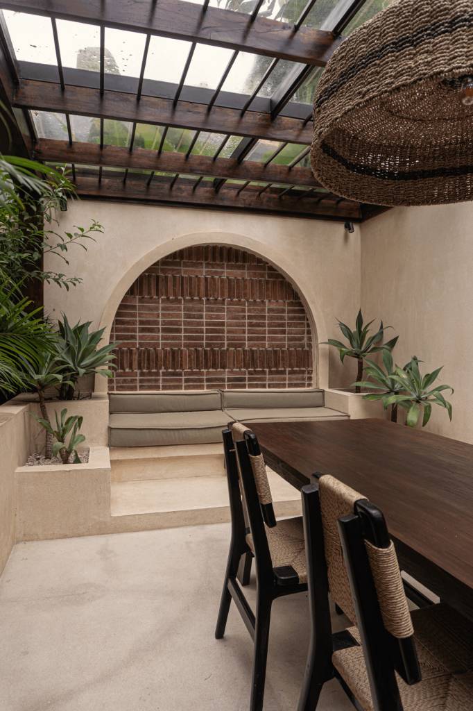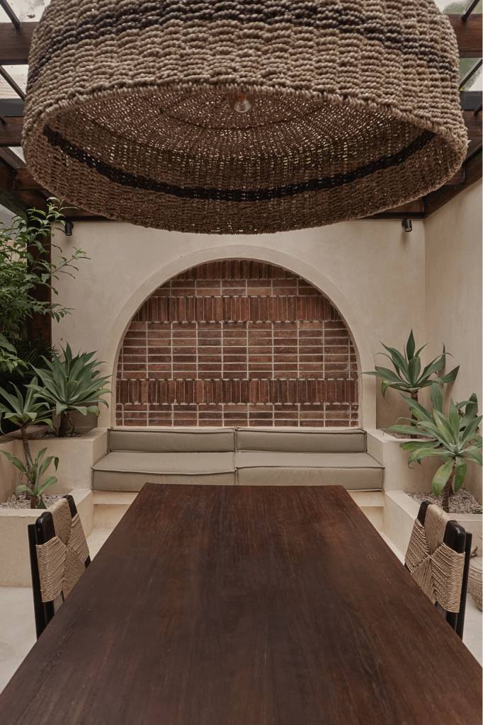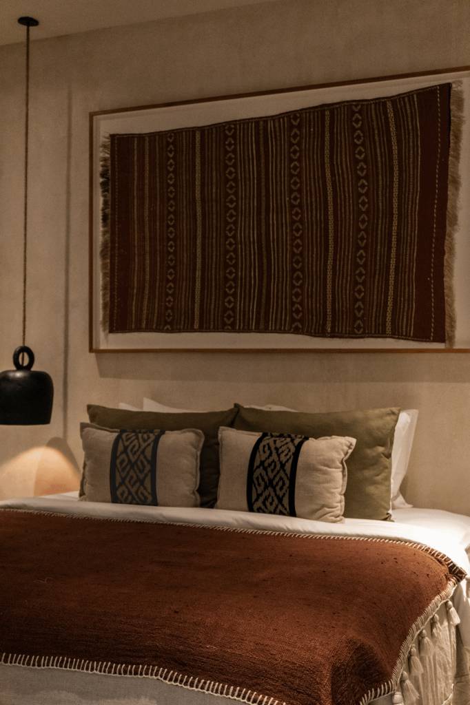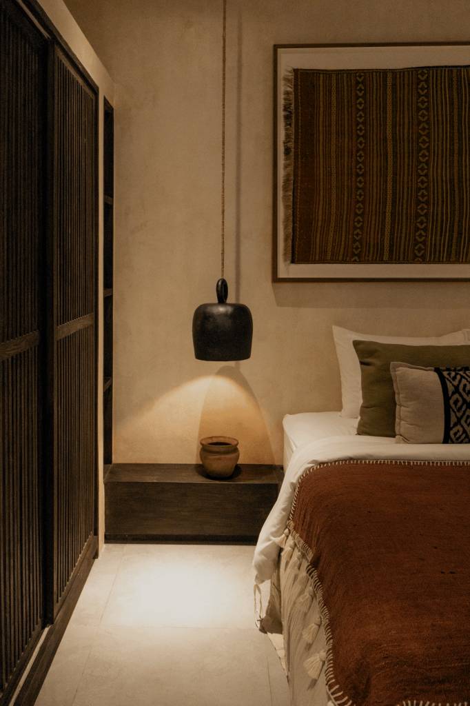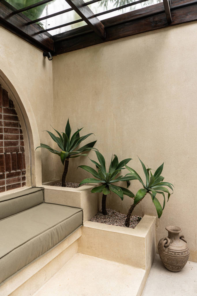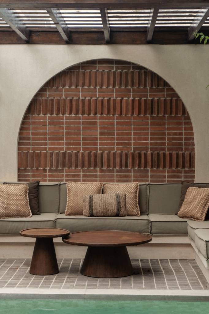 The design draws inspiration from arid landscapes and traditional craftsmanship, translated into a contemporary tropical context. Soft plastered walls, brick inlay details, warm timber surfaces, and woven textiles create an atmosphere that feels grounded yet refined. Every element was selected to evoke stillness.