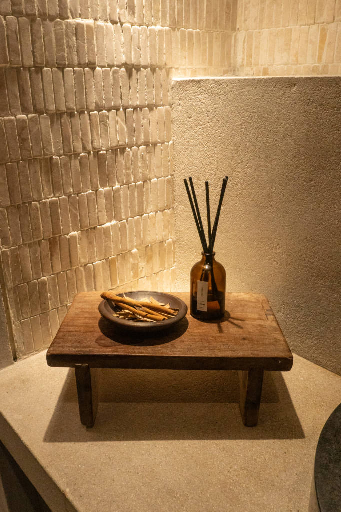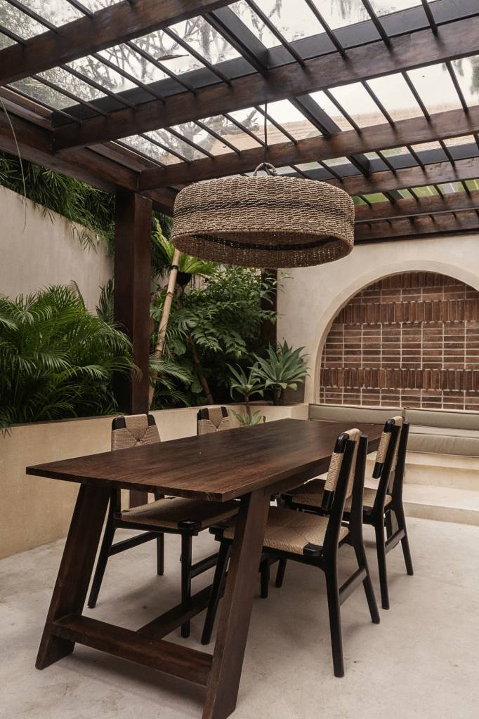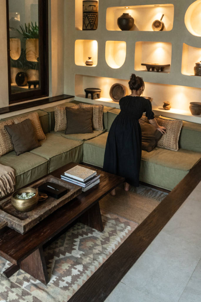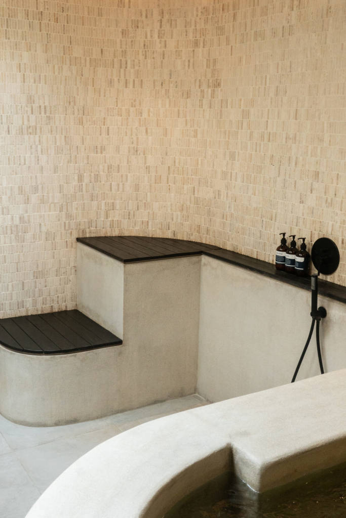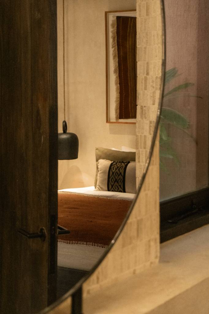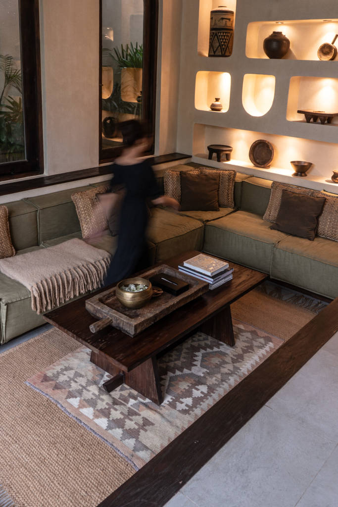 The design draws inspiration from arid landscapes and traditional craftsmanship, translated into a contemporary tropical context. Soft plastered walls, brick inlay details, warm timber surfaces, and woven textiles create an atmosphere that feels grounded yet refined. Every element was selected to evoke stillness.
