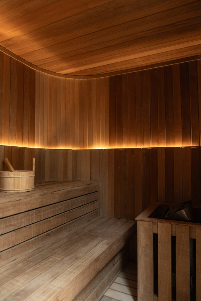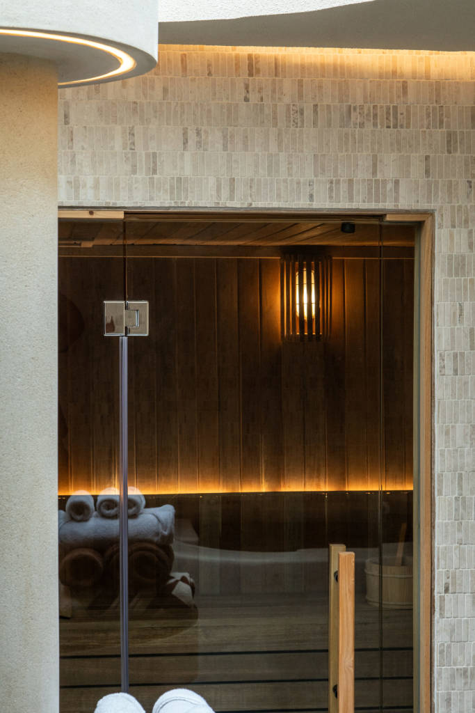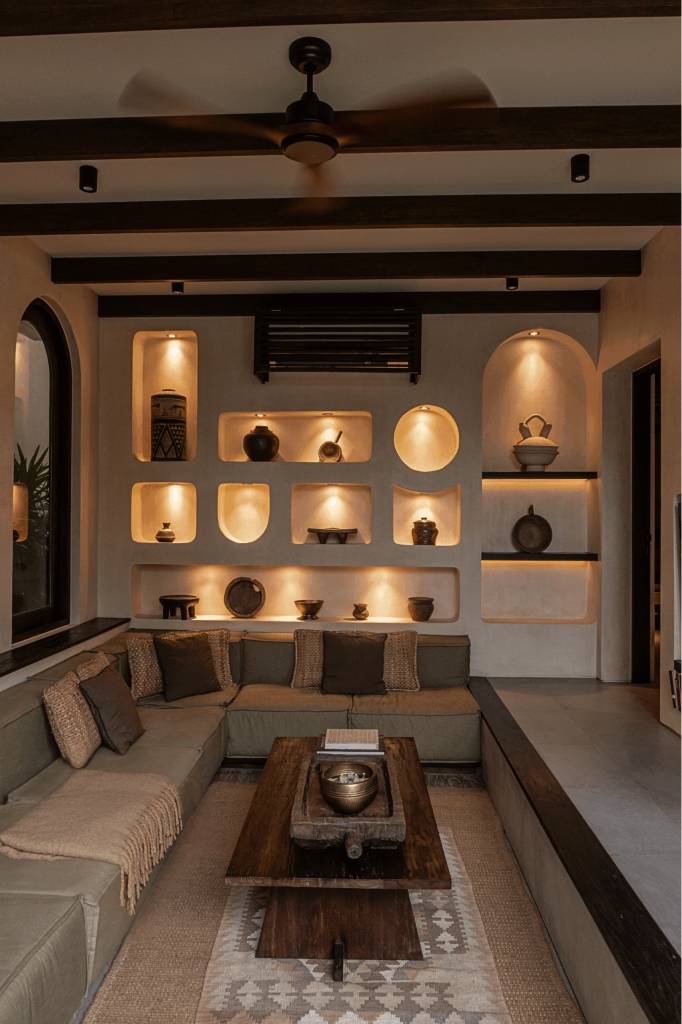 From the sculpted wall niches with integrated lighting to the curved brick arch framing the lounge, Bedouin I celebrates architectural form as both structure and art. The palette remains restrained — sand, clay, charcoal, muted greens.