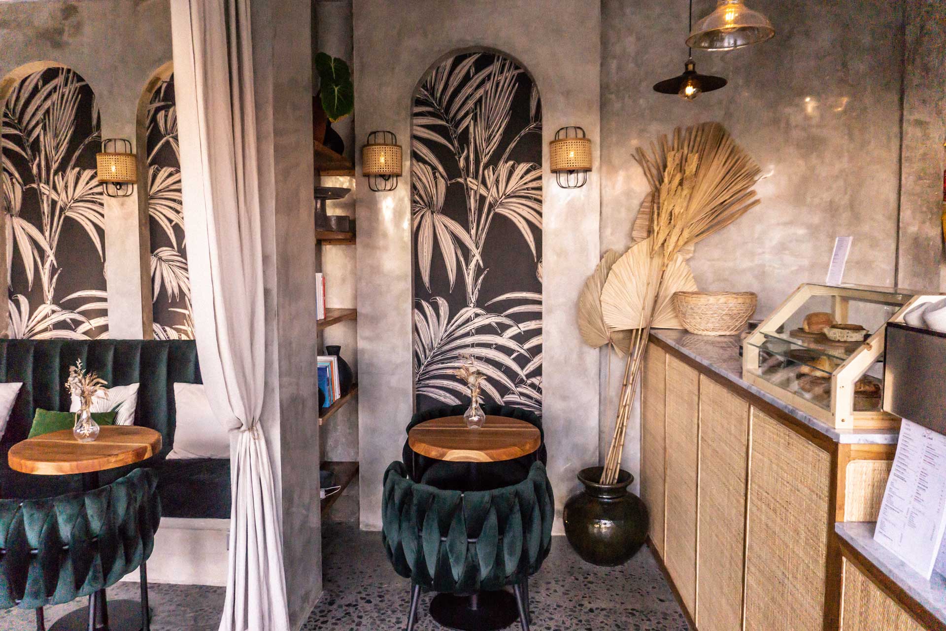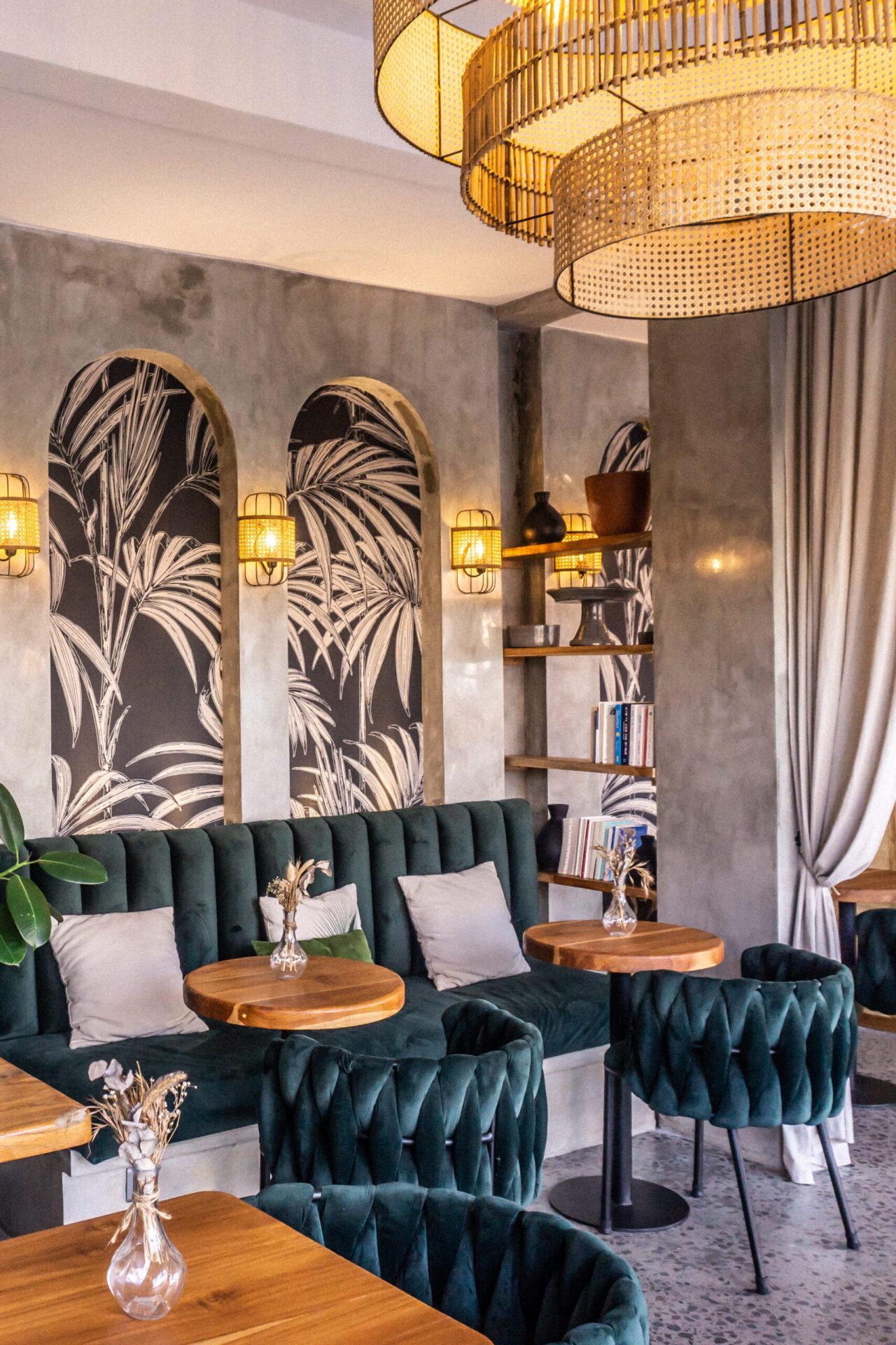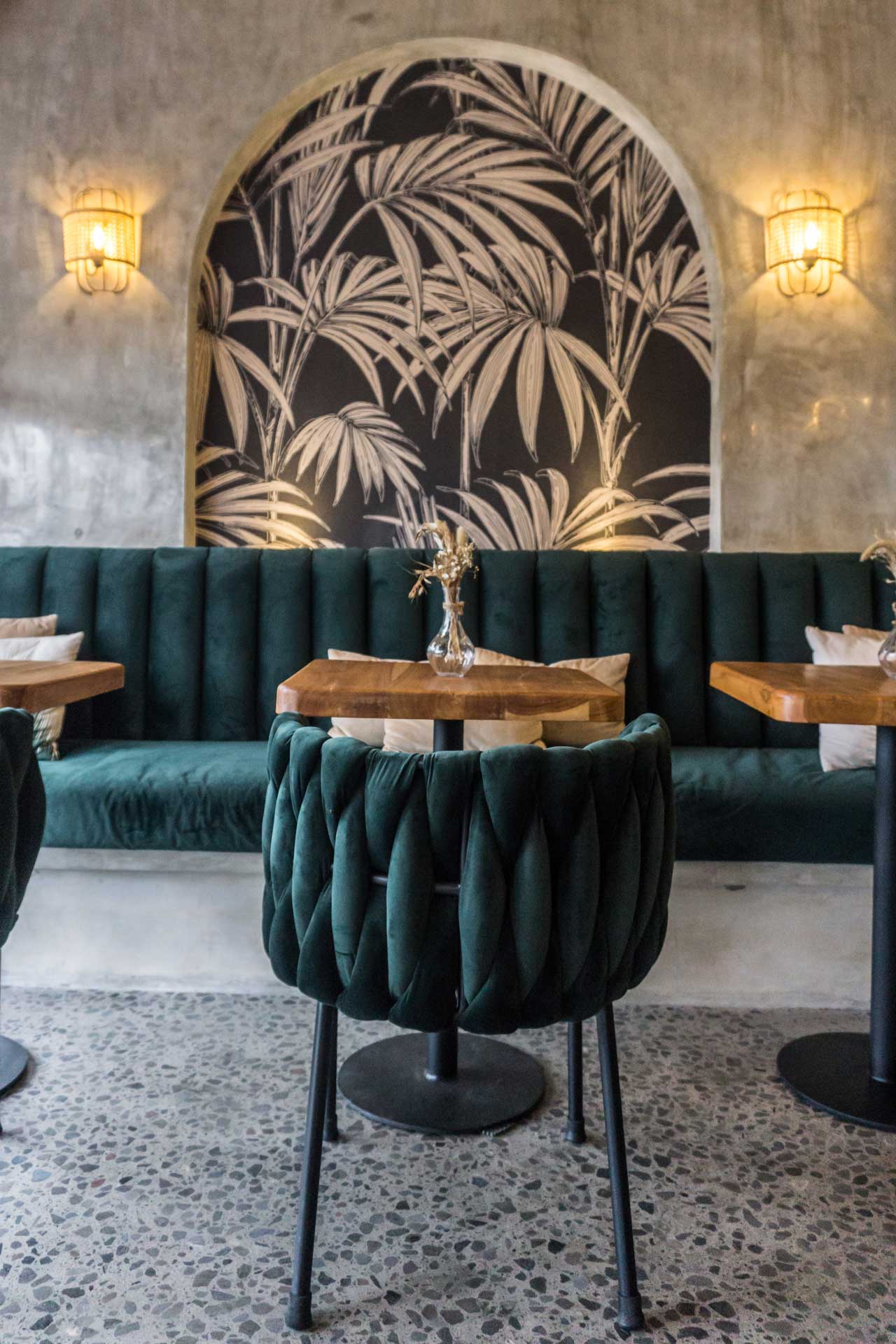 The design language is grounded in contrast. Deep emerald velvet seating introduces depth and elegance, while solid timber tabletops add warmth and natural character. Arched wall niches filled with graphic botanical artwork become strong visual anchors, giving the café a distinctive identity without overwhelming the space. Subtle terrazzo flooring enhances the urban sensibility, adding texture underfoot while keeping the palette cohesive and neutral.