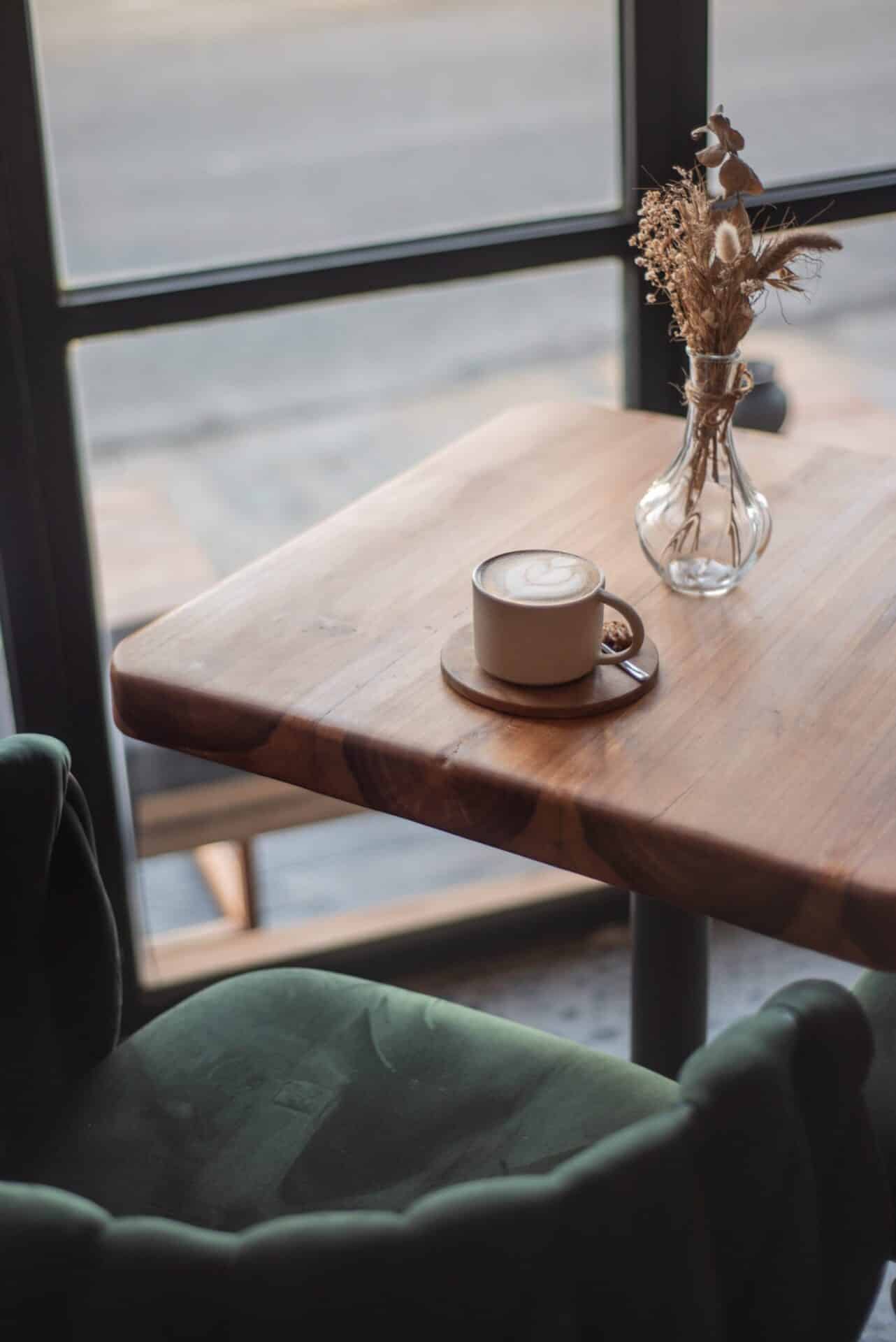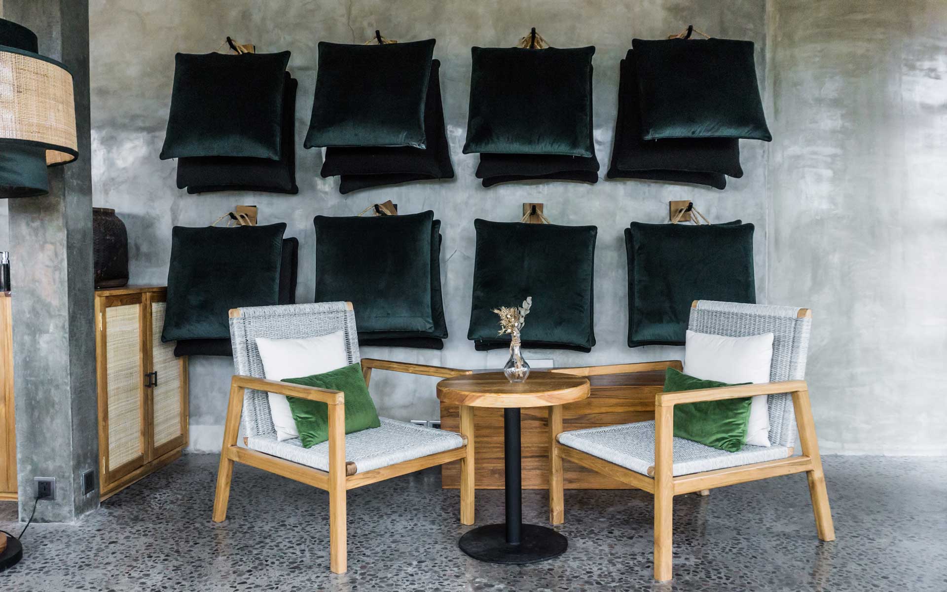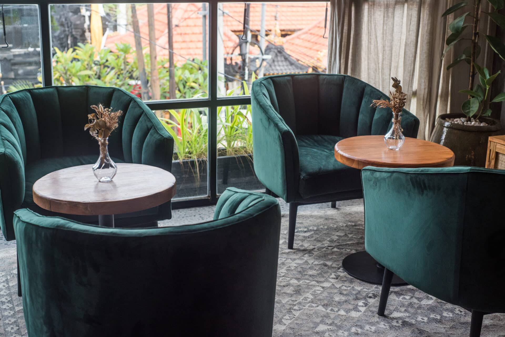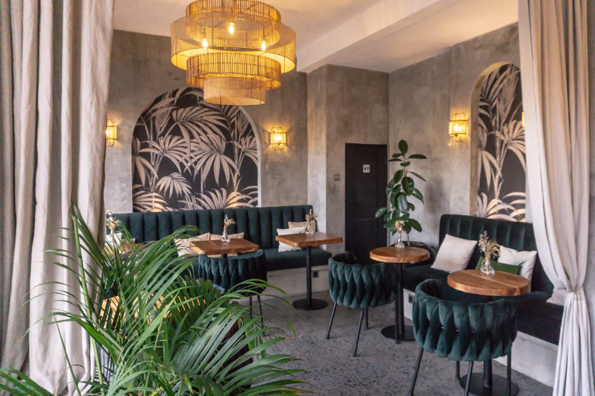The design language is grounded in contrast. Deep emerald velvet seating introduces depth and elegance, while solid timber tabletops add warmth and natural character. Arched wall niches filled with graphic botanical artwork become strong visual anchors, giving the café a distinctive identity without overwhelming the space. Subtle terrazzo flooring enhances the urban sensibility, adding texture underfoot while keeping the palette cohesive and neutral.