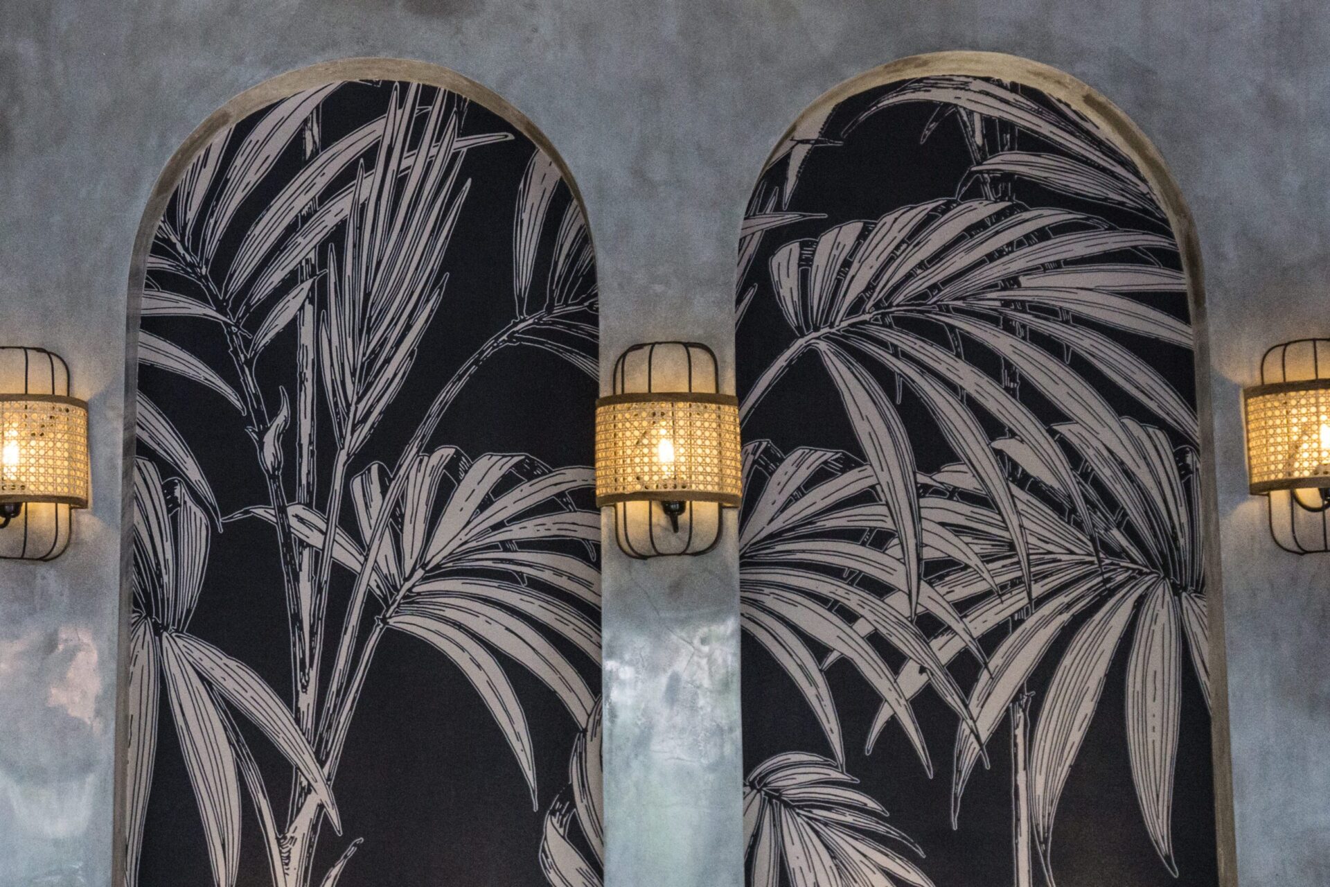 Layered lighting plays a central role in shaping the mood. Rattan chandeliers and framed wall fixtures cast a warm glow against raw plaster walls, balancing industrial undertones with softness. Built in shelving, curated decor, and a streamlined coffee bar reinforce functionality while maintaining a clean visual flow.
