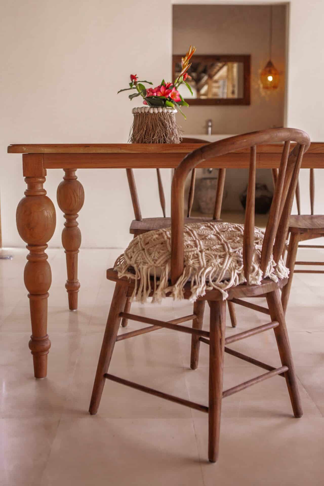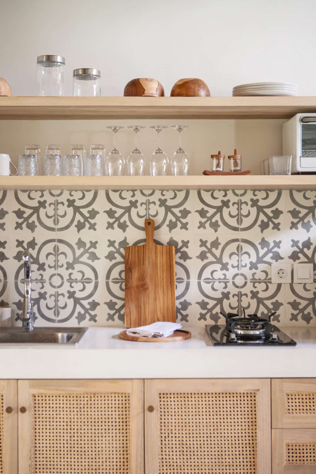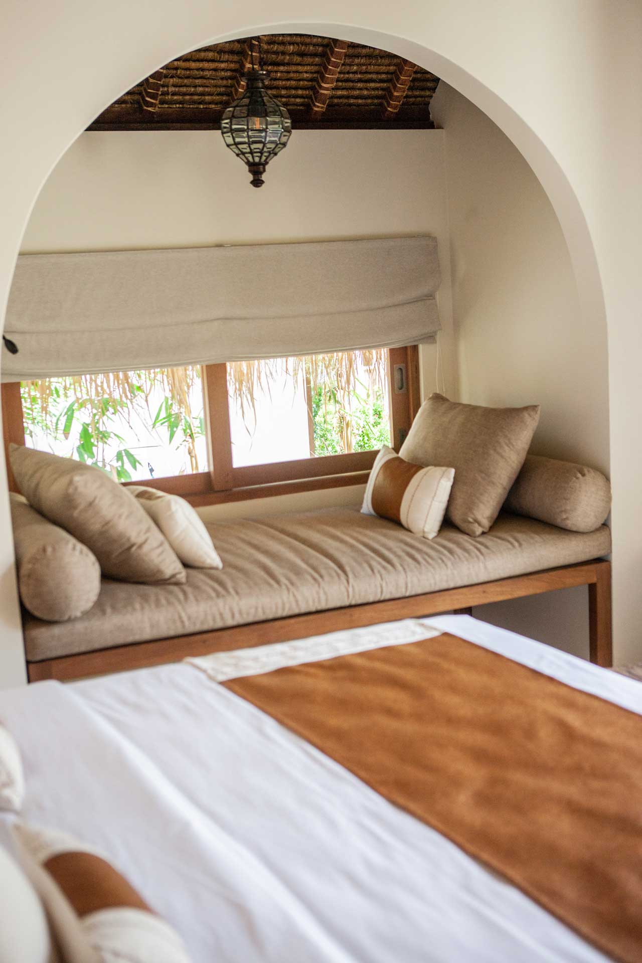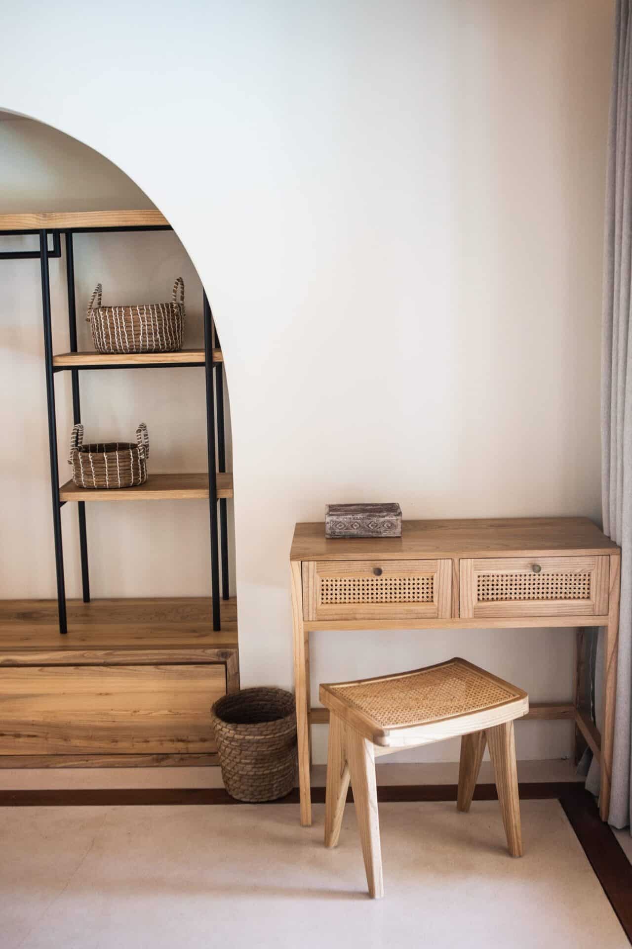 The interiors celebrate craftsmanship and raw materials. Solid wood tables, rattan cabinetry, carved details, and patterned tiles introduce depth and authenticity, while open shelving and curated objects add personality without clutter. In the bedrooms, neutral tones and layered fabrics soften the space, allowing natural light and texture to take center stage. Every corner feels intentional yet relaxed, as if it has evolved naturally over time.