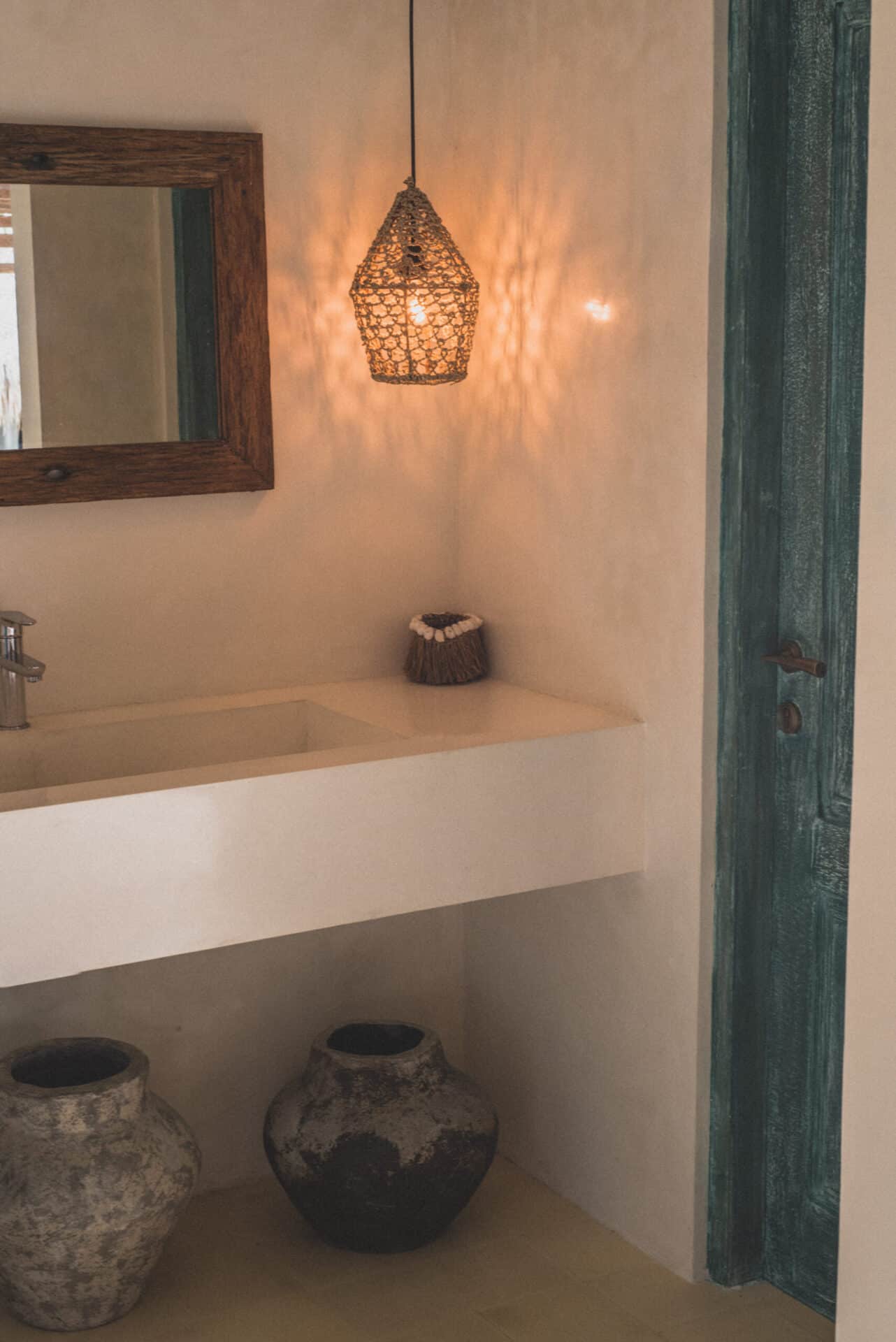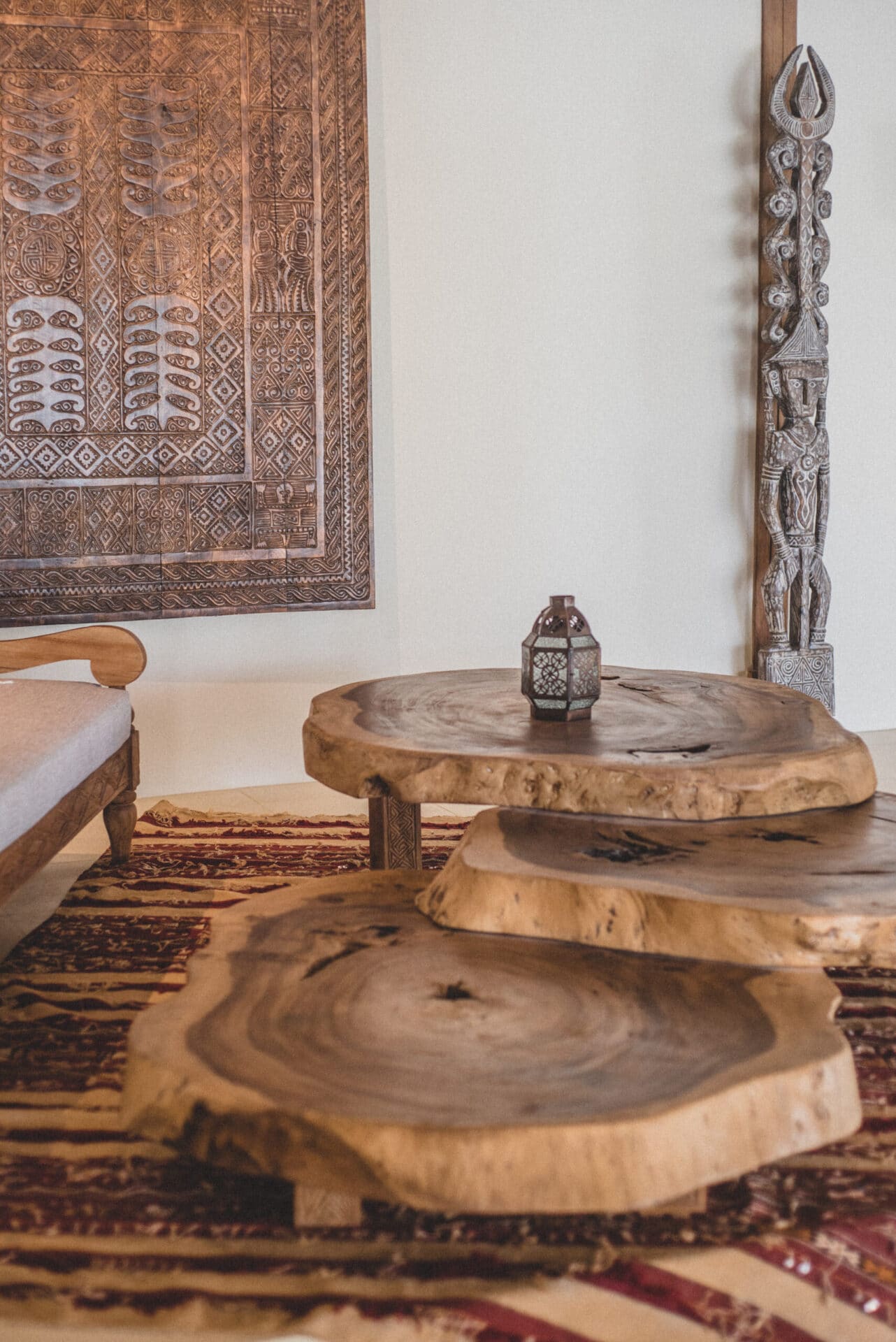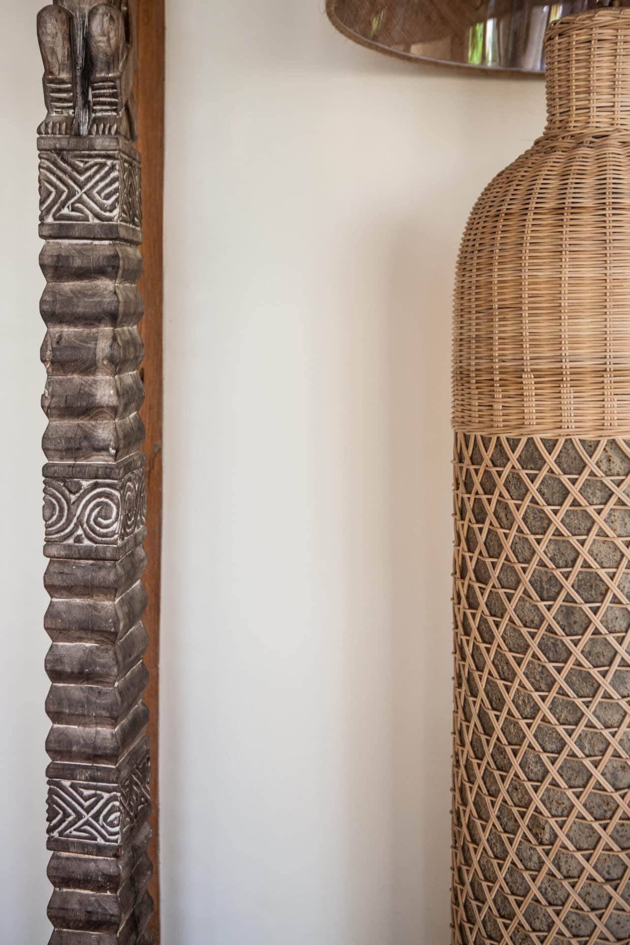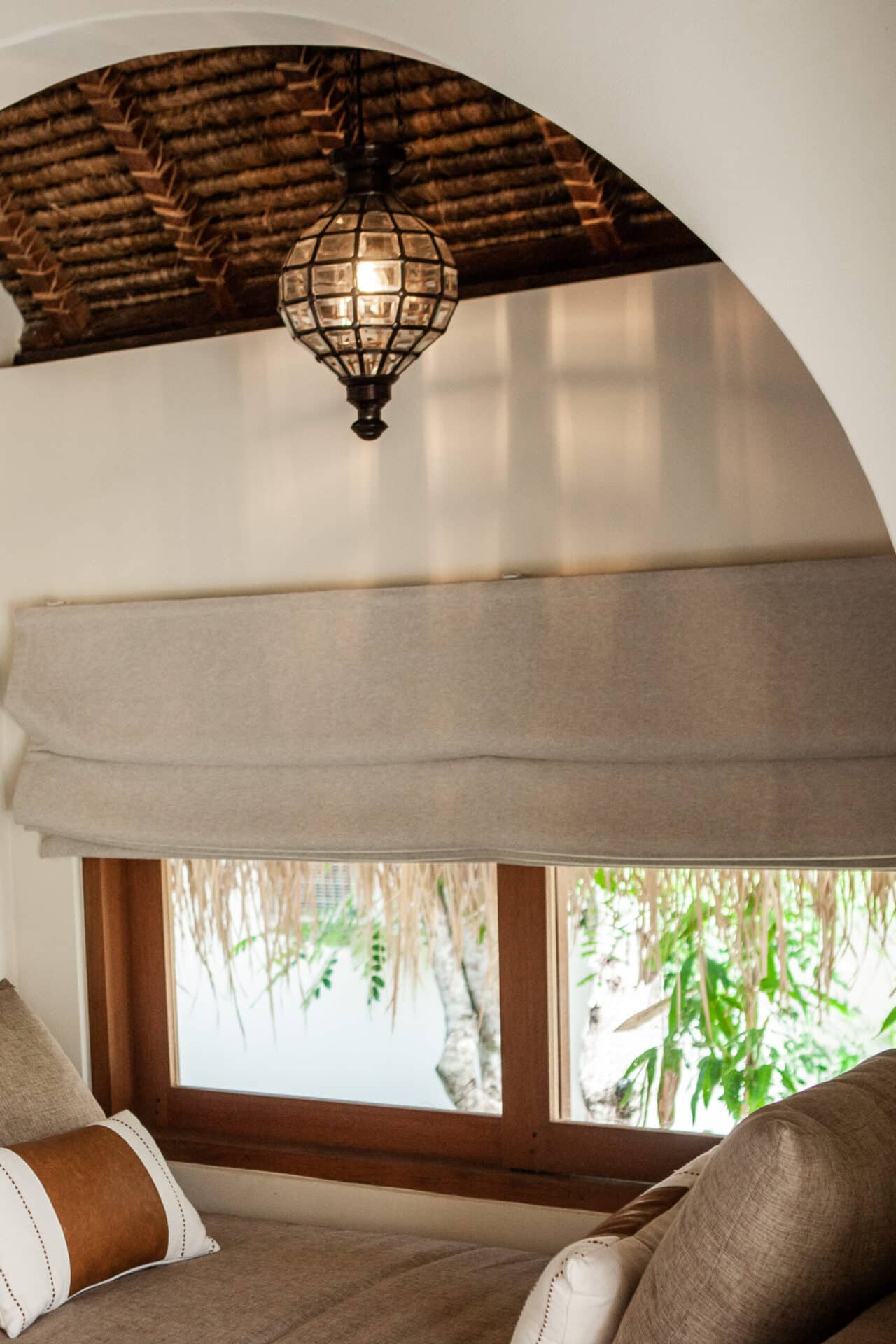 The interiors celebrate craftsmanship and raw materials. Solid wood tables, rattan cabinetry, carved details, and patterned tiles introduce depth and authenticity, while open shelving and curated objects add personality without clutter. In the bedrooms, neutral tones and layered fabrics soften the space, allowing natural light and texture to take center stage. Every corner feels intentional yet relaxed, as if it has evolved naturally over time.