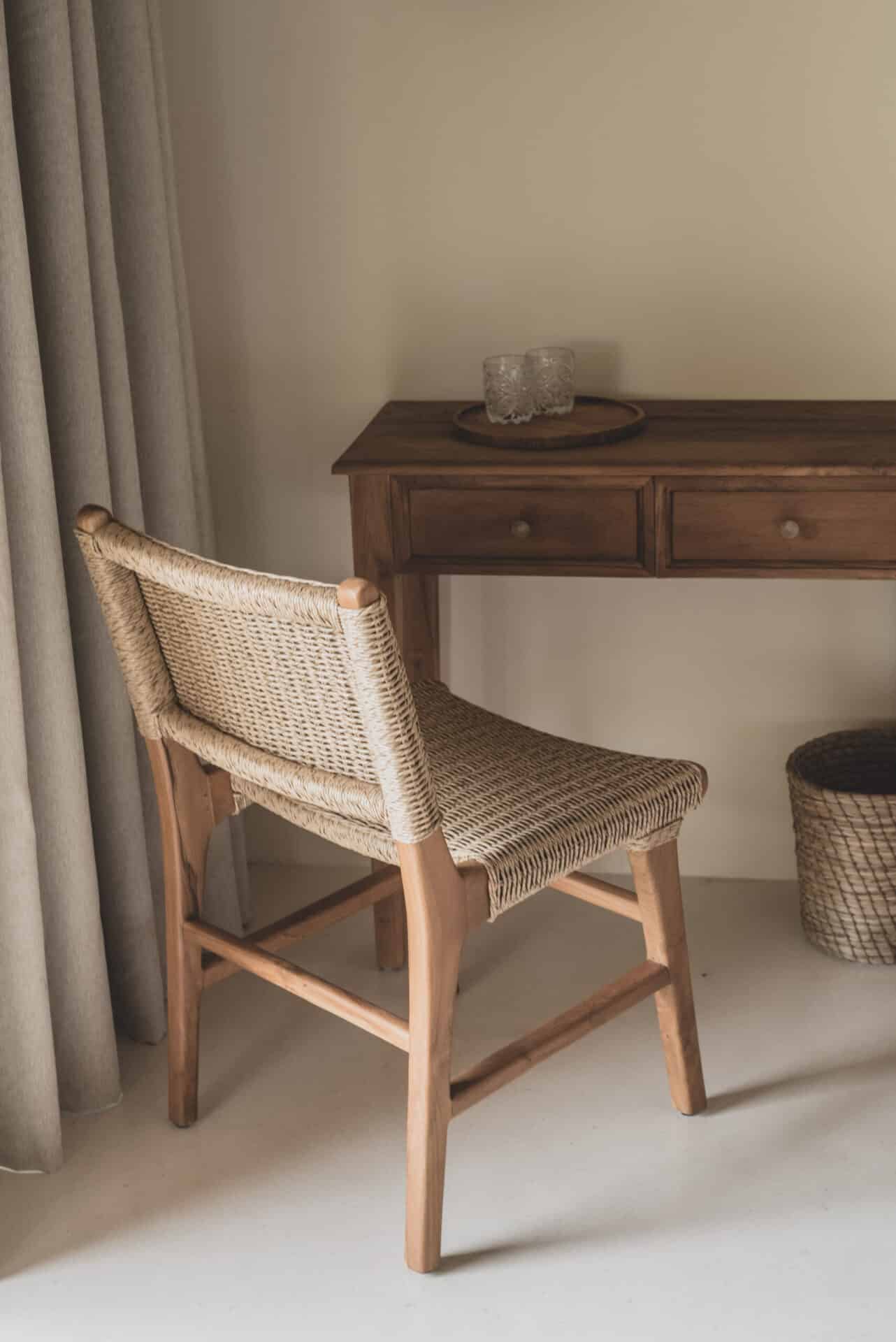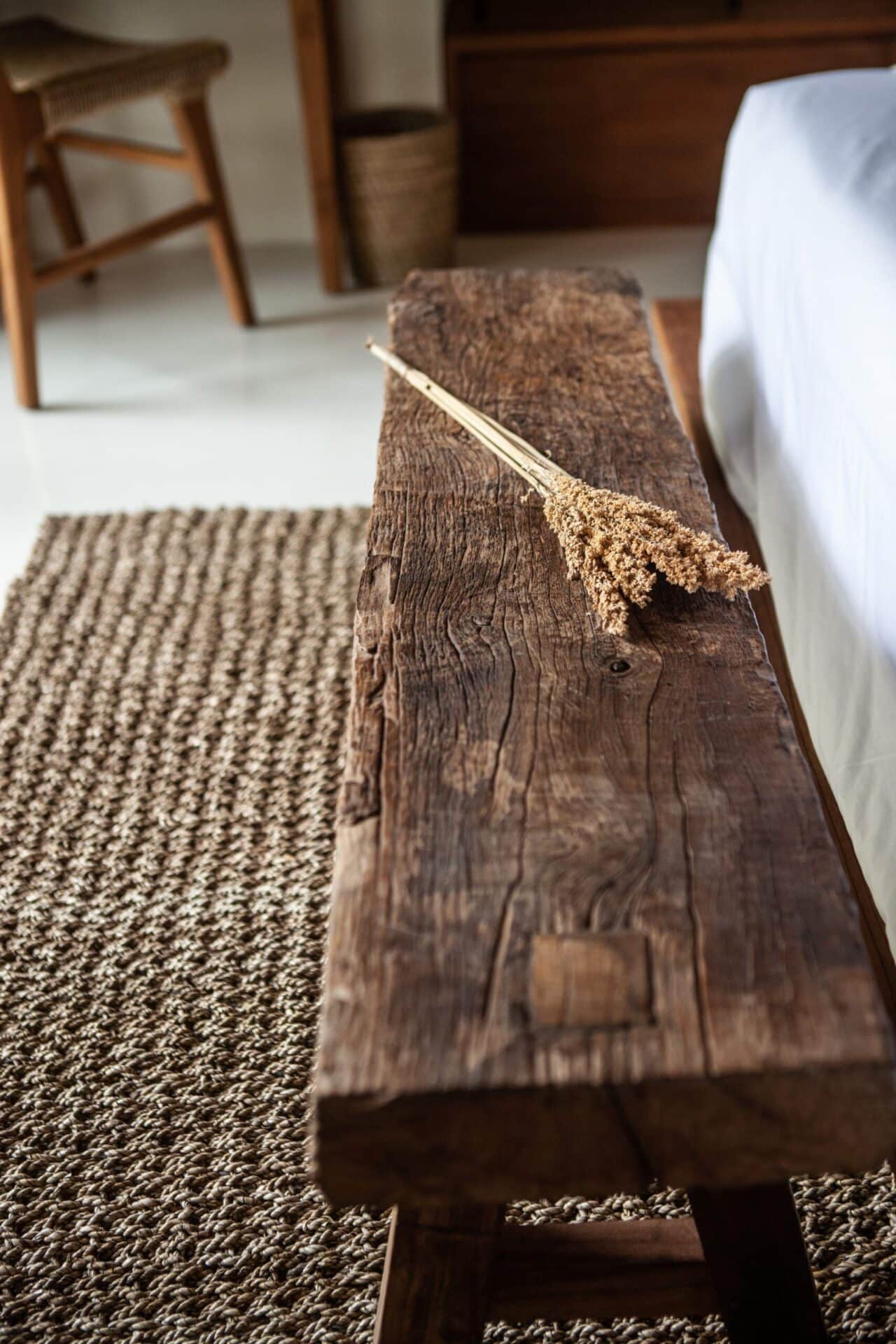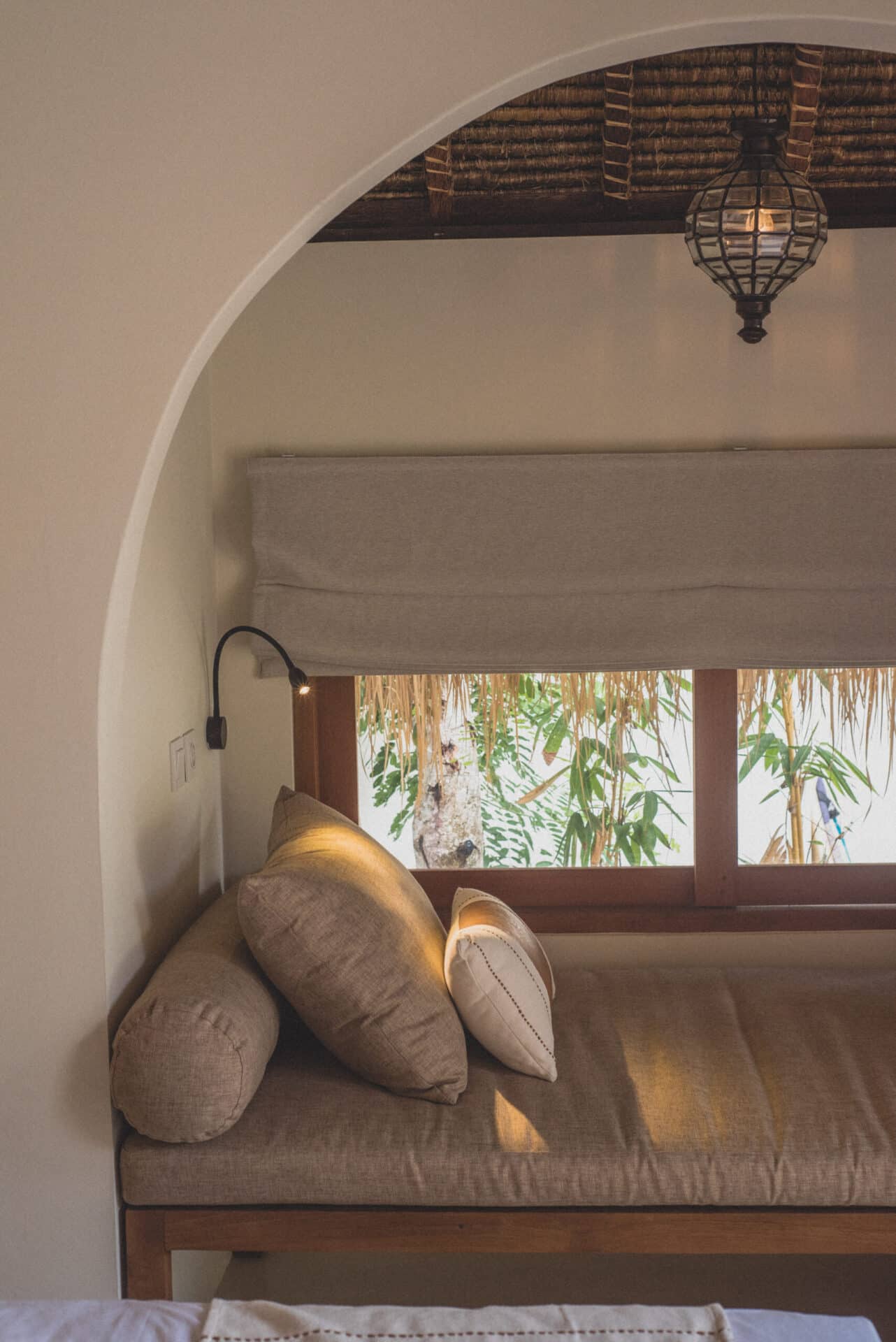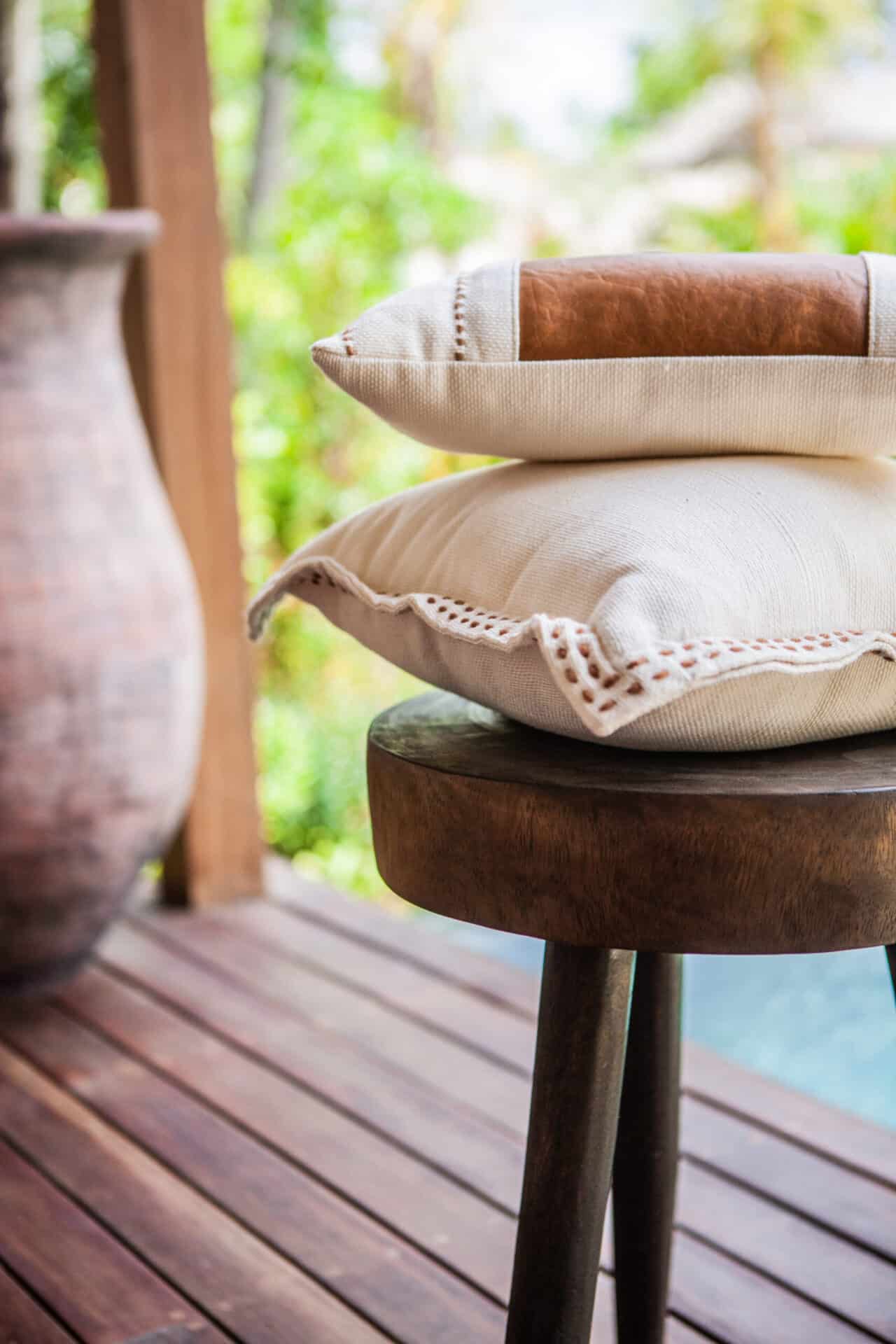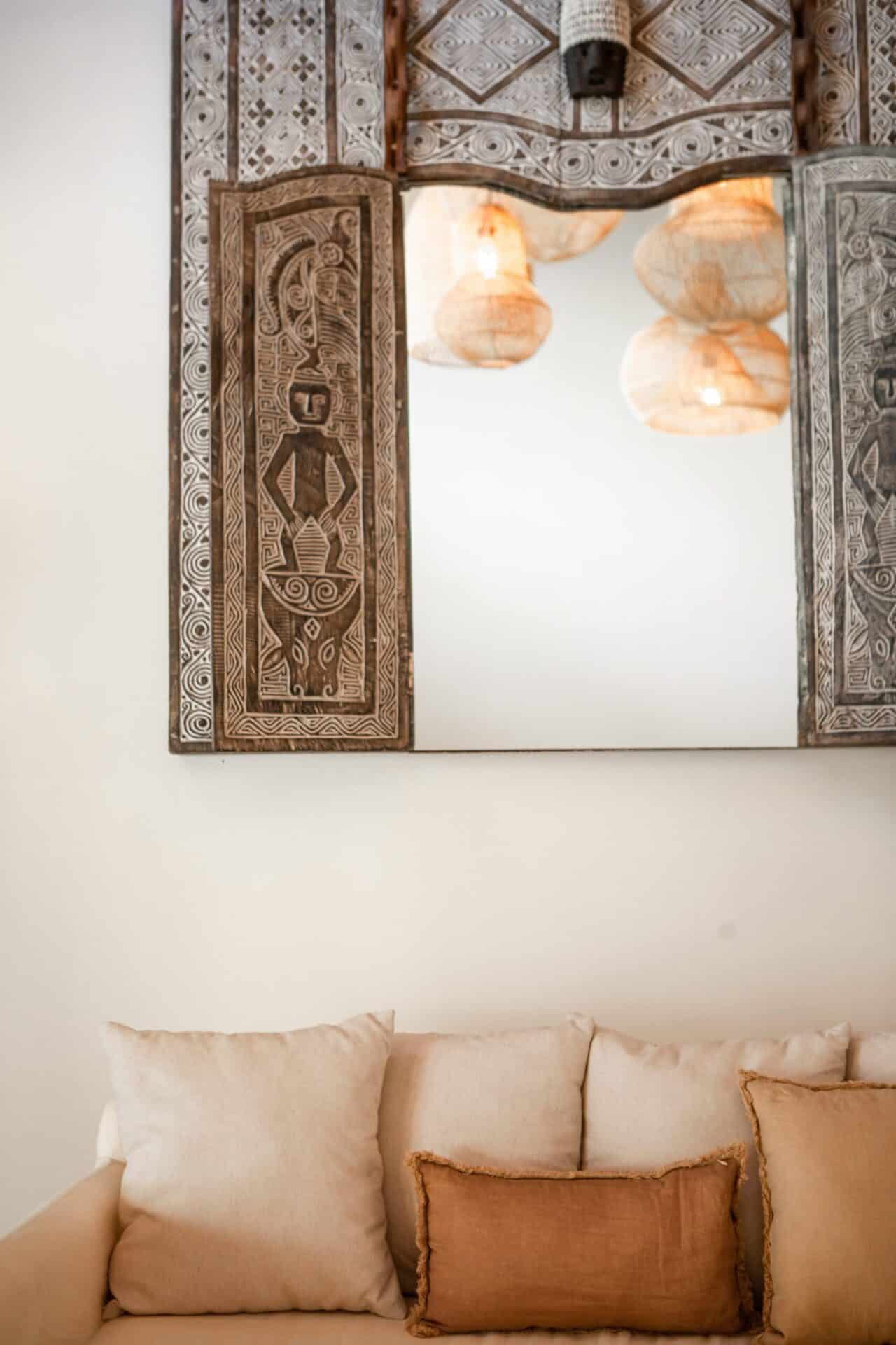 The interiors celebrate craftsmanship and raw materials. Solid wood tables, rattan cabinetry, carved details, and patterned tiles introduce depth and authenticity, while open shelving and curated objects add personality without clutter. In the bedrooms, neutral tones and layered fabrics soften the space, allowing natural light and texture to take center stage. Every corner feels intentional yet relaxed, as if it has evolved naturally over time.