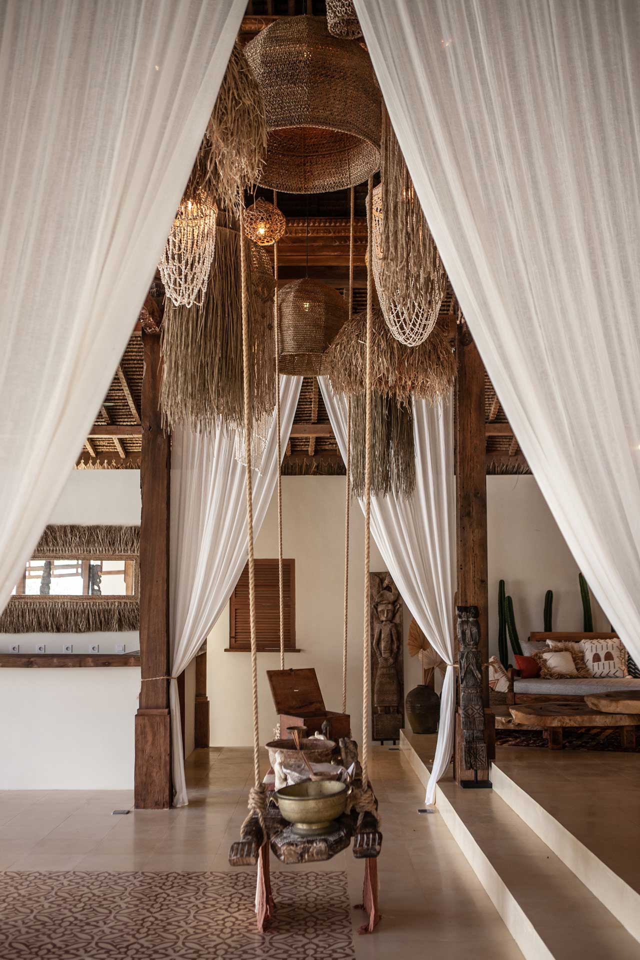 Gypsea Bali is designed as a barefoot sanctuary where architecture feels organic and lived in, shaped by sun, texture, and slow living. Rooted in tropical bohemian design, the space blends natural timber structures, thatched roofing, handwoven elements, and soft white textiles to create an atmosphere that is both grounded and effortlessly free spirited.