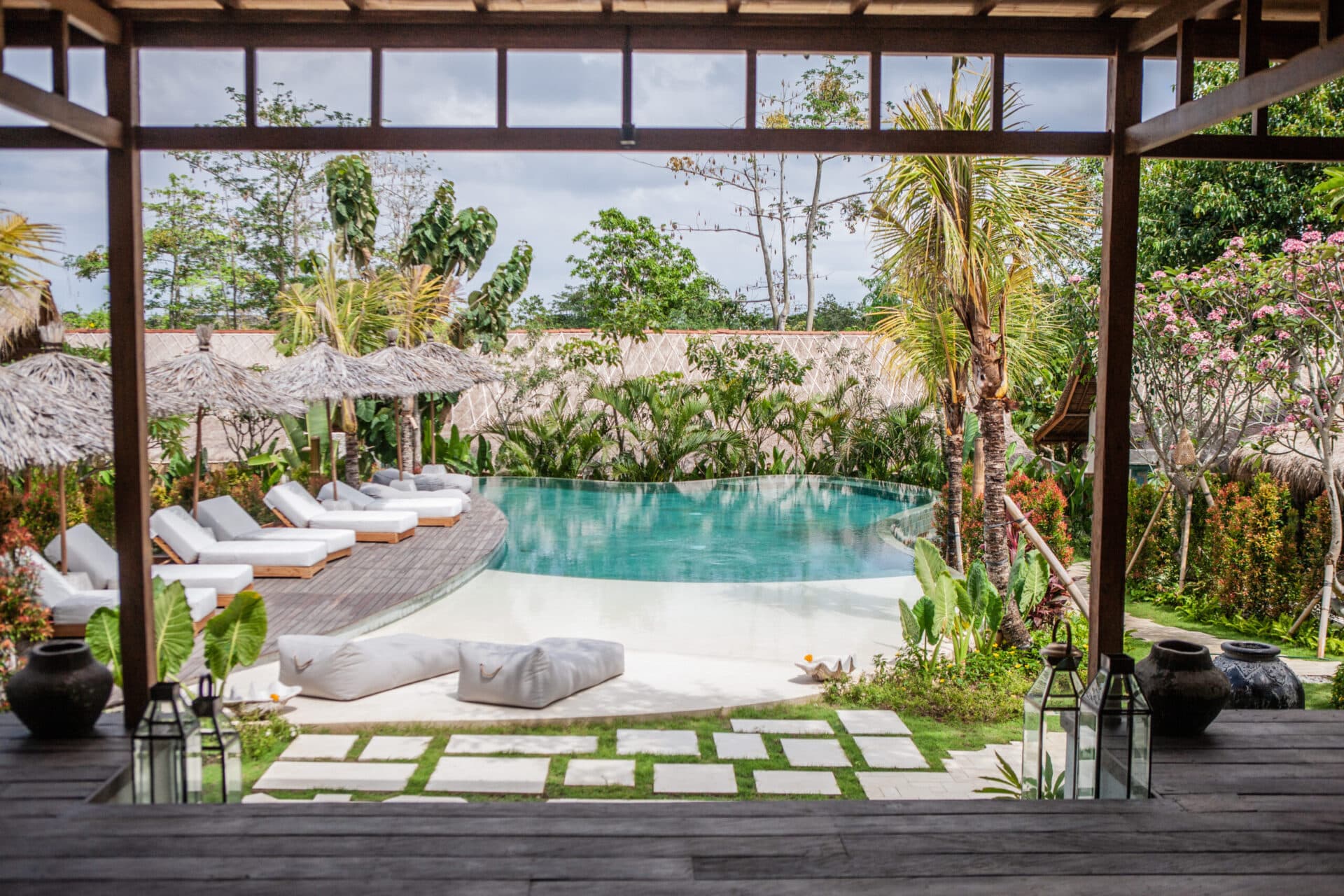 Outdoor living becomes the heart of the experience. A curved pool framed by lush greenery, timber decks lined with white loungers, and traditional parasols establish a seamless dialogue between architecture and landscape. Lounge areas beneath woven pendants and flowing curtains create intimate pockets for gathering, reflection, and connection.