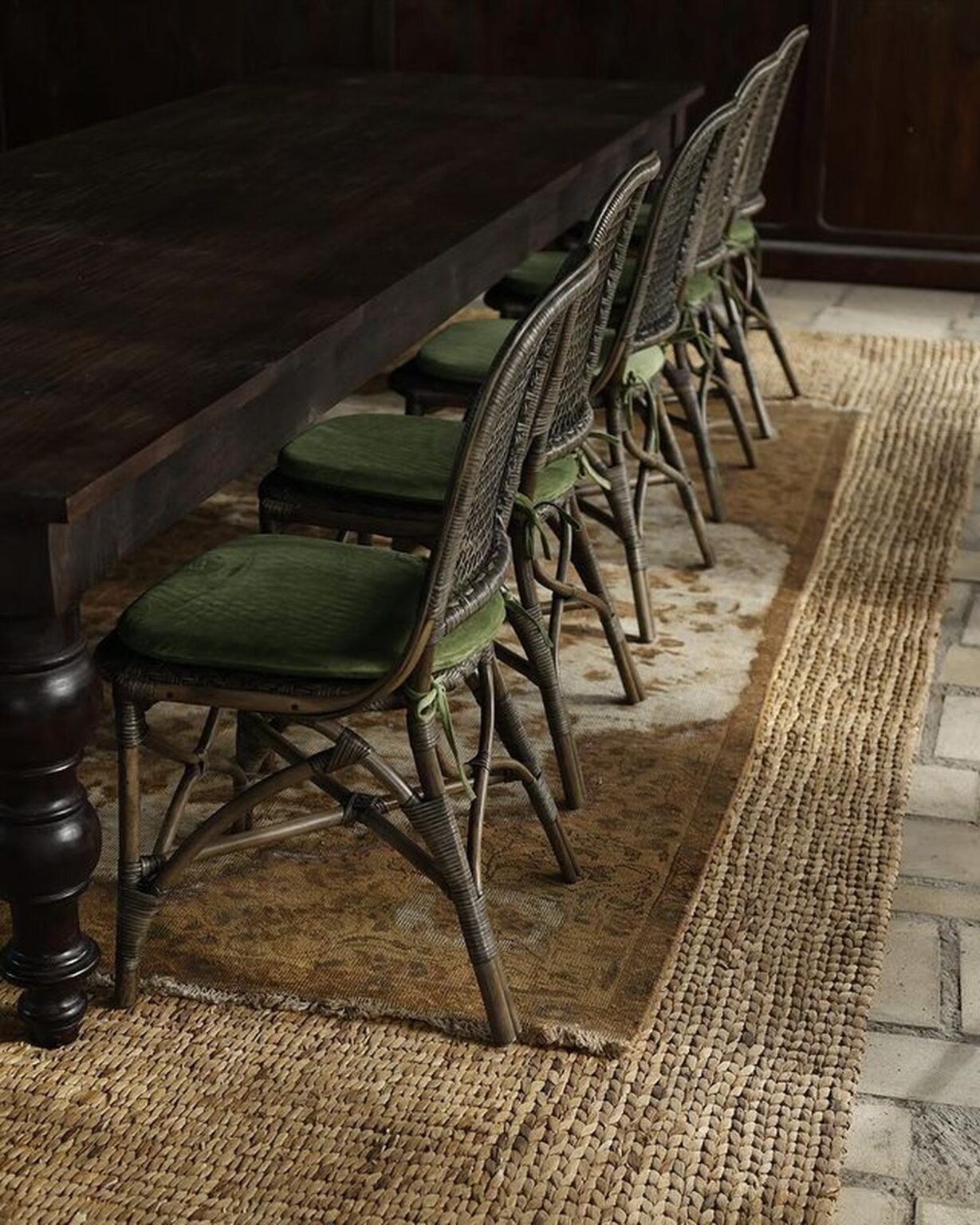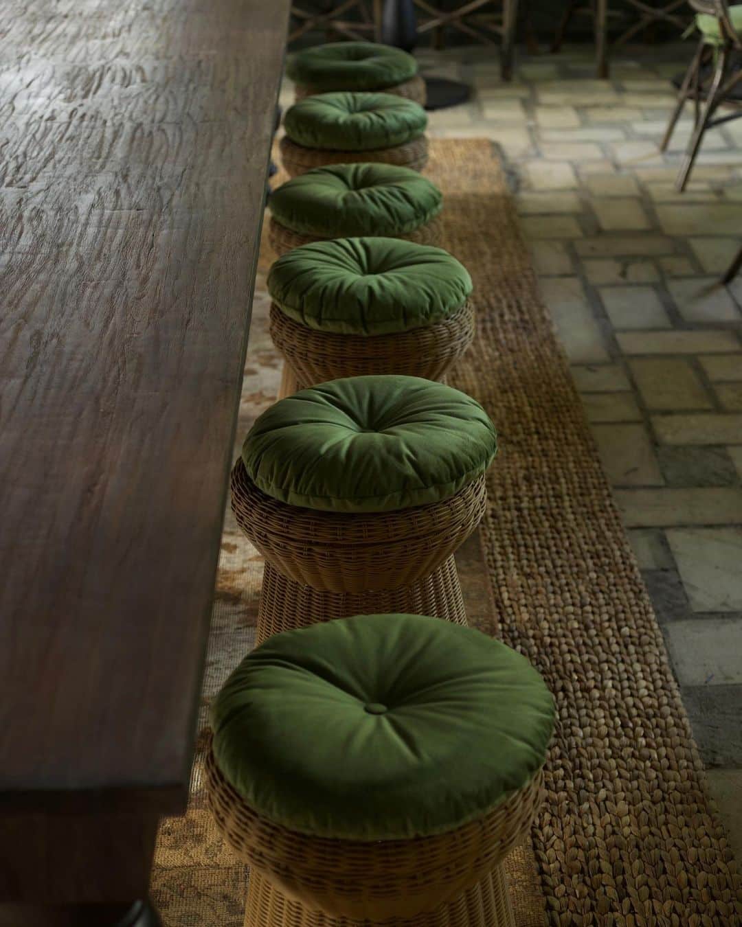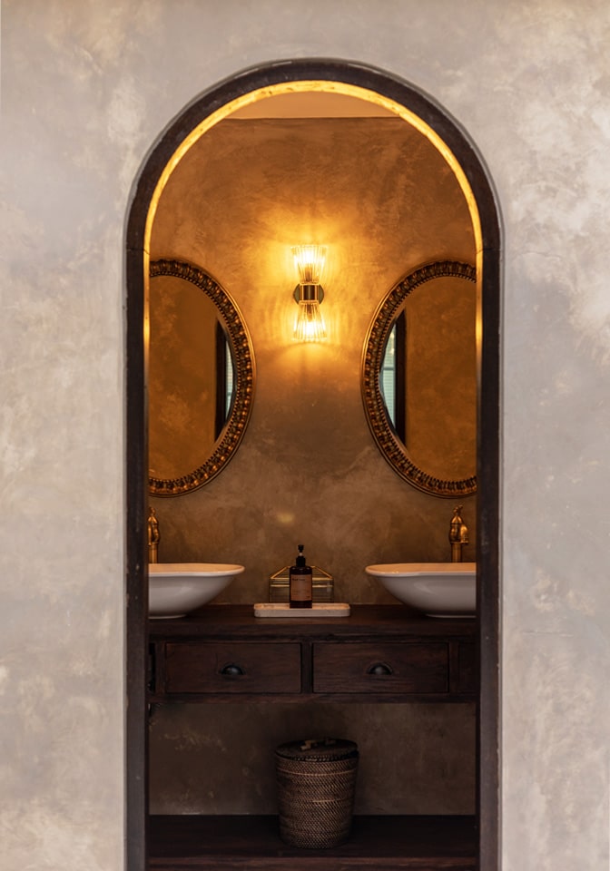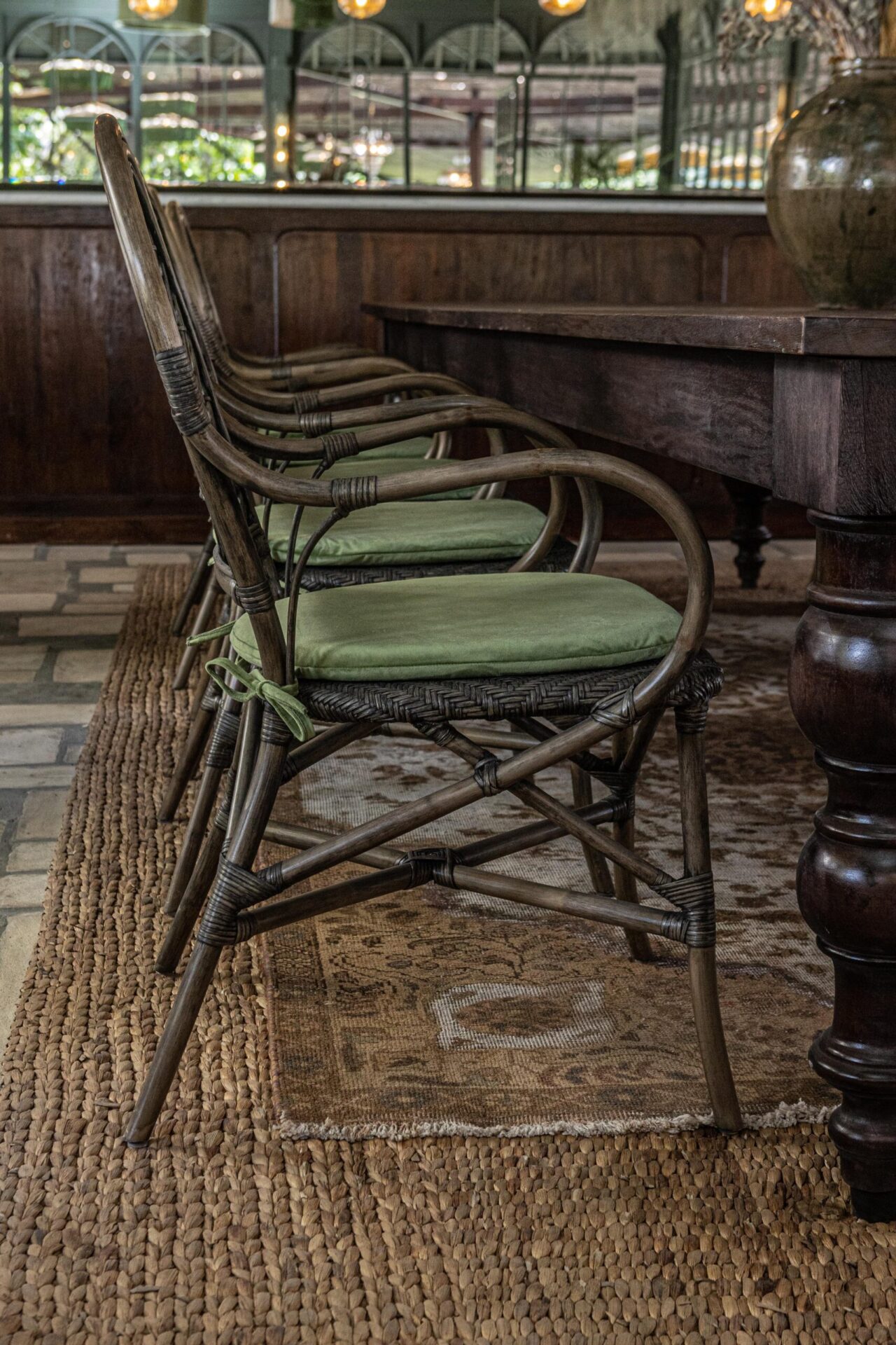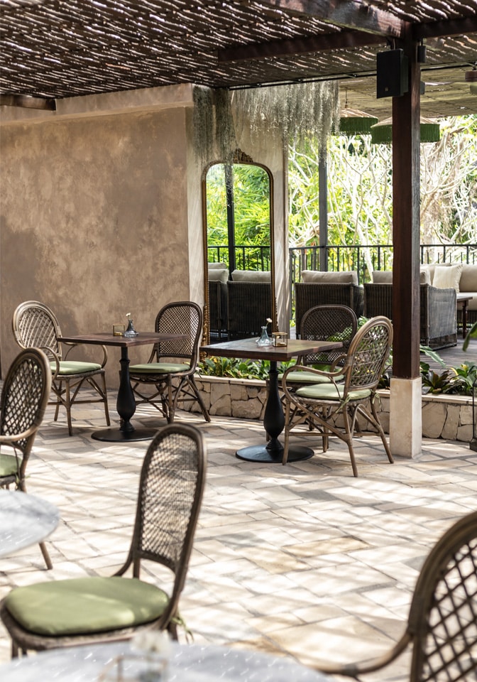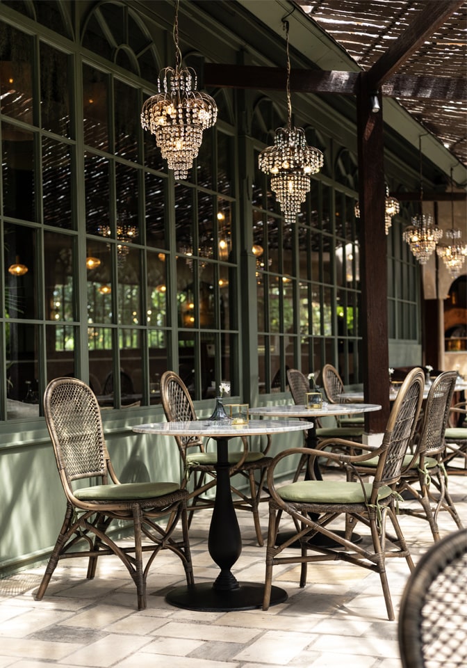 The design layers aged materials with refined detailing. Woven rattan dining chairs, marble café tables, and dark timber finishes create a grounded, tactile atmosphere. Above, crystal chandeliers contrast beautifully with the pergola-style roofing, introducing a subtle European elegance that feels unexpected yet perfectly balanced within the lush tropical setting.