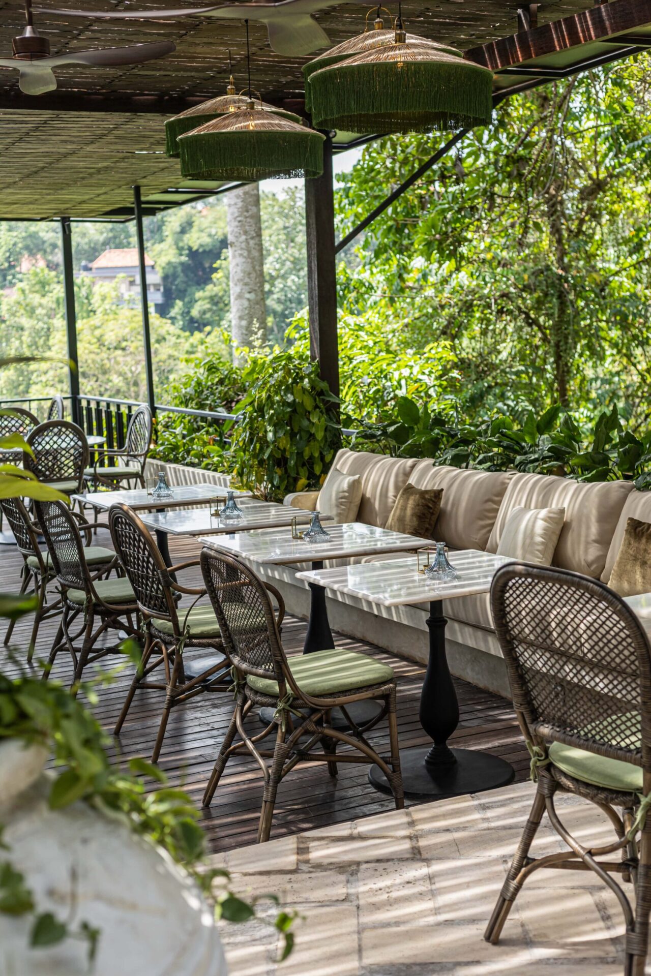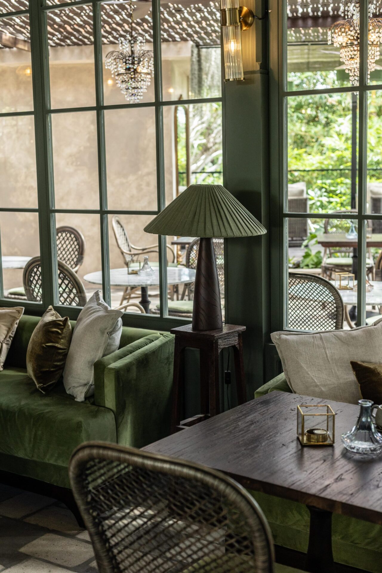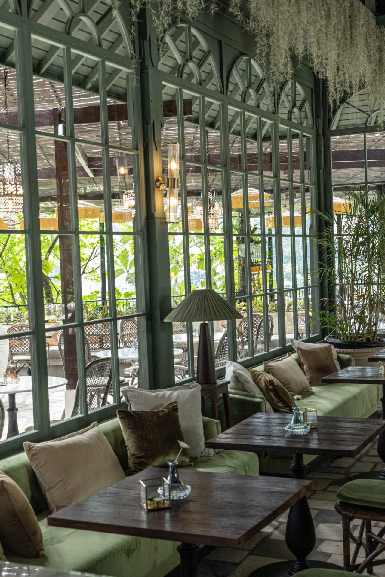 Deep green velvet banquettes and timber coffee tables form intimate lounge corners, while the open terrace extends the dining experience outward under fringed parasols and filtered sunlight. Hanging greenery and soft lighting enhance the romantic, garden-inspired mood — blurring the line between indoor bistro and tropical veranda.