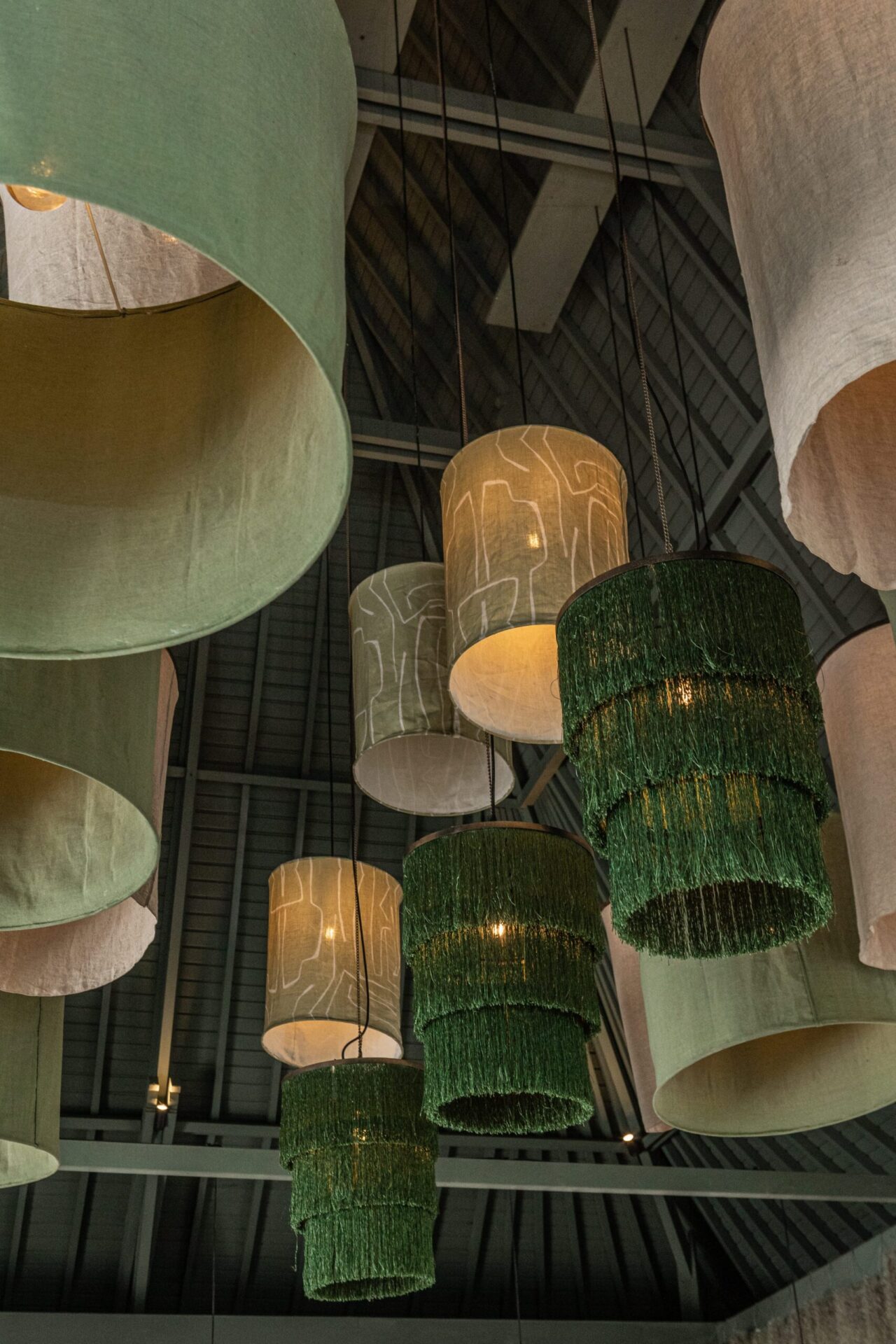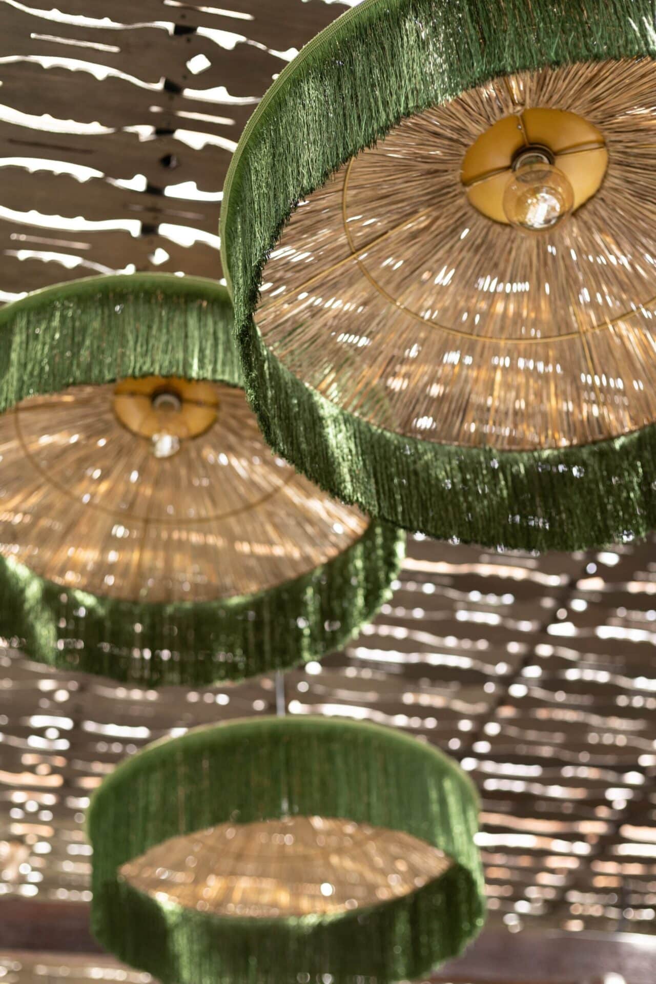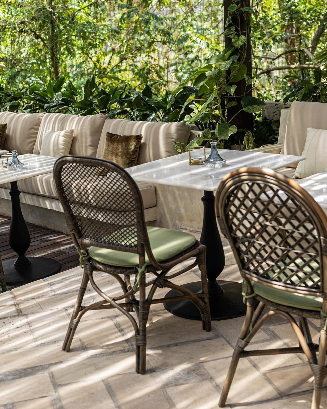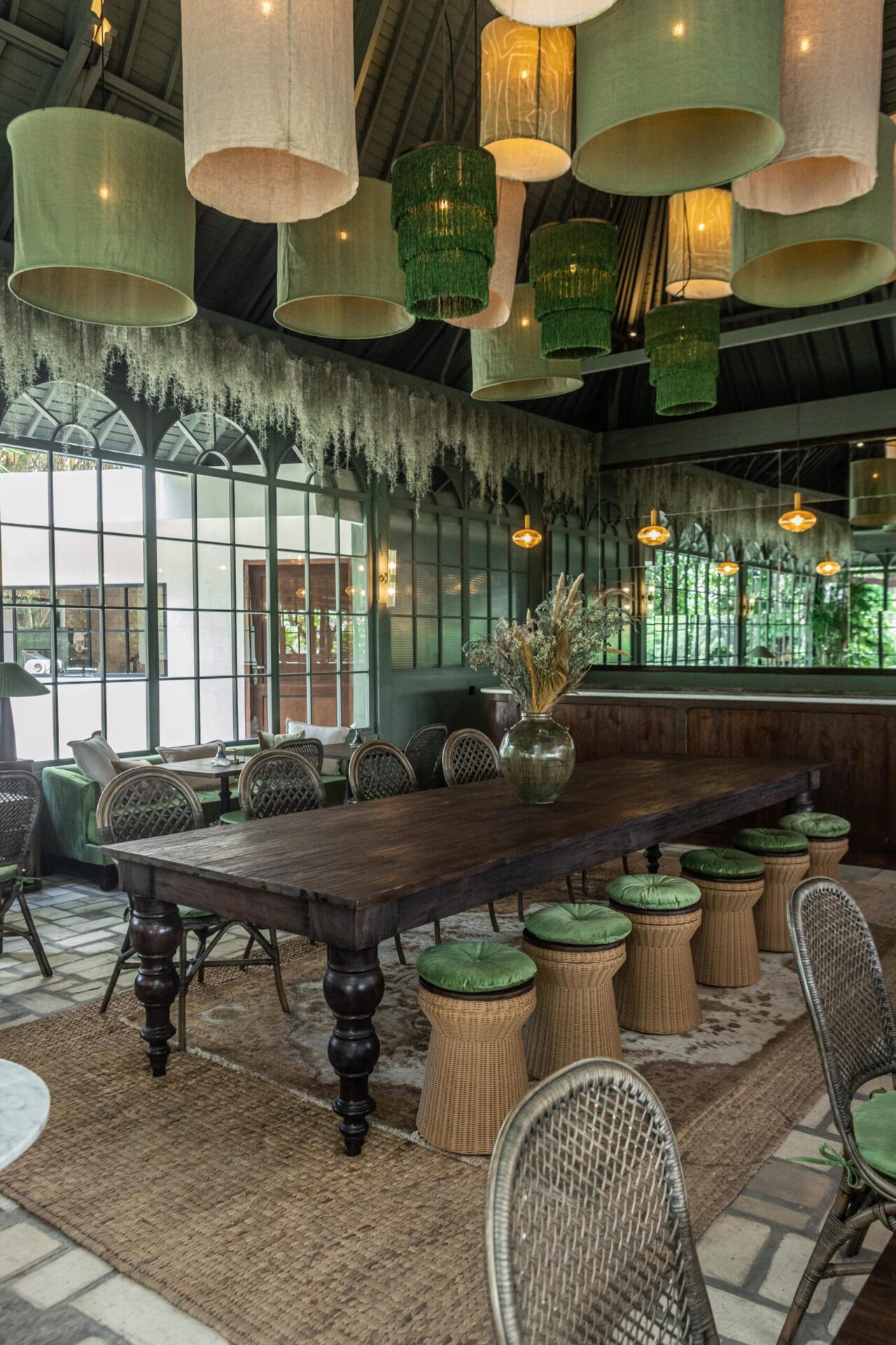 Deep green velvet banquettes and timber coffee tables form intimate lounge corners, while the open terrace extends the dining experience outward under fringed parasols and filtered sunlight. Hanging greenery and soft lighting enhance the romantic, garden-inspired mood — blurring the line between indoor bistro and tropical veranda.
