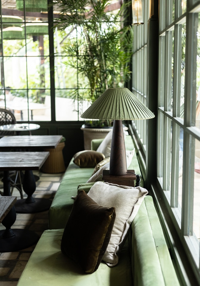 Plant Bistro is a celebration of tropical dining reimagined through a rustic, vintage lens. Wrapped in sage-green panelled walls and framed by classic arched windows, the space evokes the charm of an old-world conservatory — where nature, texture, and soft daylight become part of the interior experience.