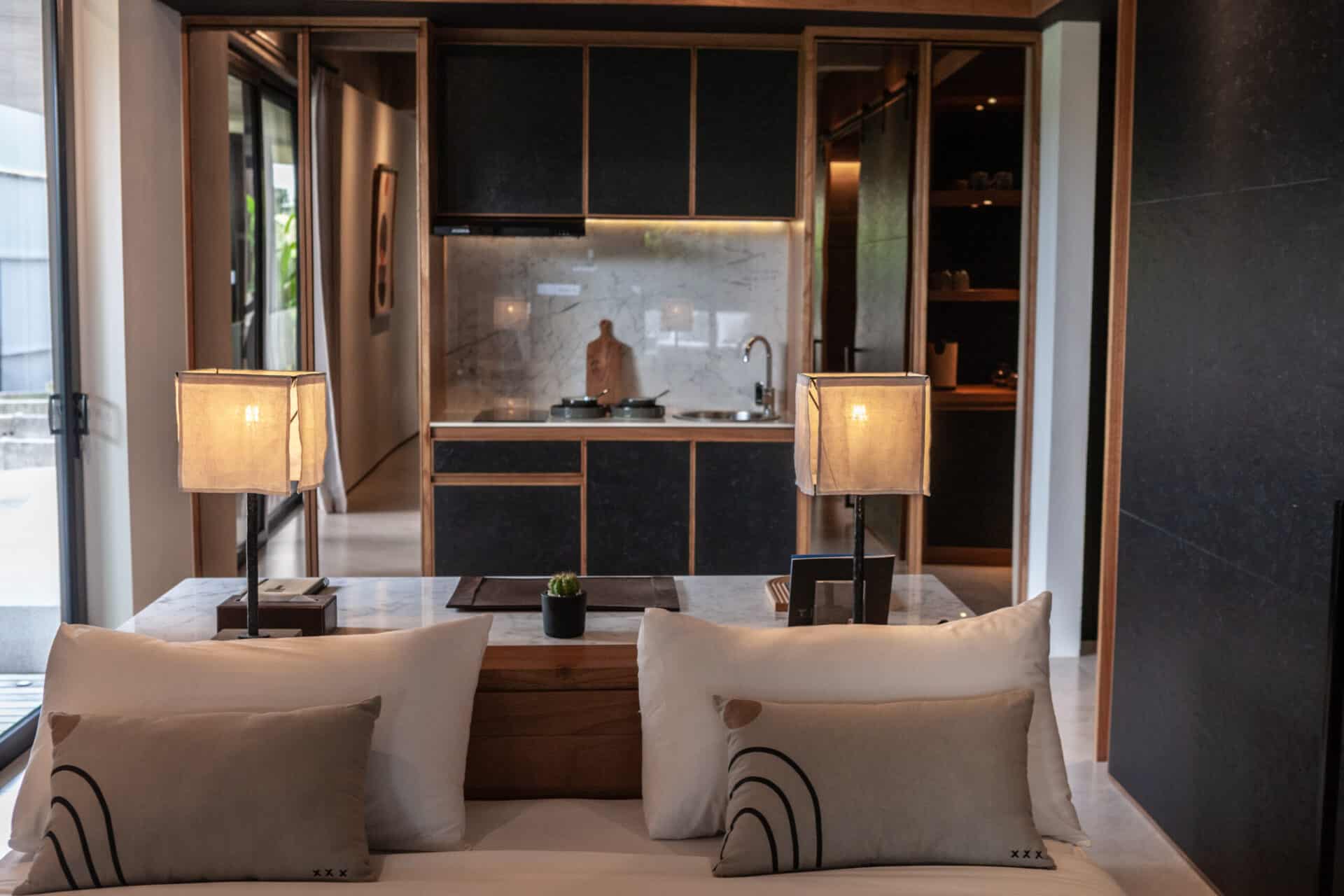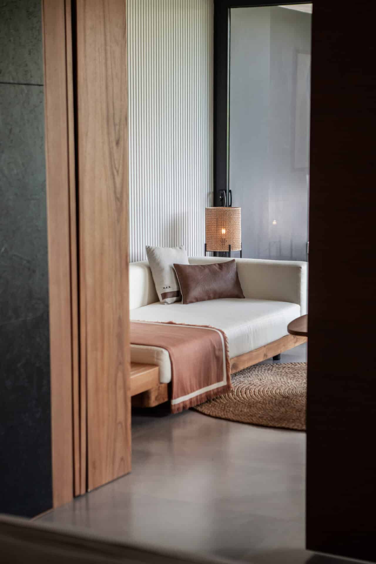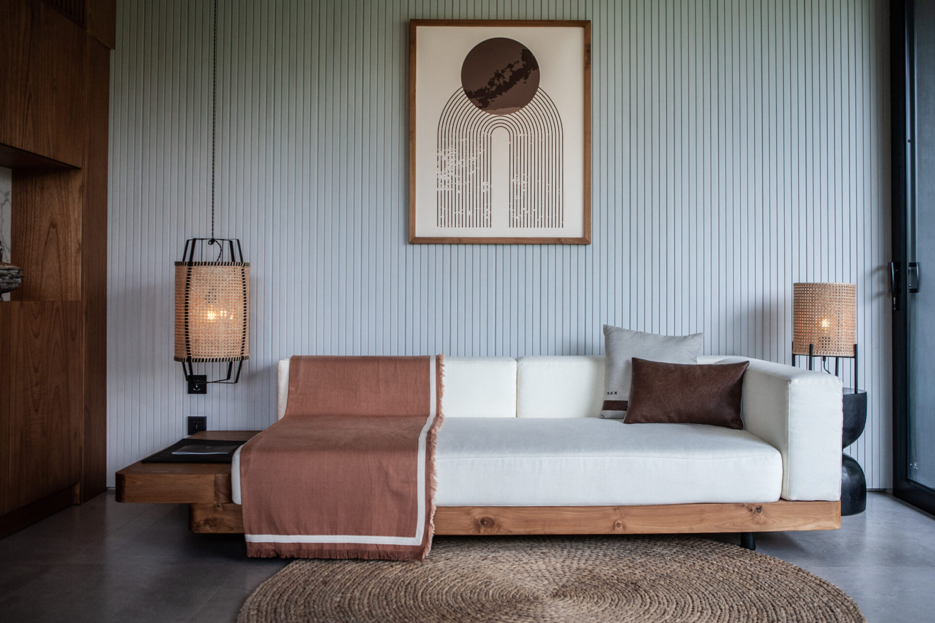 For the Tamora Apartment project, Paz Studio curated an environment that epitomizes the “less is more” philosophy through a Contemporary & Minimalist lens. The living area features a clean-lined, low-profile sofa set against a vertical slatted feature wall, creating a sense of height and architectural rhythm within the compact space.