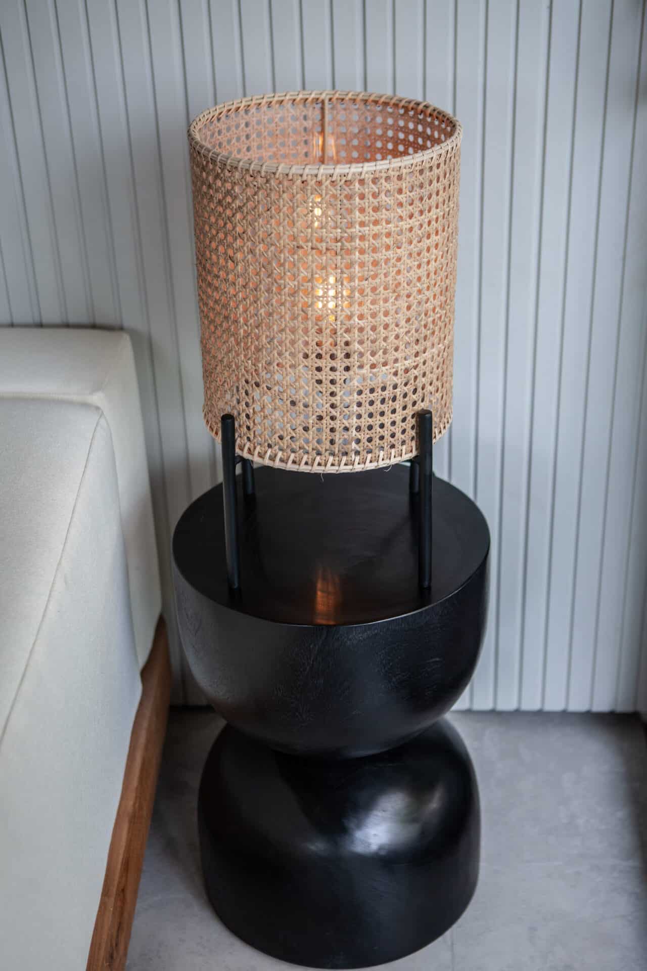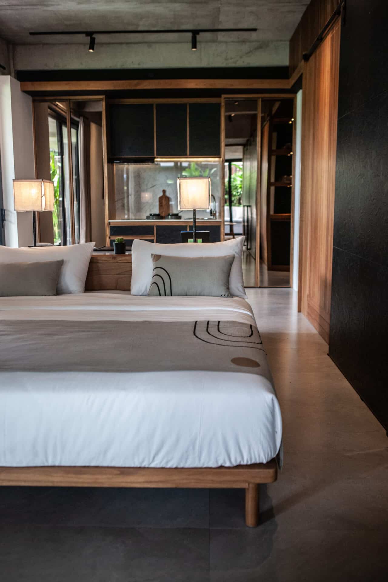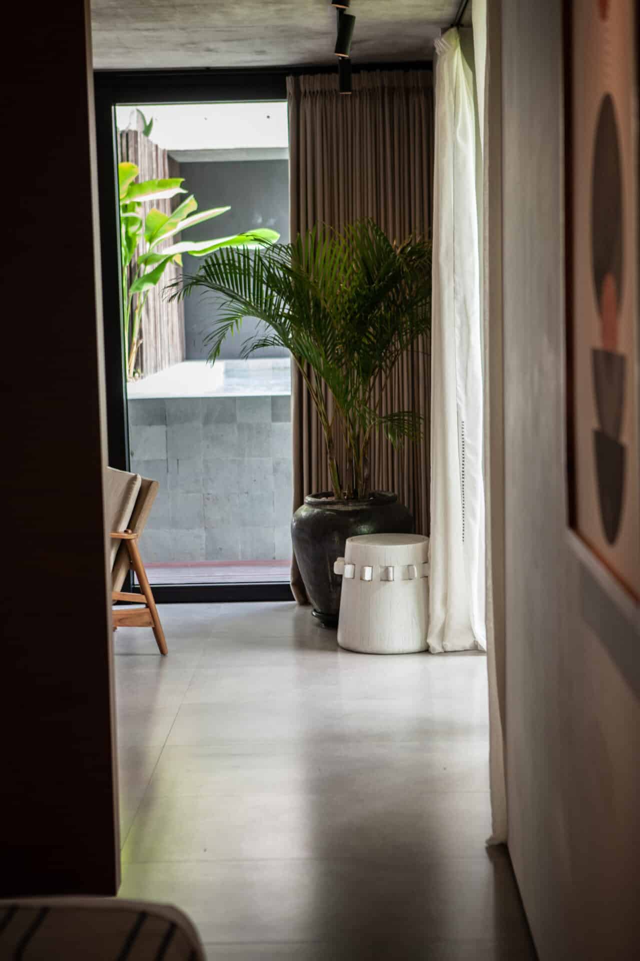 We balanced the cool, grey tones of the industrial-style flooring with warm timber built-ins and organic textures, such as the circular jute rug and woven rattan pendant lights. Large glass sliding doors blur the boundaries between the interior and a private outdoor terrace, where a sleek plunge pool and built-in concrete seating are framed by lush tropical greenery, offering an urban escape that feels both expansive and intimate.
