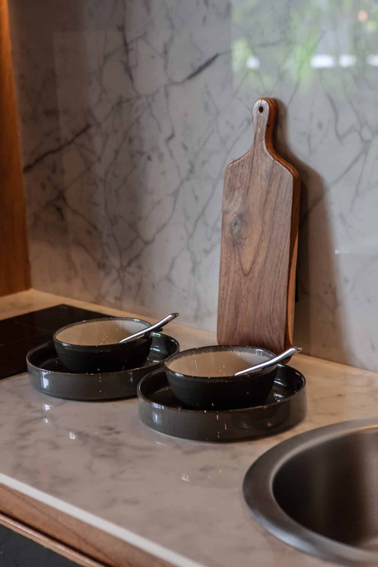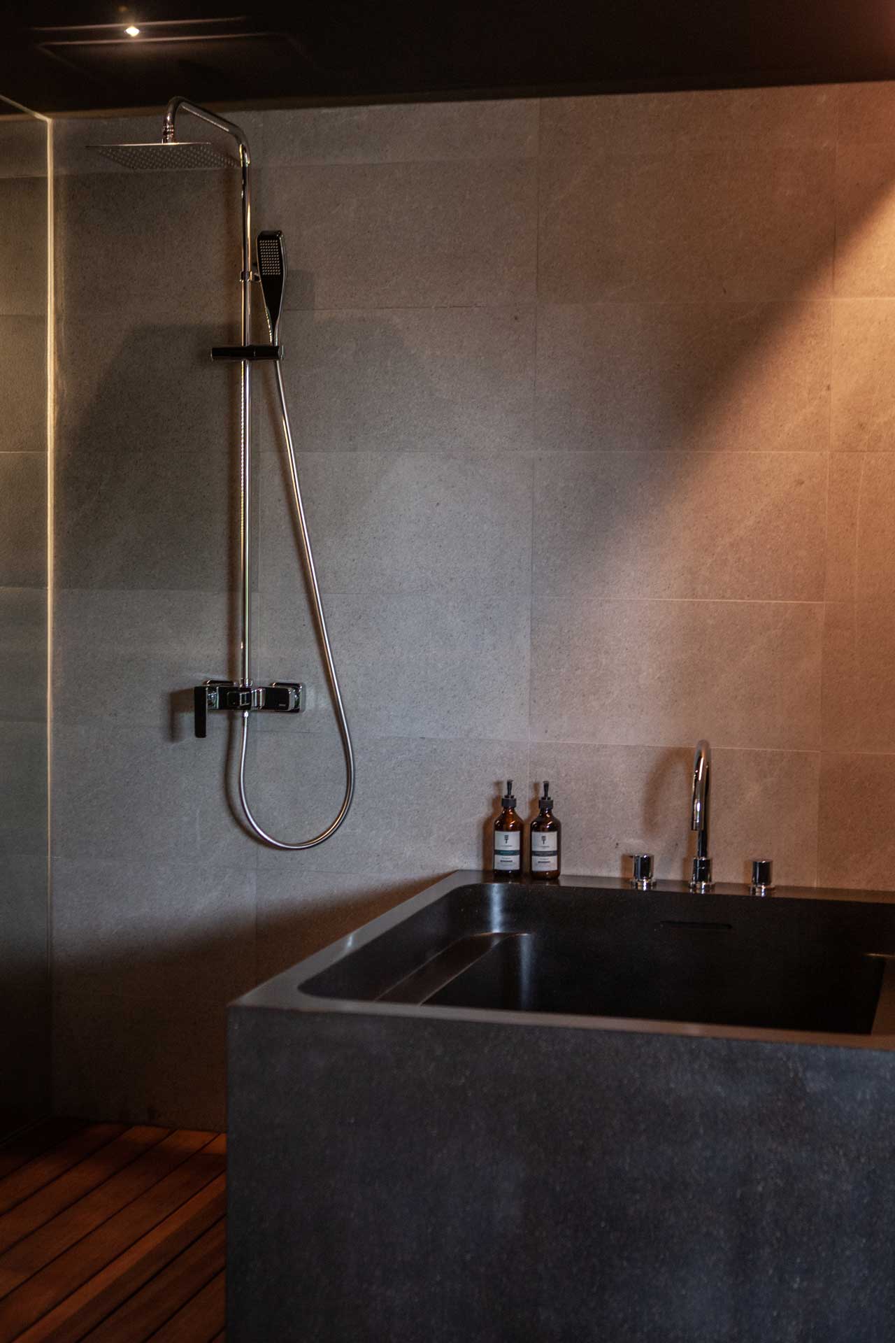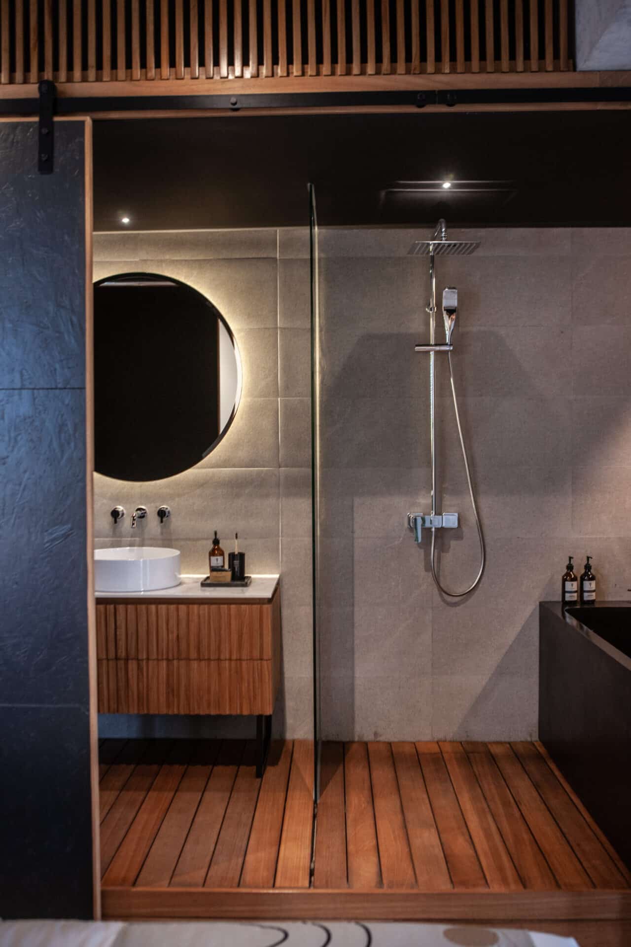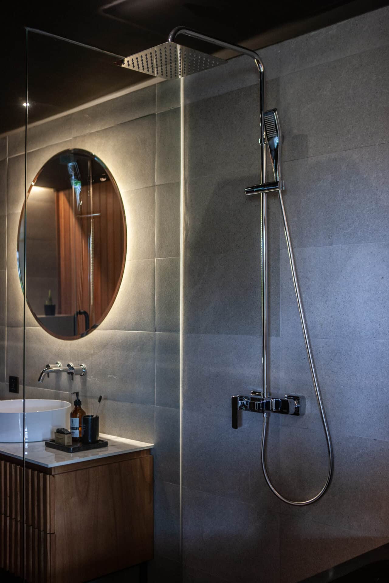 The kitchen and private quarters further showcase our commitment to functional elegance through a dark, moody palette and high-end finishes. We integrated a compact kitchenette featuring a striking marble backsplash and matte black cabinetry that seamlessly blends into the living zone, ensuring every square inch is utilized without sacrificing style. In the bathroom, the use of large-format stone tiles and recessed LED lighting creates a spa-like atmosphere, centered around a deep, monolithic soaking tub and a minimalist rainfall shower. This project serves as a definitive example of how Paz Studio utilizes a neutral, sophisticated palette to transform modern apartment living into a curated, serene sanctuary.