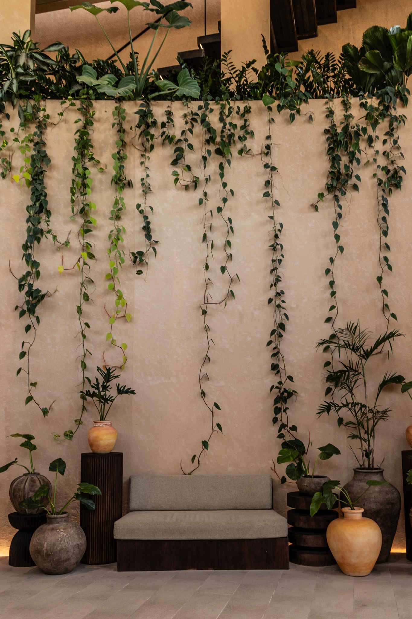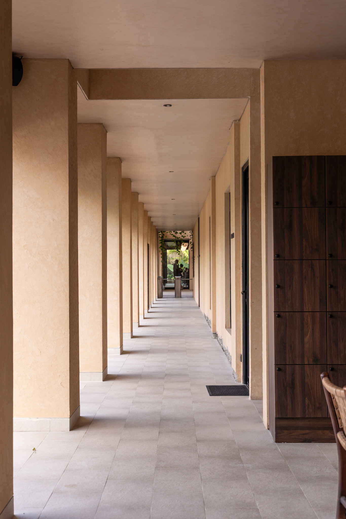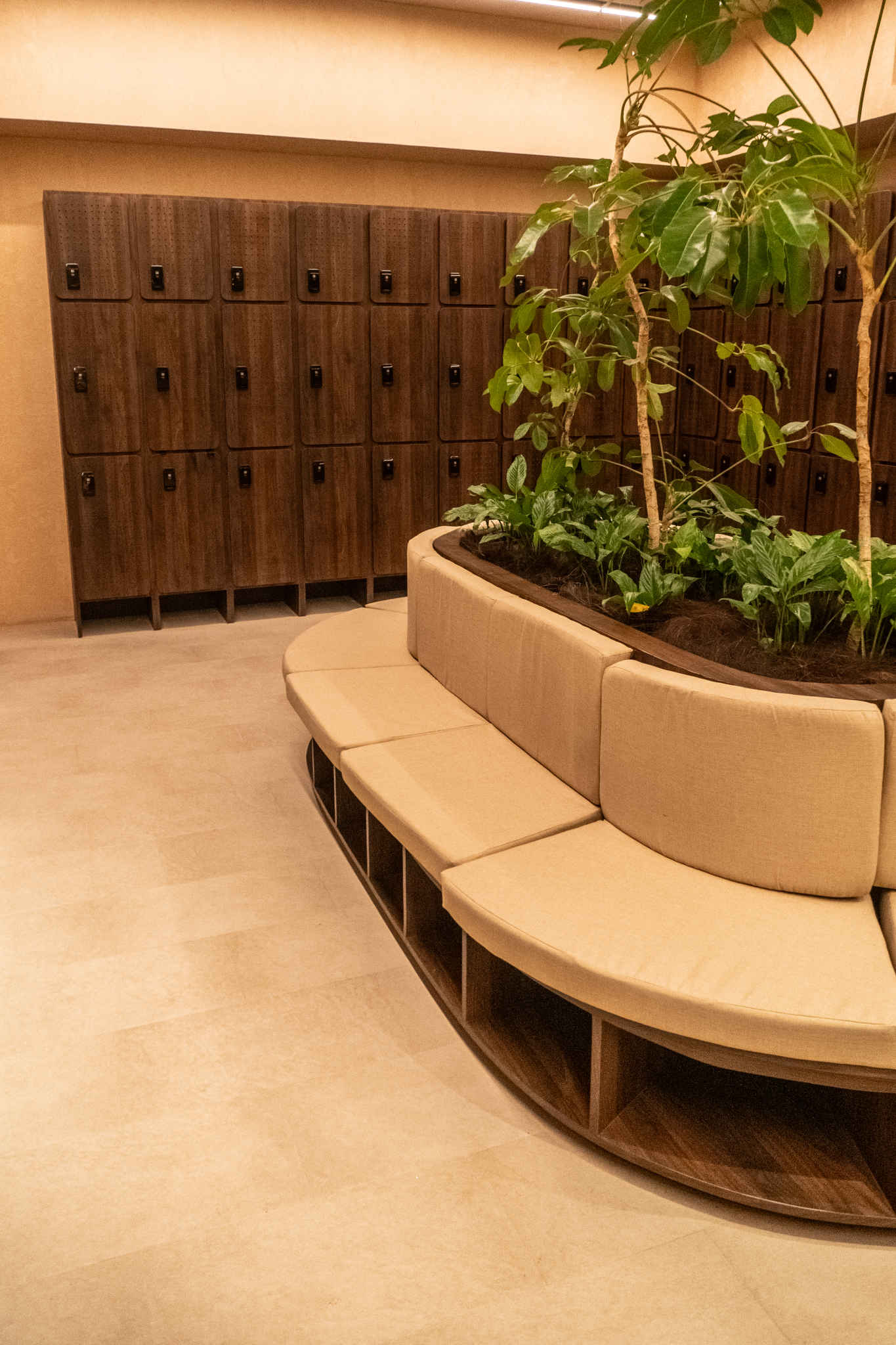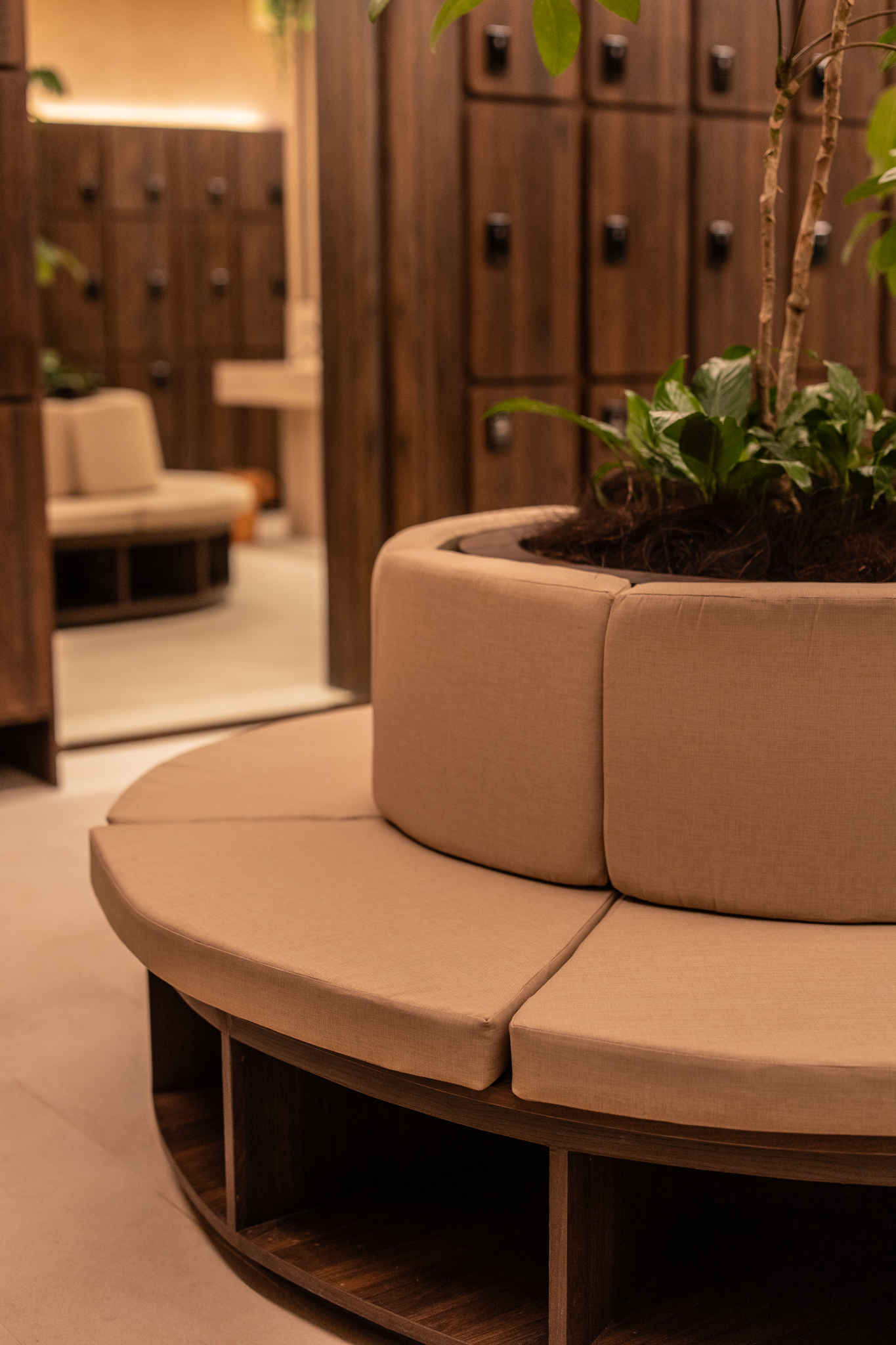 Layered wood lockers, soft curved seating, handcrafted wall finishes, and sculptural lighting come together in a rhythm of repetition and calm geometry. Natural light filters through textured surfaces, while greenery softens architectural lines, blurring the boundary between interior and nature.