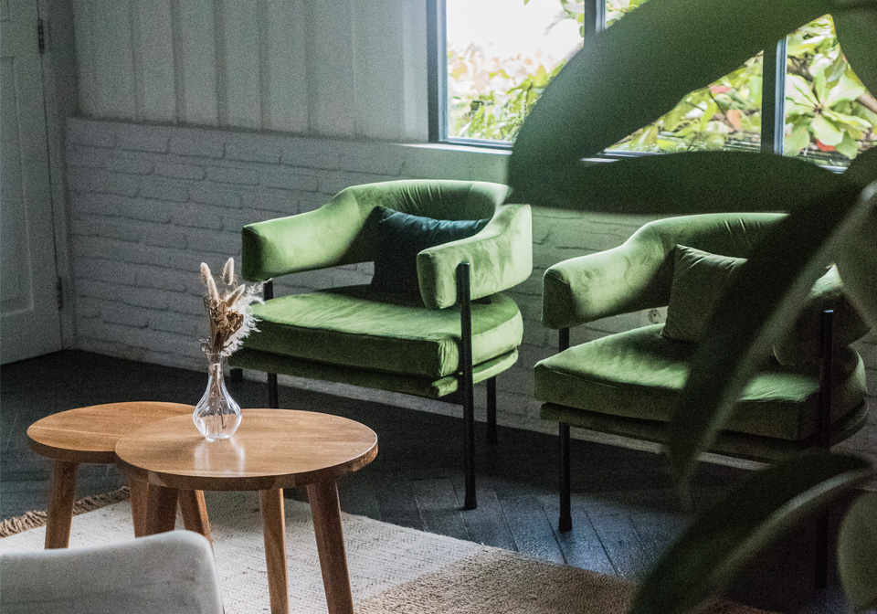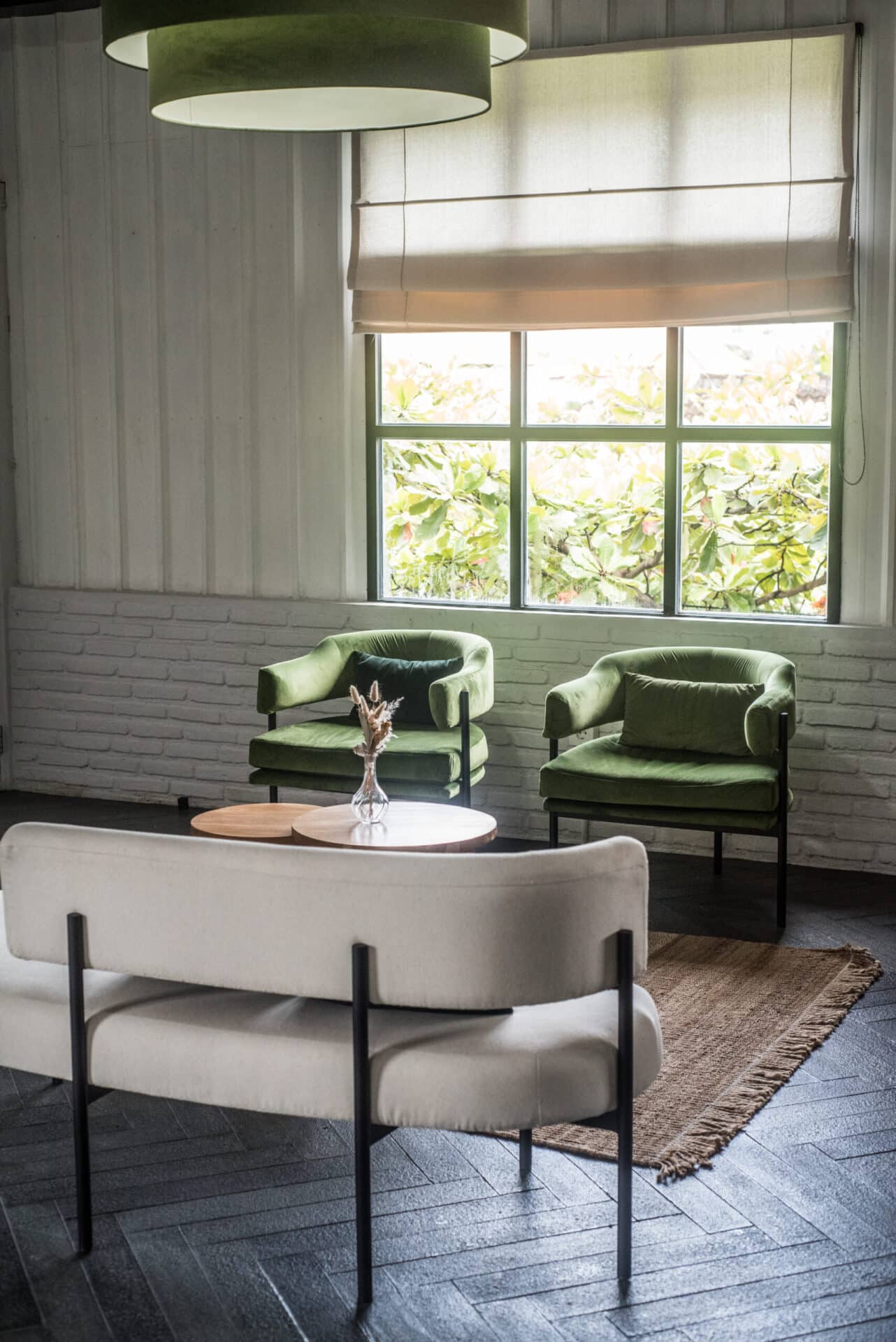 We curated the breakout and lounge areas to feel like a natural extension of our studio’s serene aesthetic, focusing on comfort and tactile variety. We paired soft linen sofas and sage green velvet armchairs with minimalist black metal coffee tables to create inviting pockets for collaboration and quiet reflection. Throughout the office, we featured open timber shelving that acts as both a functional partition and a display for curated sculptural objects, allowing light to flow through the glass walls and illuminate every corner.