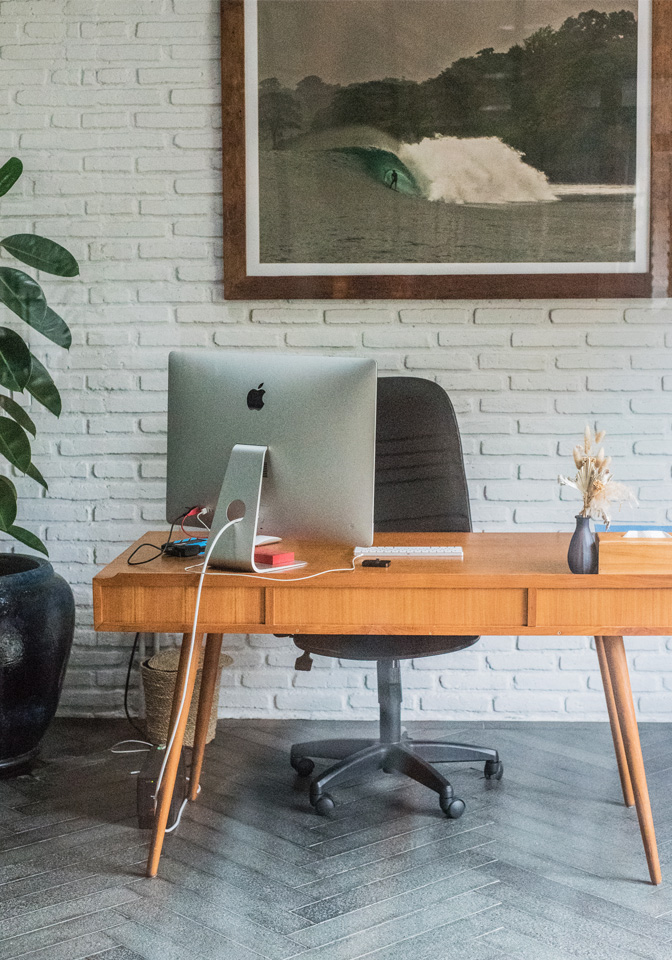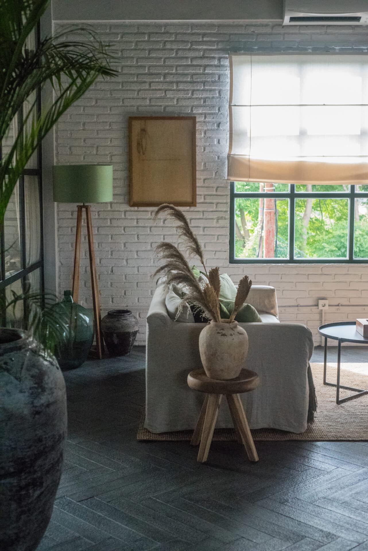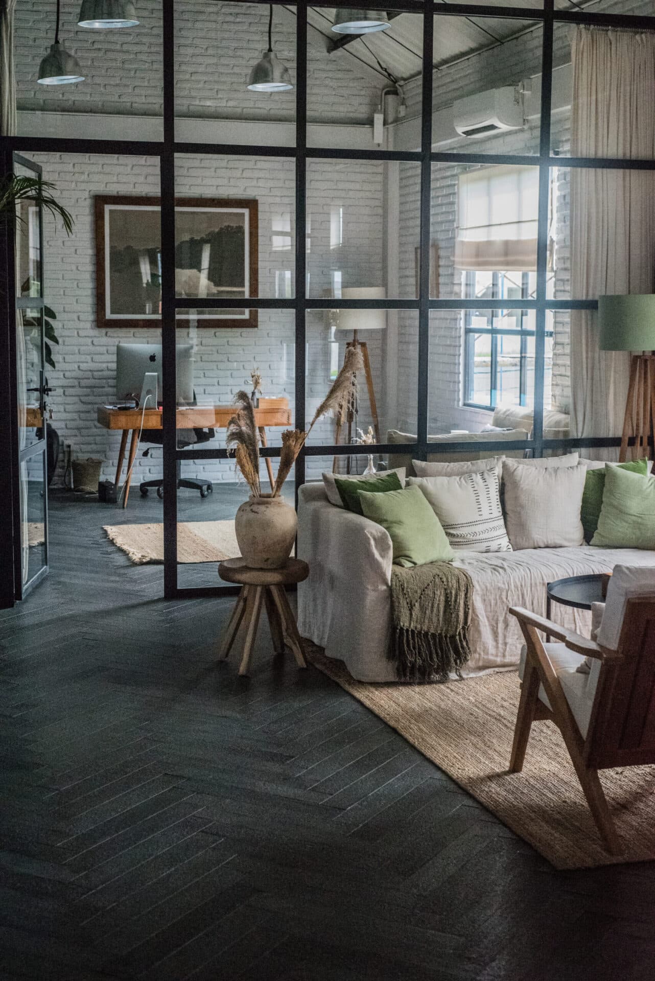 We anchored the main work area with dark herringbone flooring, which provides a sophisticated foundation for the bespoke timber desks and lush oversized greenery that brings a vital, organic energy into the professional environment. By contrasting the cool industrial elements with warm wood accents and artisanal pottery, we created a headquarters that inspires both productivity and creative calm.