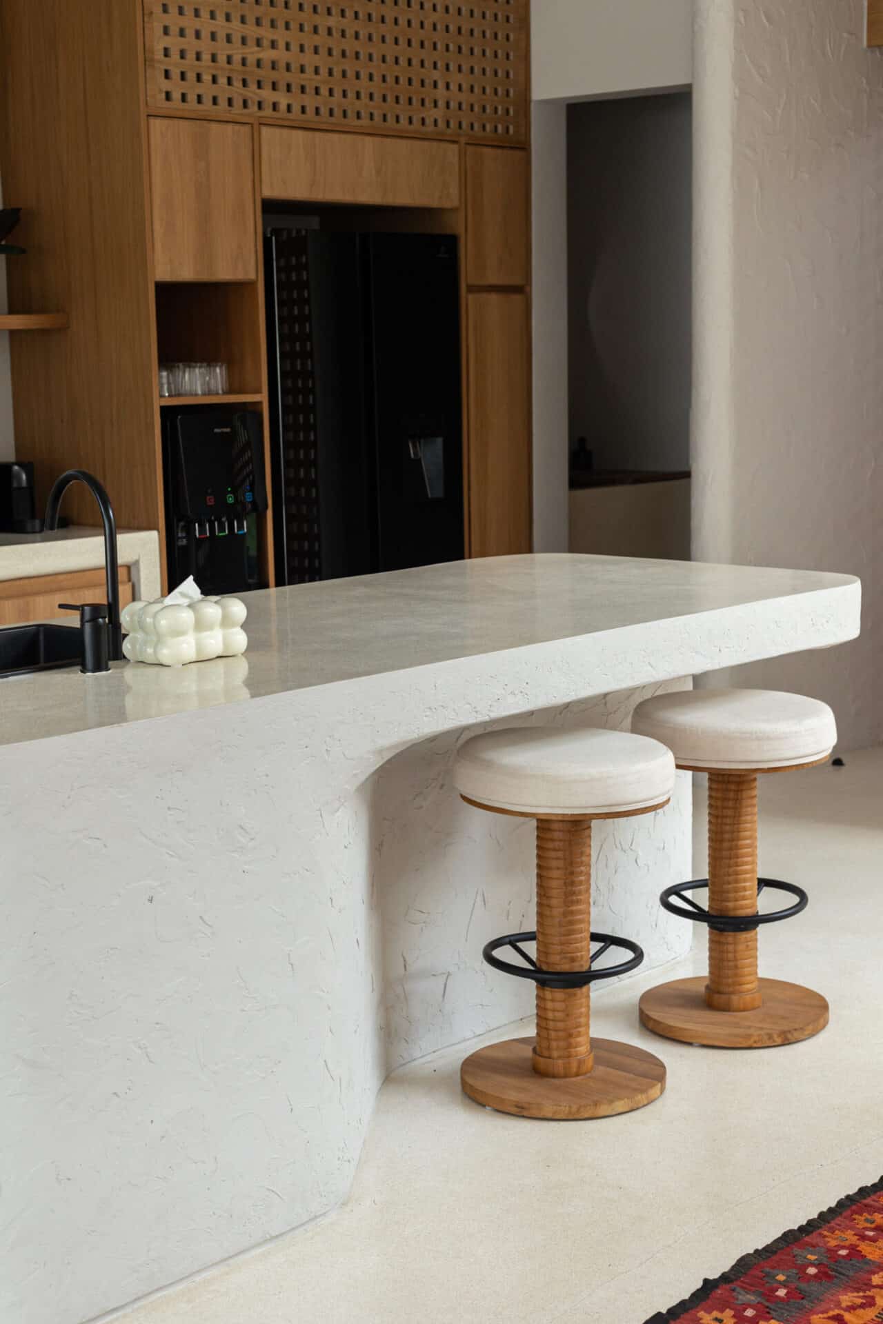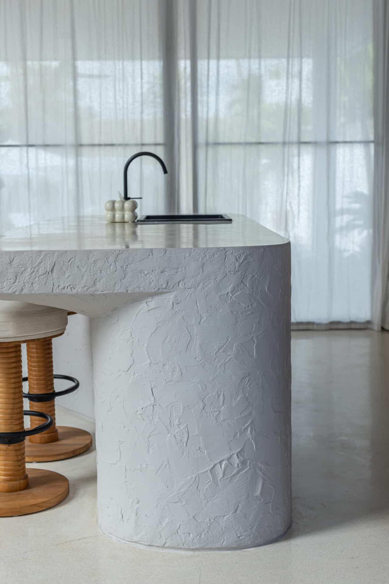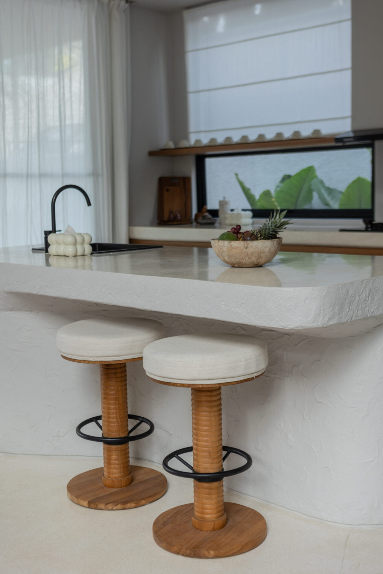 We designed Villa Berawa Breeze as a contemporary sanctuary where the vibrant soul of Moroccan craftsmanship meets the clean, airy lines of tropical architecture. We conceptualized the space as a series of fluid, light-filled volumes, using hand-textured plaster and smooth concrete to create a soft, monolithic backdrop. The narrative of the home is defined by its architectural curves—from the sweeping kitchen island to the sculptural spiral staircase—which are grounded by the rich patterns of traditional tribal rugs and woven ikat textiles.