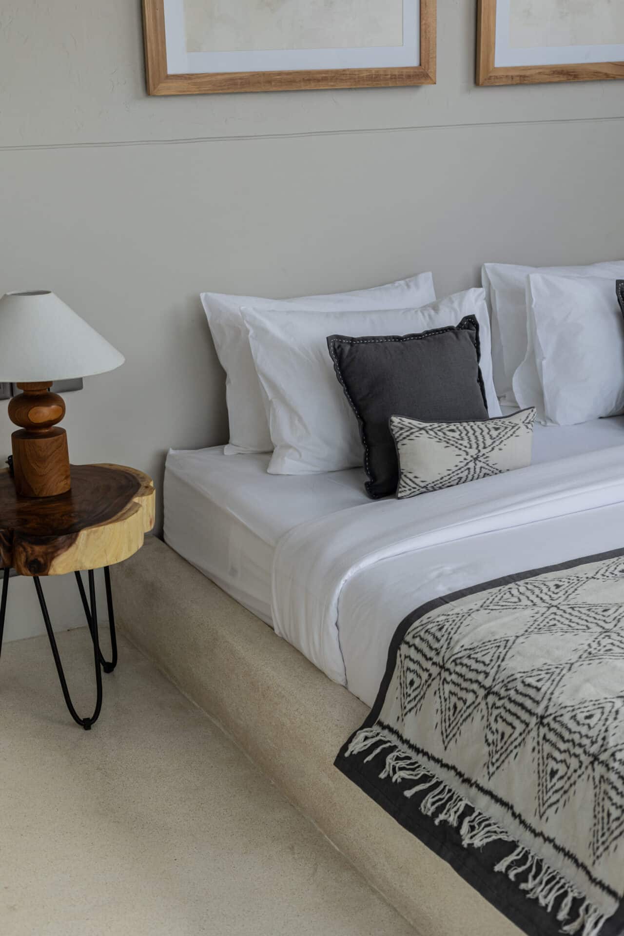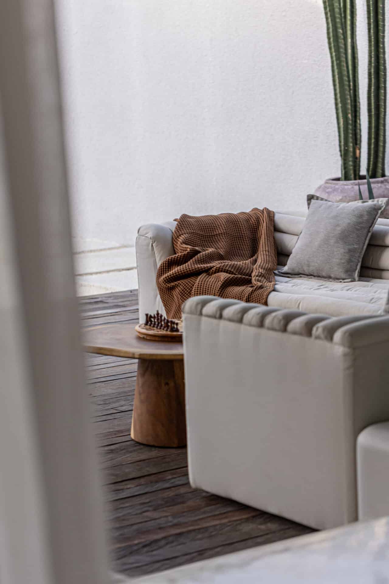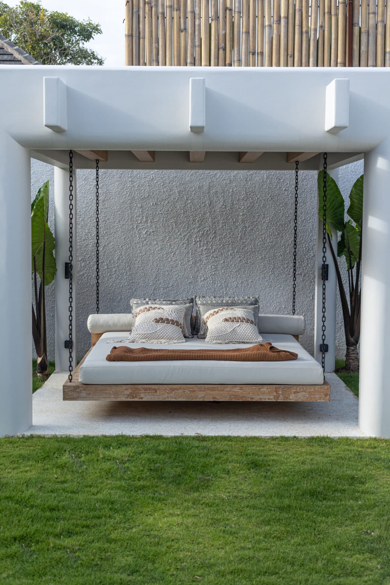 Every corner of the villa is an intentional study in comfort and cultural fusion, designed to feel both exotic and deeply serene. Whether it is the bedroom where a hand-woven tapestry serves as a headboard or the outdoor lounge set against a backdrop of towering cacti, the design celebrates the beauty of global influence. For Paz Studio, Villa Berawa Breeze is a testament to the harmony of contrast—a place where the desert’s stillness and the ocean’s breath coexist in perfect architectural balance.