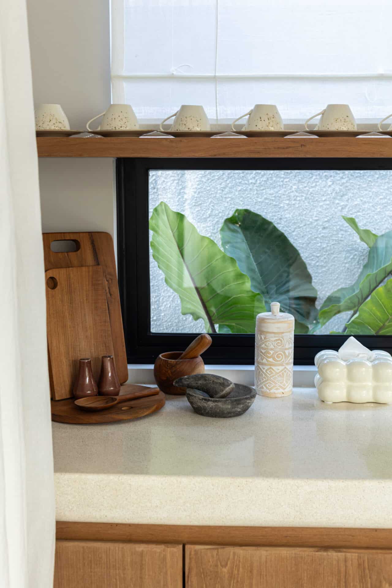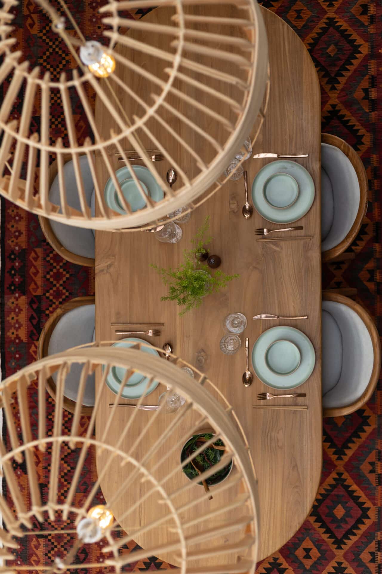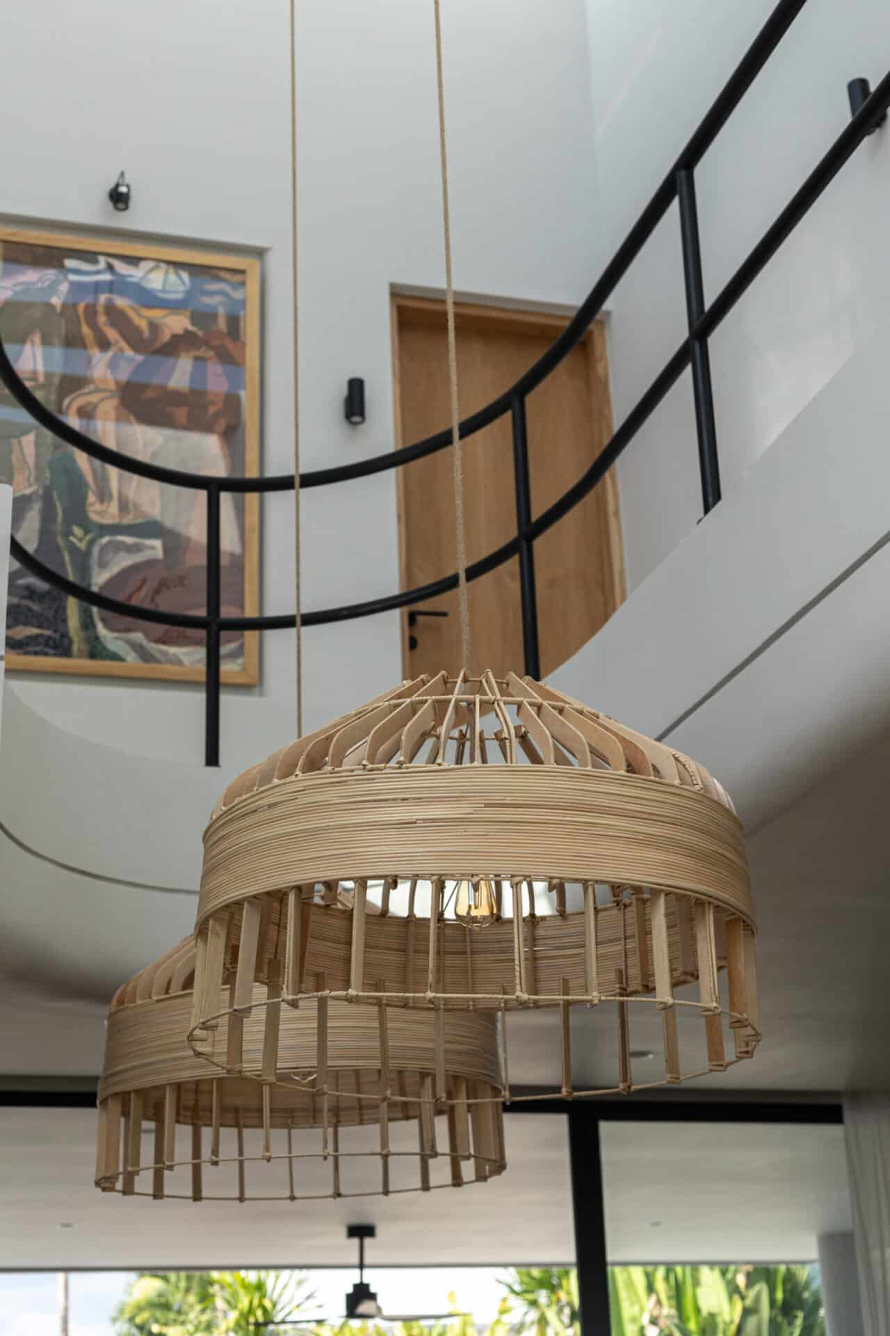 The interior experience is a careful curation of raw materials and artisanal details that invite a slower pace of life. We paired organic timber dining tables and custom-carved bar stools with bold, black-framed windows that frame the lush Balinese landscape like living art. Above, oversized woven rattan pendants drop from double-height ceilings, casting a dappled, golden light that bridges the gap between the structured interior and the wild, sun-drenched pool deck outside.