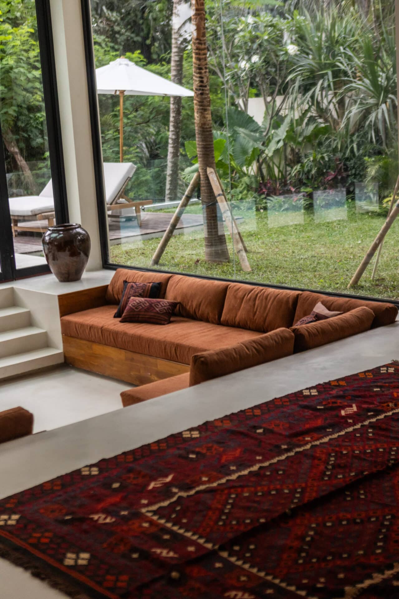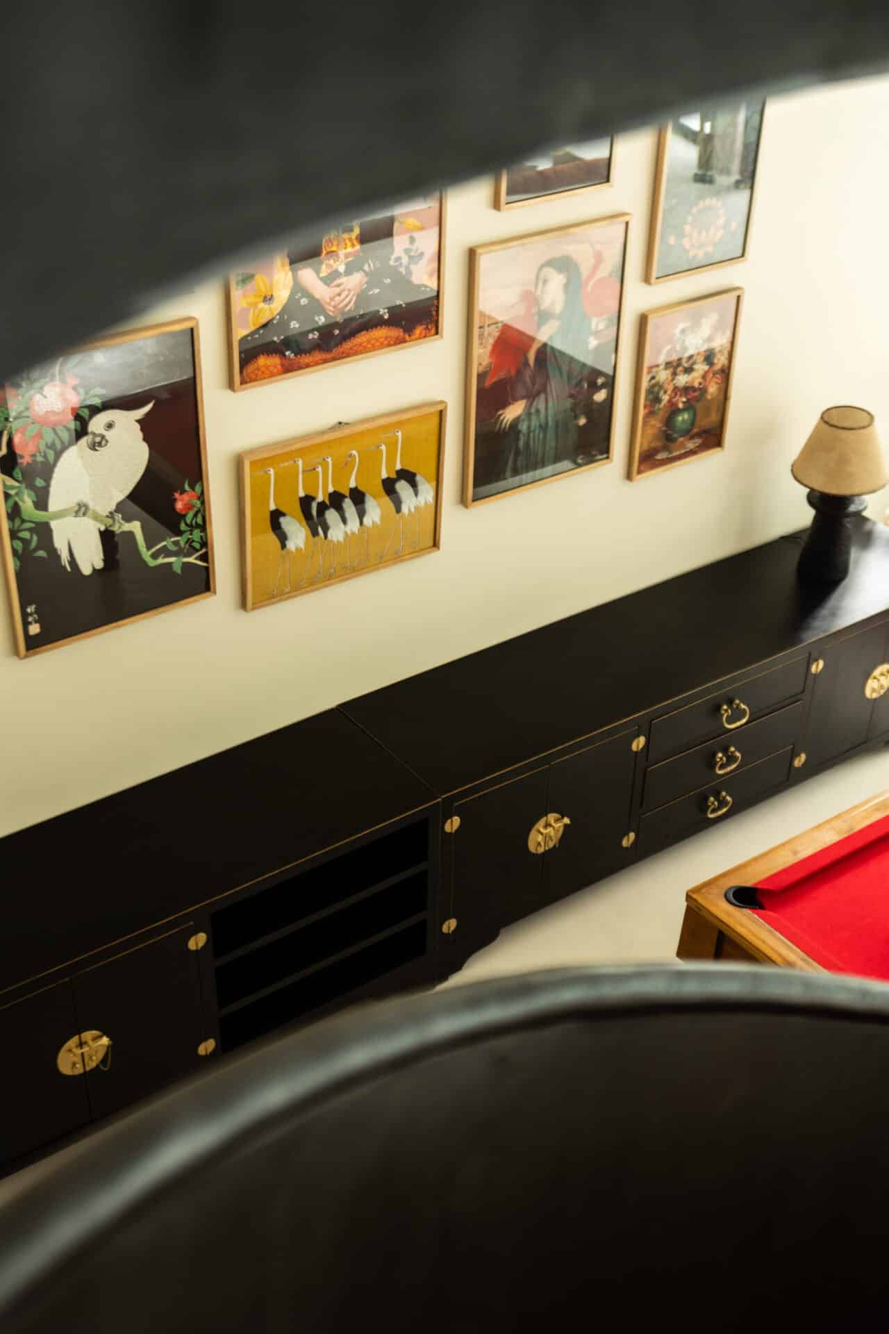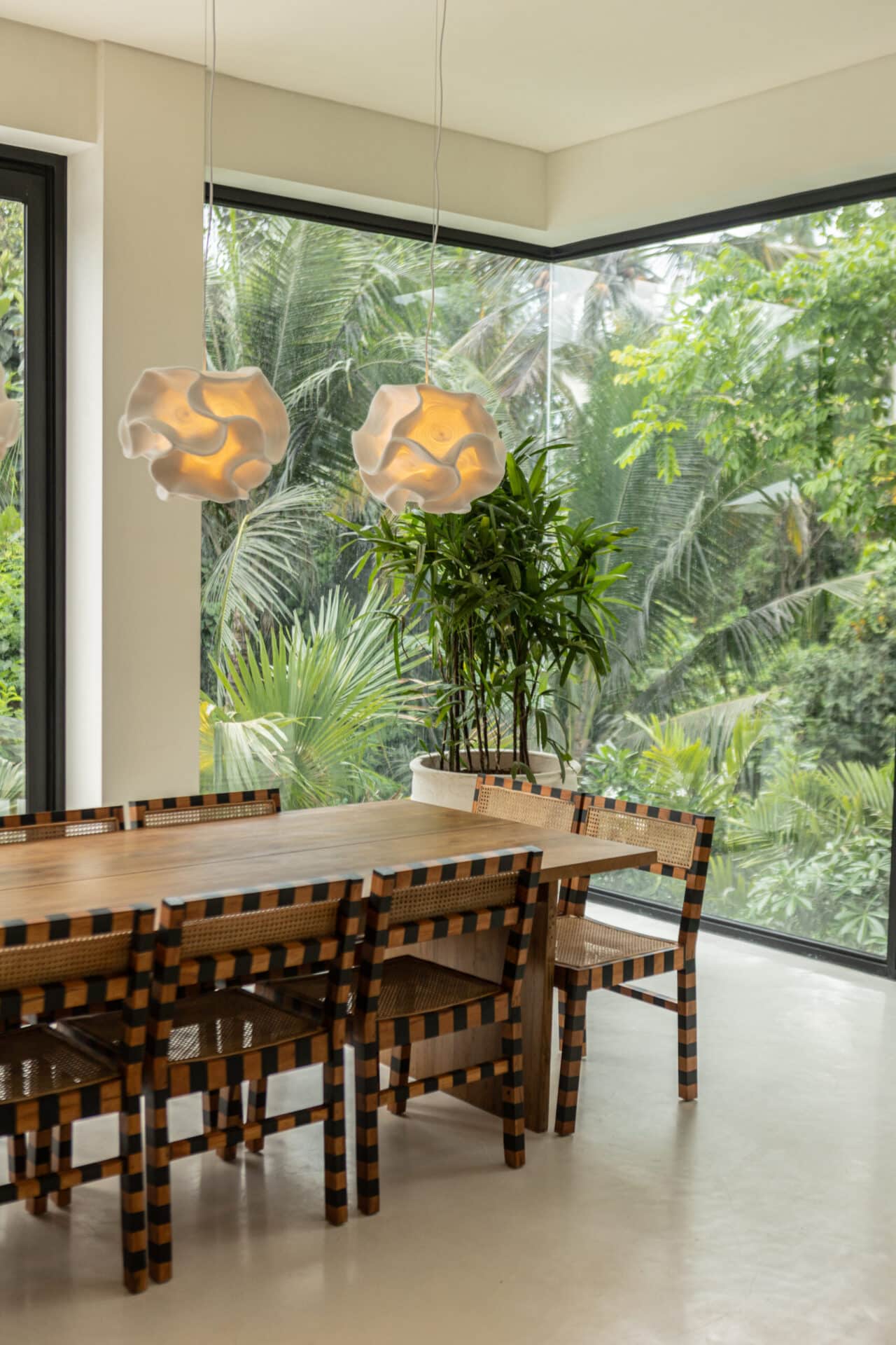 The interior narrative celebrates an eclectic, global spirit through a curated mix of bold patterns and artisanal textures. We anchored the living areas with grounding elements—sunk-in wooden lounges with burnt-orange cushions and intricate Persian rugs—while the dining space features custom-woven chairs in a rhythmic black-and-tan stripe. Above, sculptural, cloud-like pendant lights cast a soft, ethereal glow, mirroring the organic shapes found in the world outside. Every room is a gallery of intentional details, from the traditional wood-carved cabinets to a collection of vibrant, bird-themed artwork that echoes the tropical wildlife.