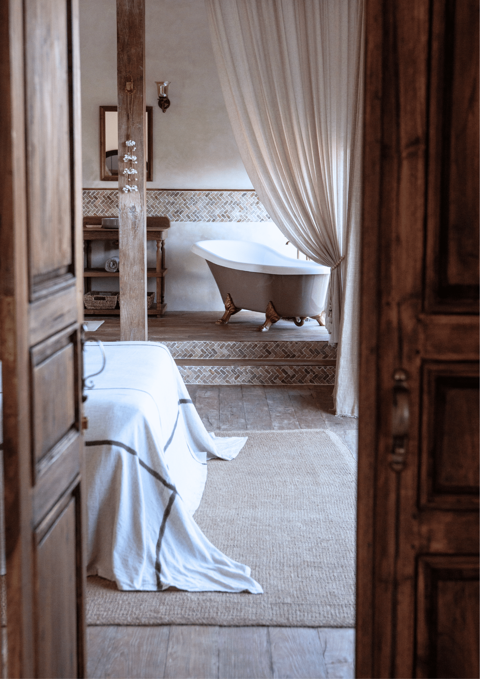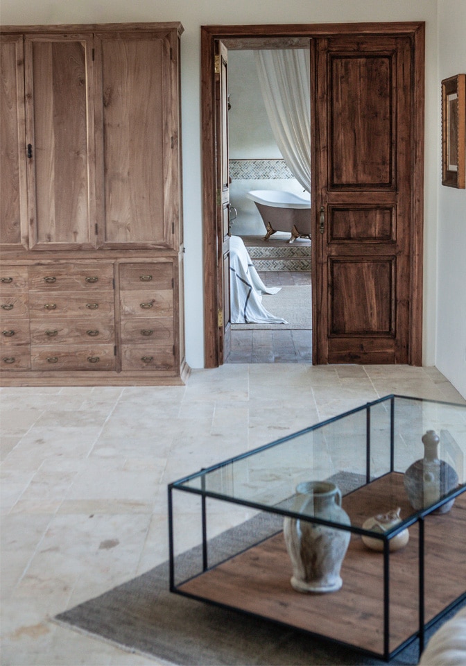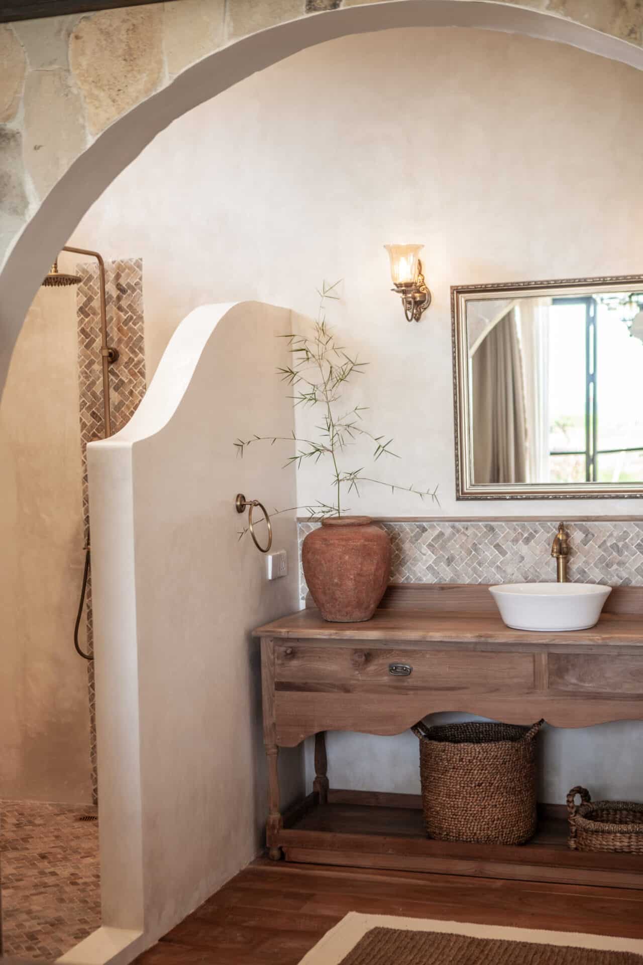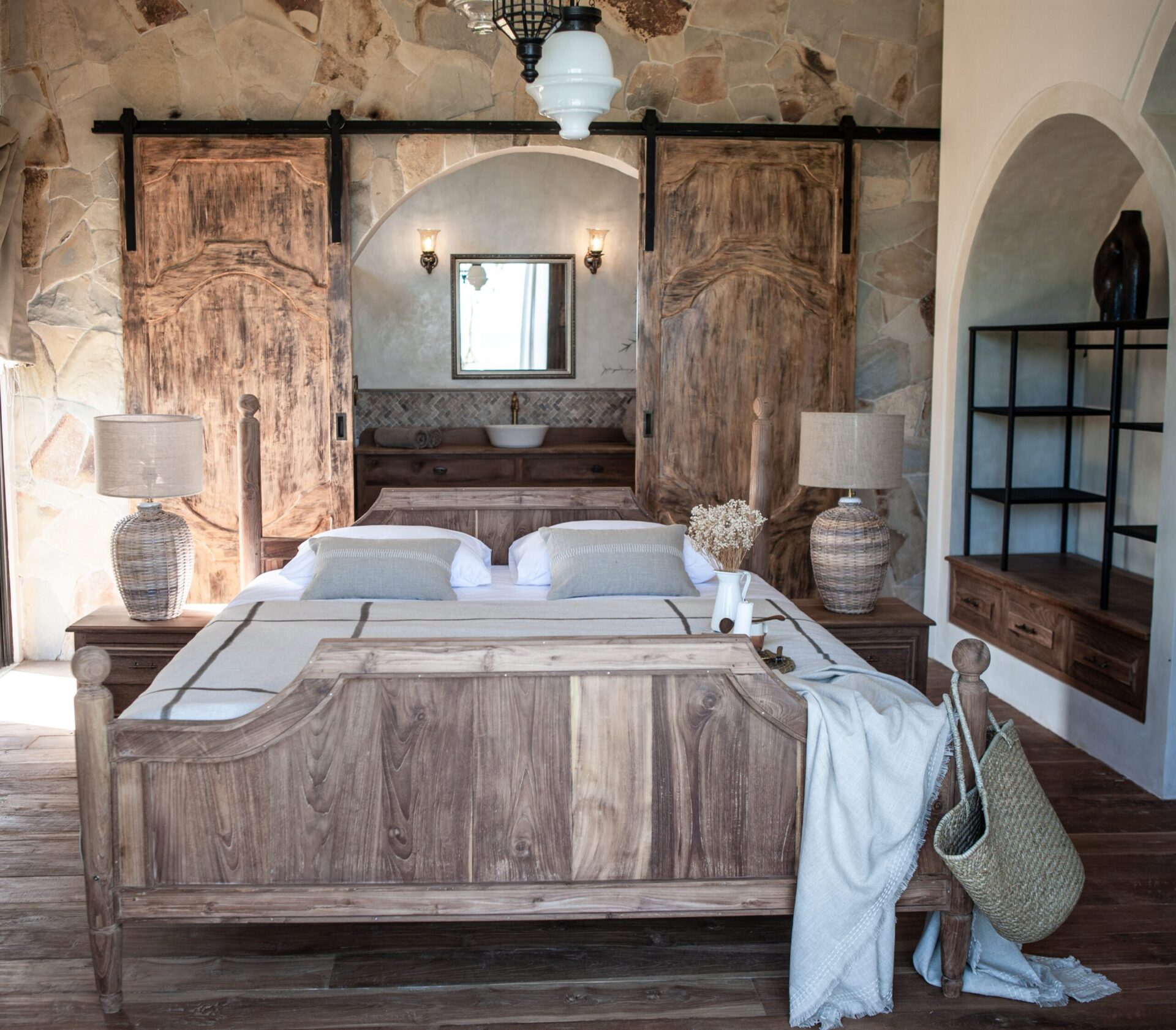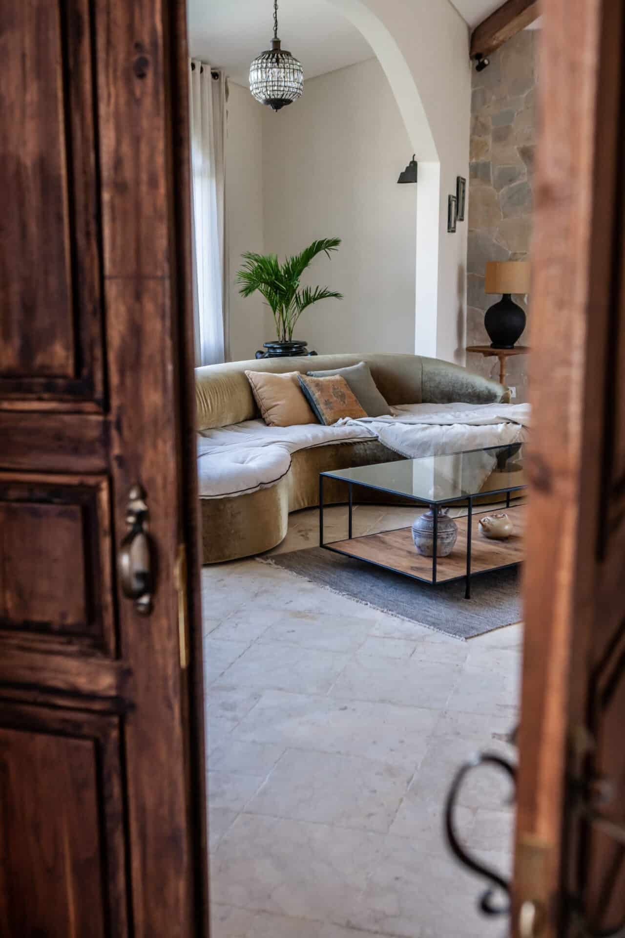 Natural stone walls, lime washed surfaces, warm timber flooring, and soft neutral textiles define the interior language. The palette draws from sun bleached landscapes with tones of sand, olive green, warm white, aged brass, and weathered wood. Texture and craftsmanship take precedence over ornament, allowing materials to shape the atmosphere.