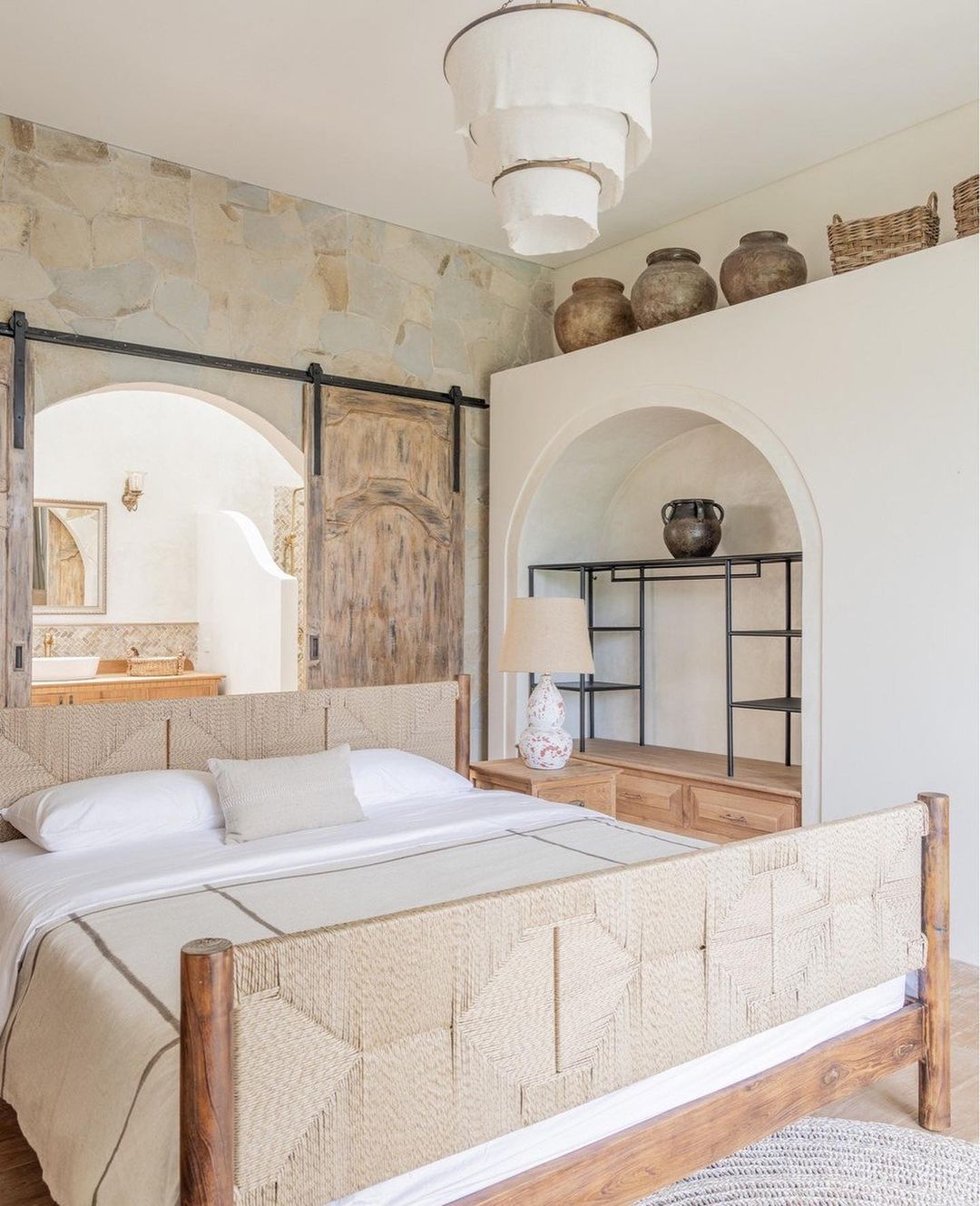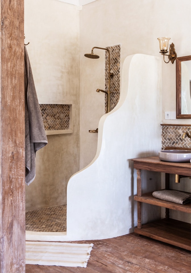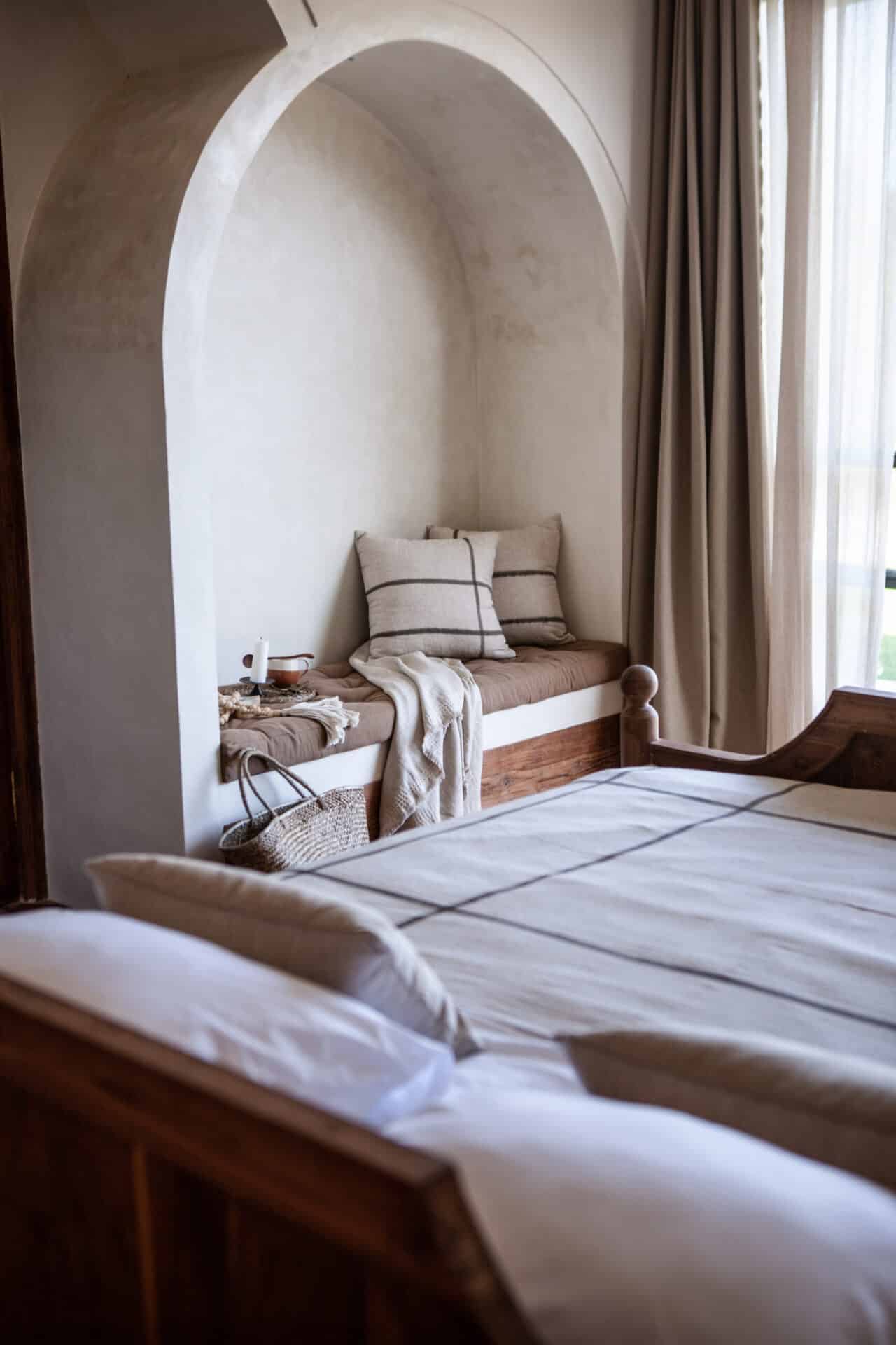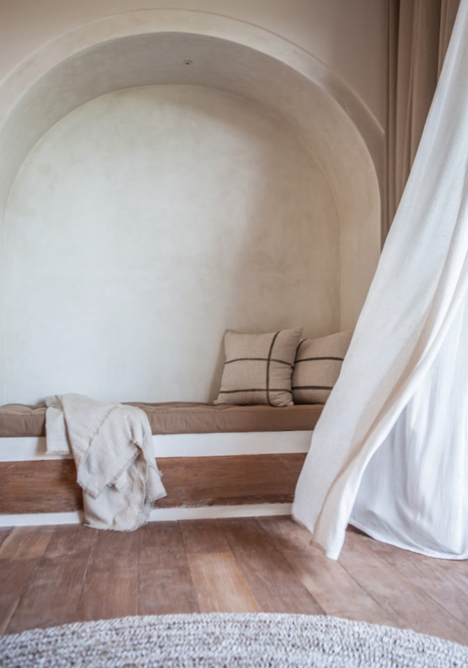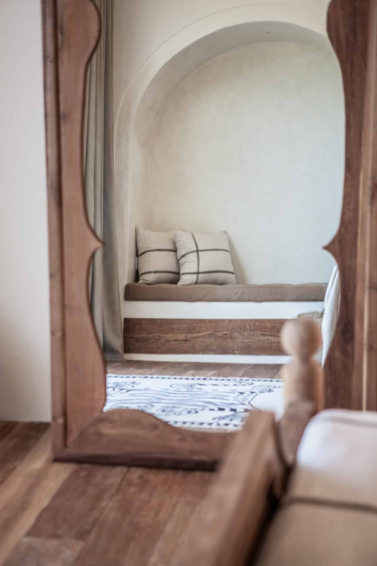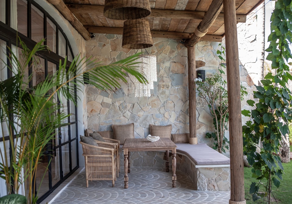 Natural stone walls, lime washed surfaces, warm timber flooring, and soft neutral textiles define the interior language. The palette draws from sun bleached landscapes with tones of sand, olive green, warm white, aged brass, and weathered wood. Texture and craftsmanship take precedence over ornament, allowing materials to shape the atmosphere.