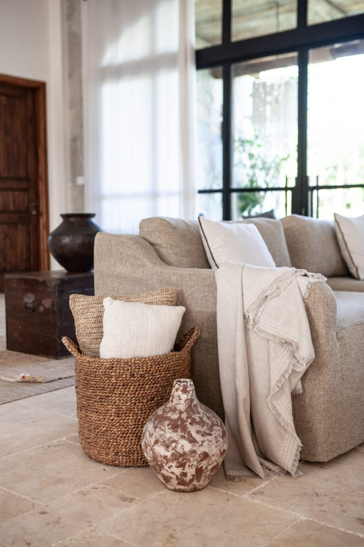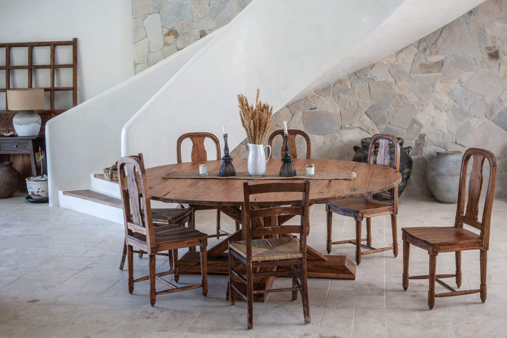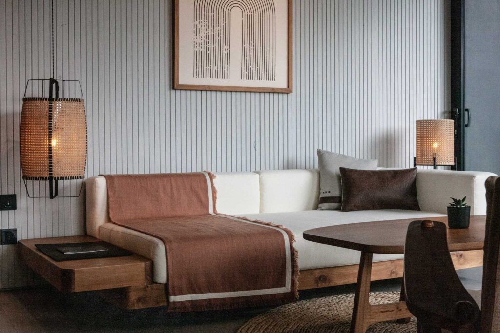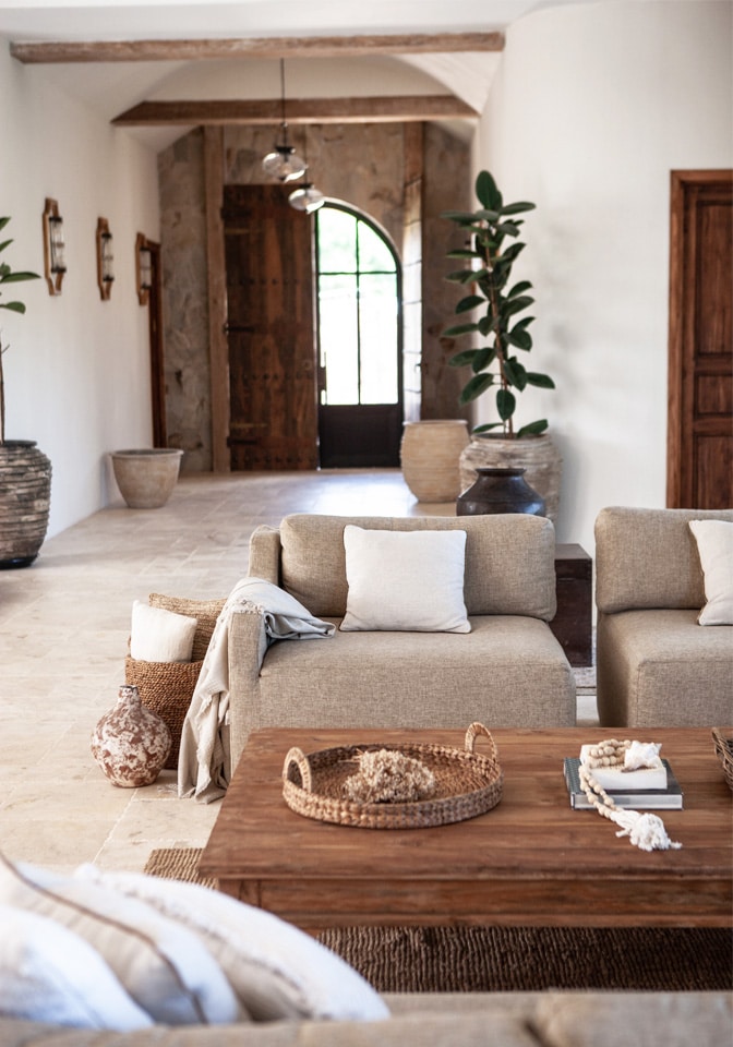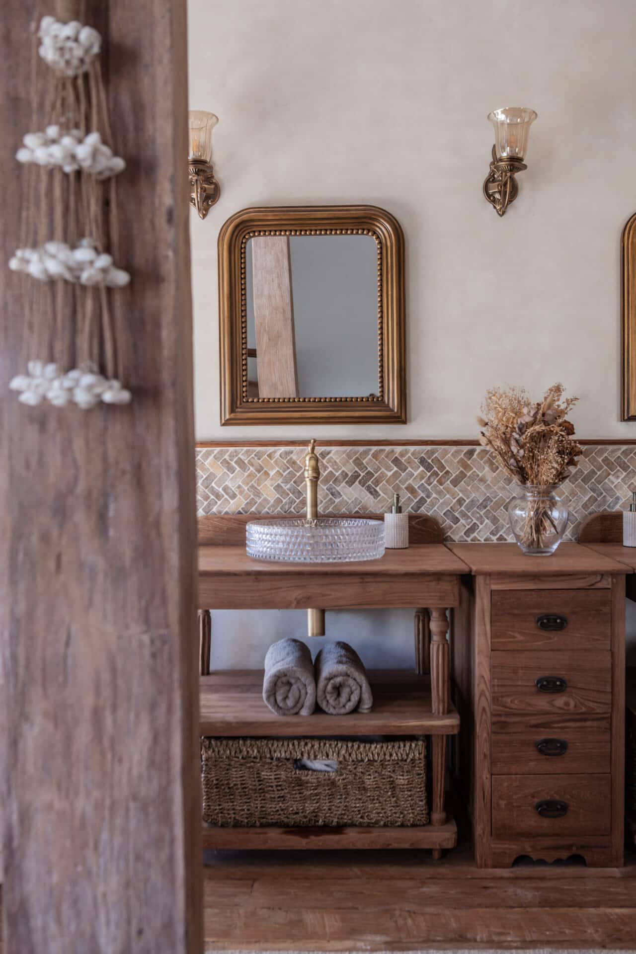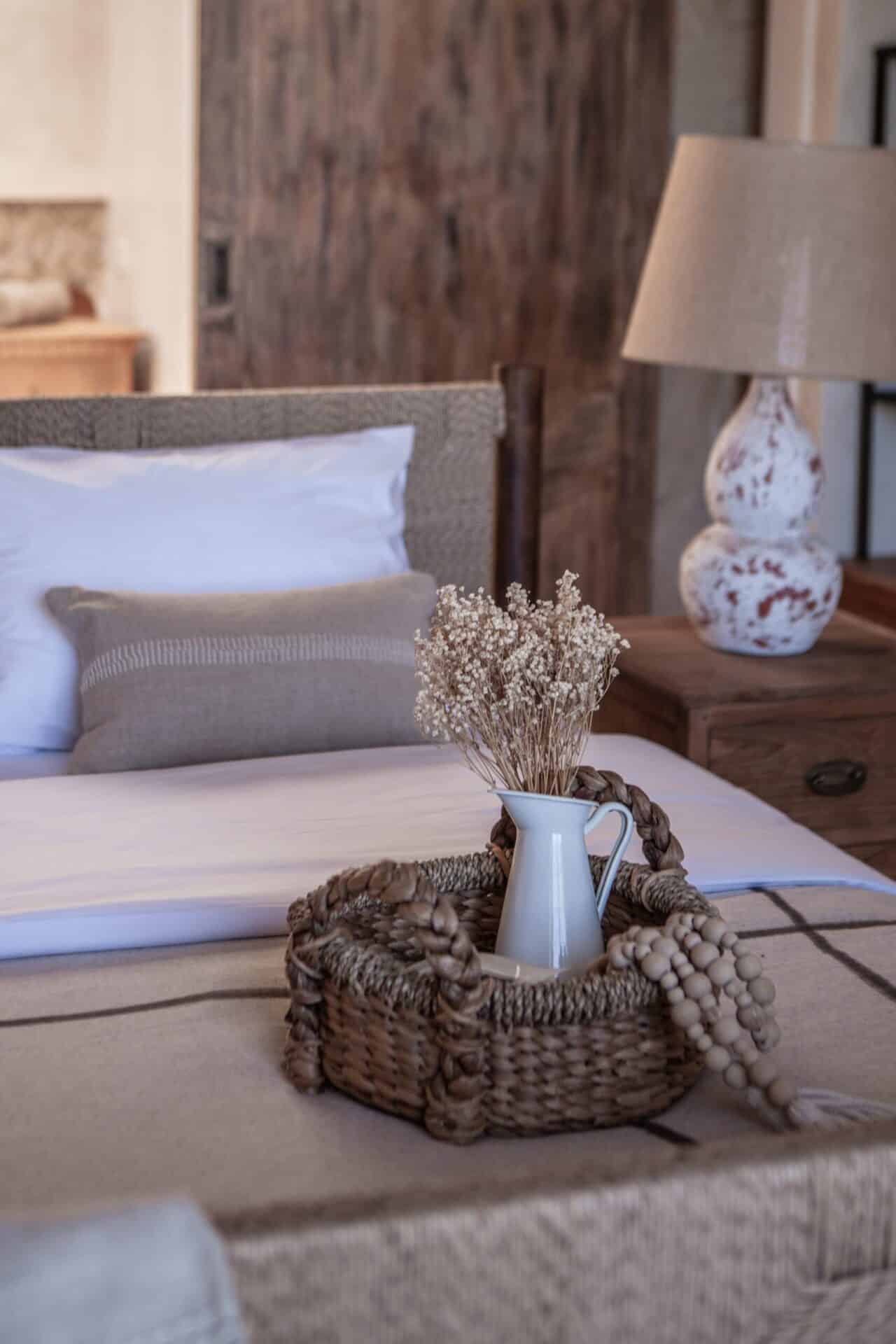 Natural stone walls, lime washed surfaces, warm timber flooring, and soft neutral textiles define the interior language. The palette draws from sun bleached landscapes with tones of sand, olive green, warm white, aged brass, and weathered wood. Texture and craftsmanship take precedence over ornament, allowing materials to shape the atmosphere.