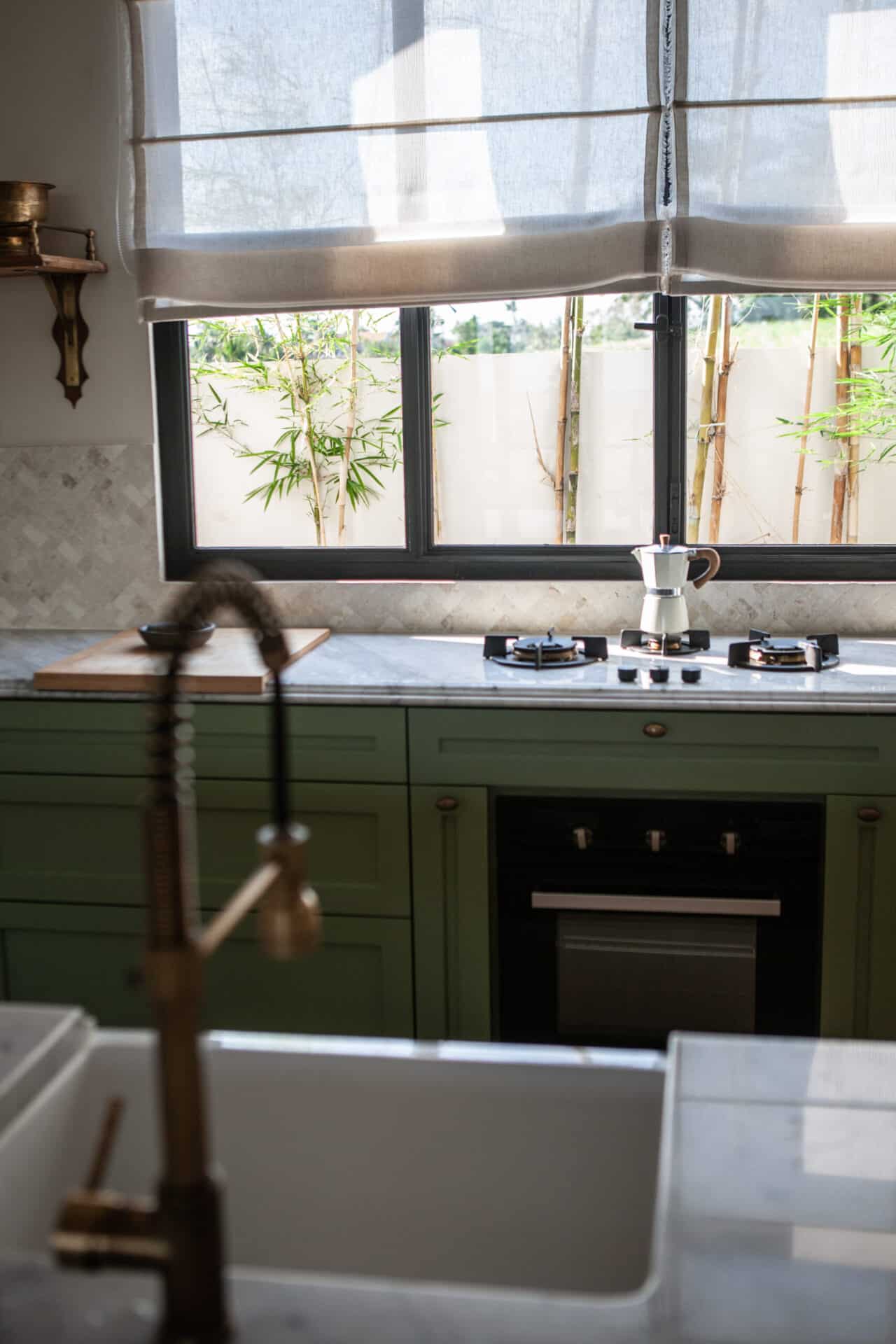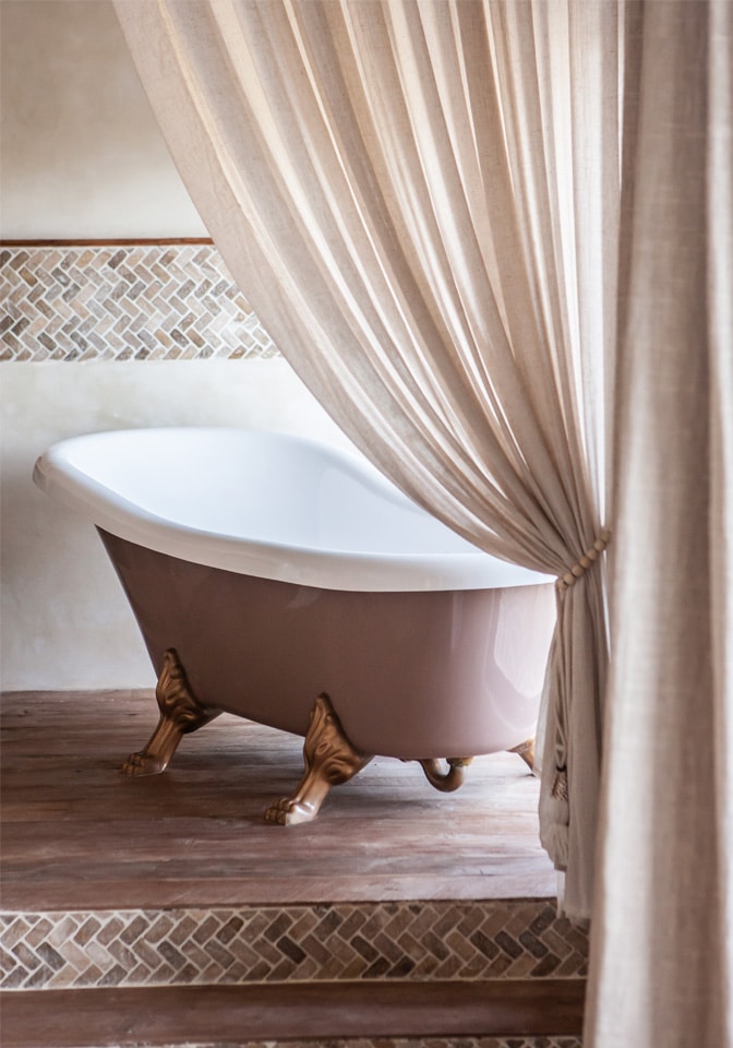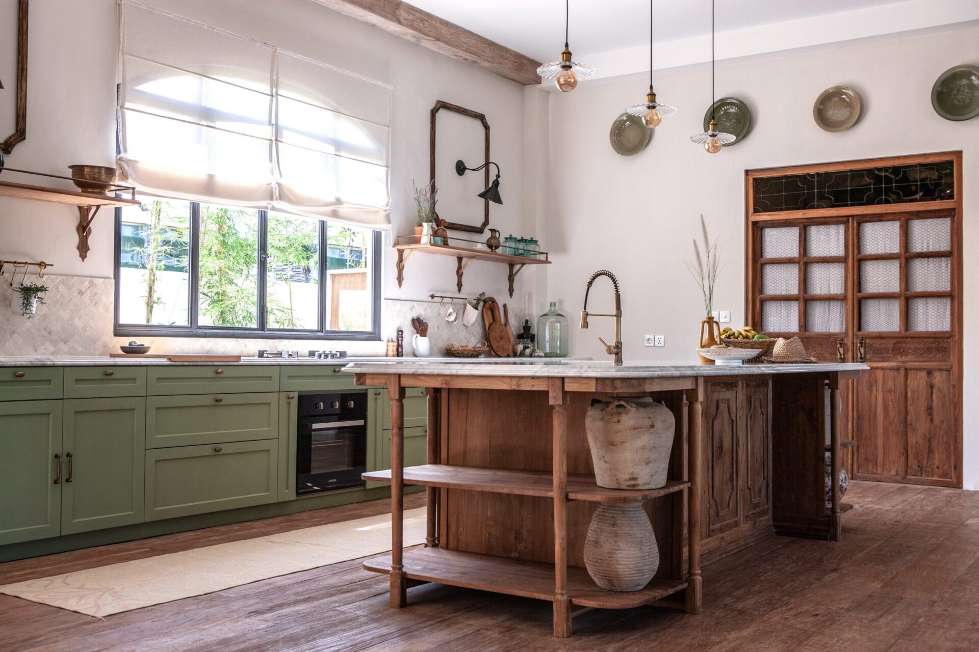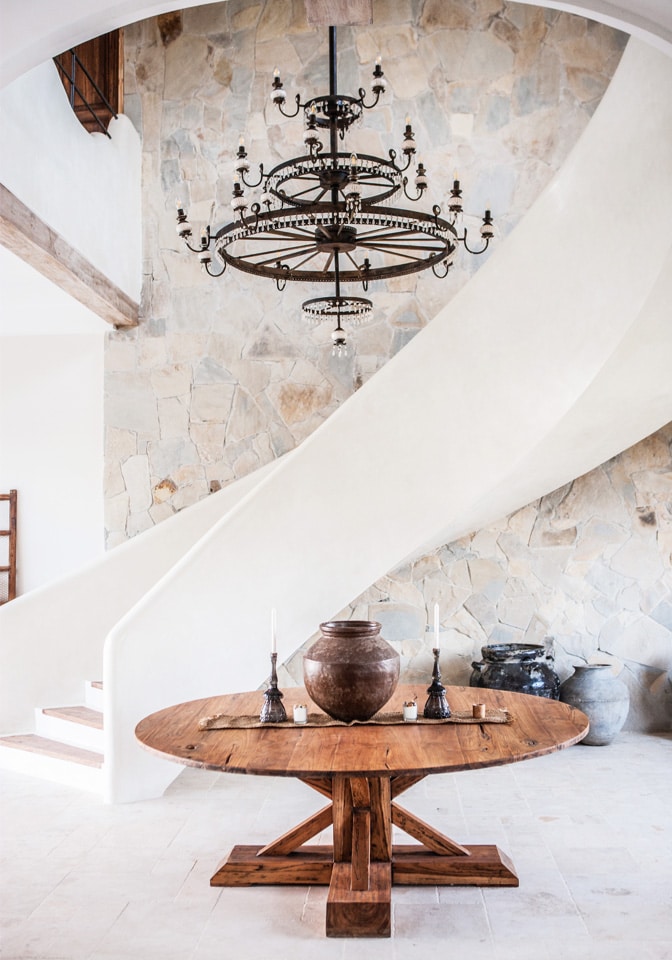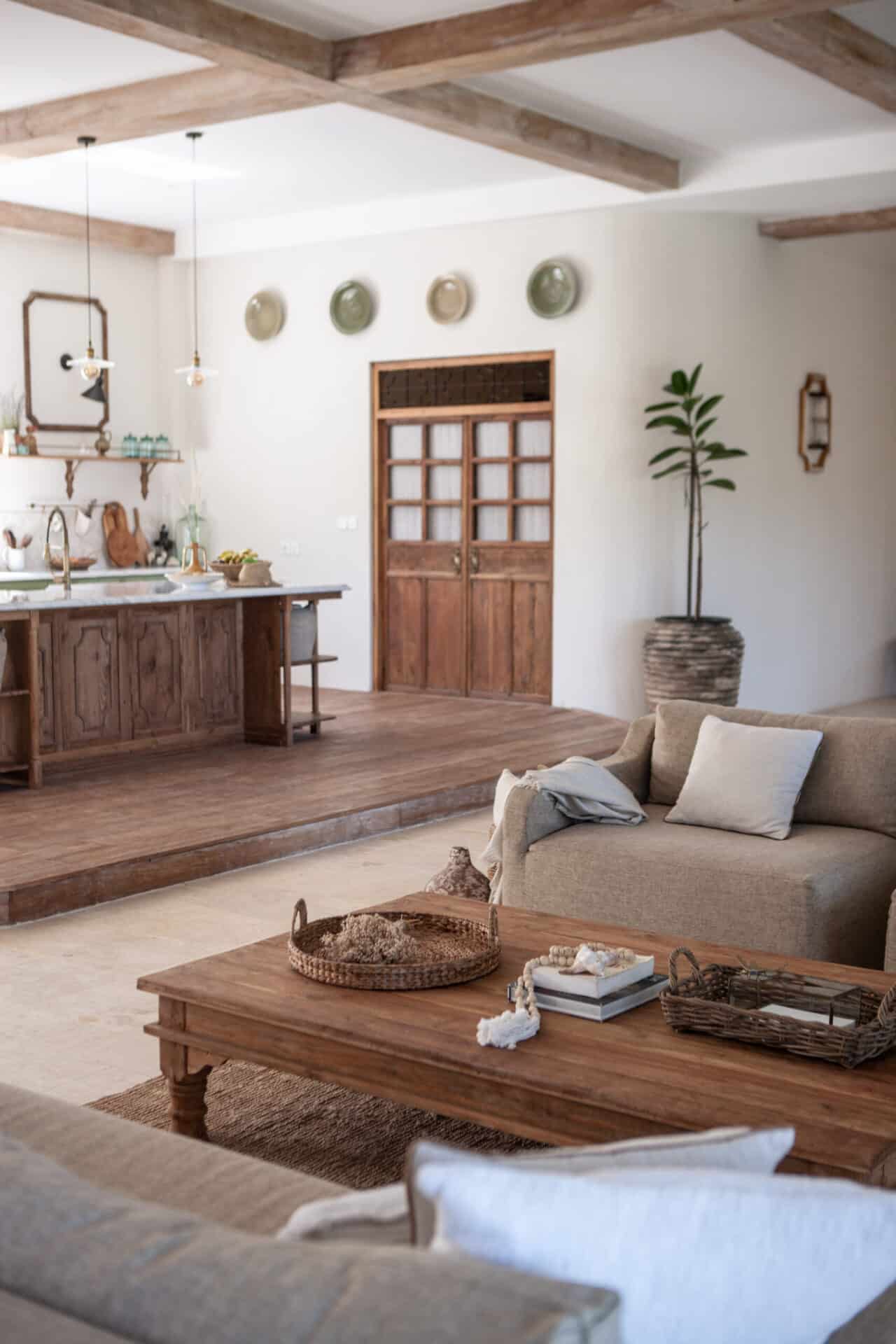 Natural stone walls, lime washed surfaces, warm timber flooring, and soft neutral textiles define the interior language. The palette draws from sun bleached landscapes with tones of sand, olive green, warm white, aged brass, and weathered wood. Texture and craftsmanship take precedence over ornament, allowing materials to shape the atmosphere.