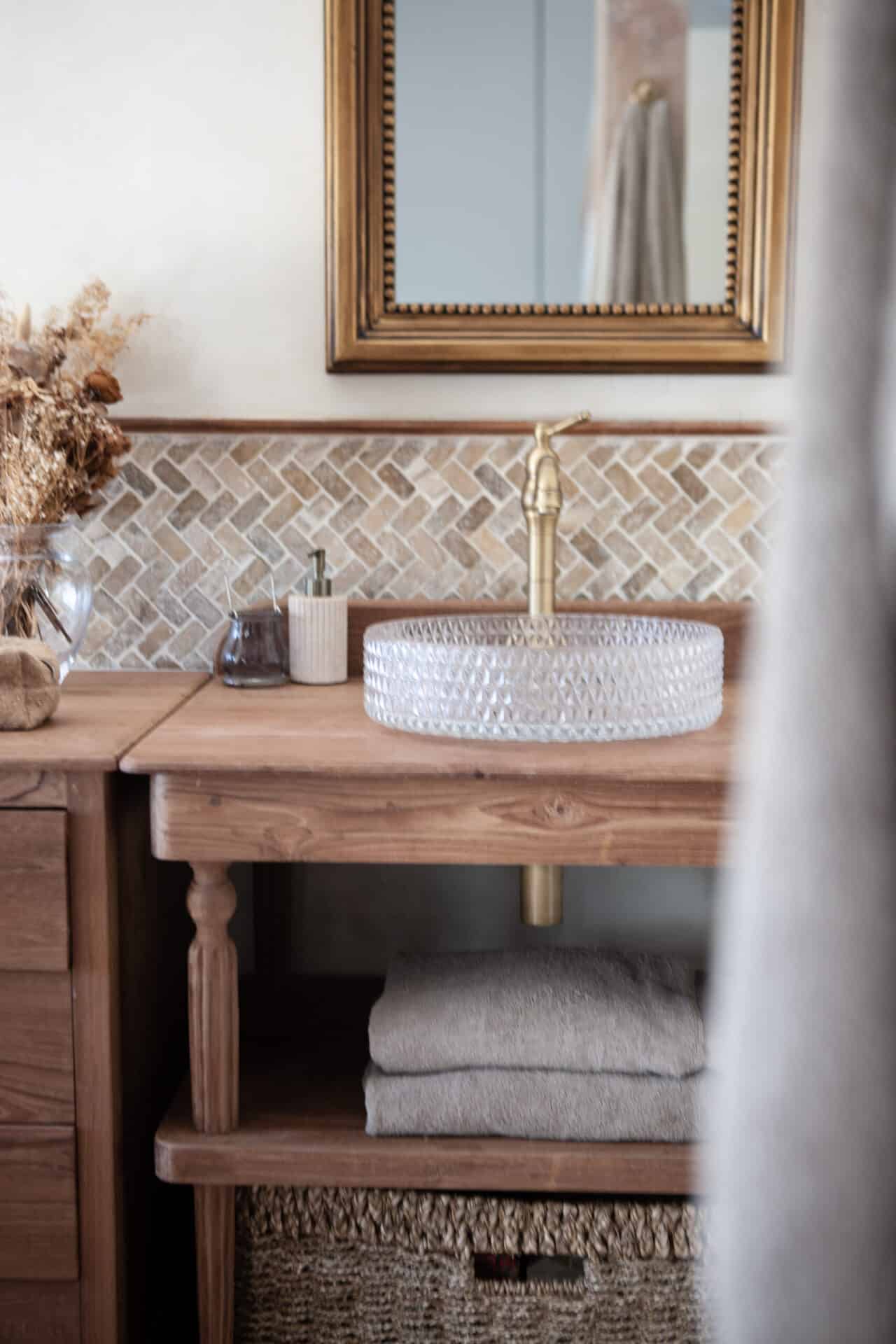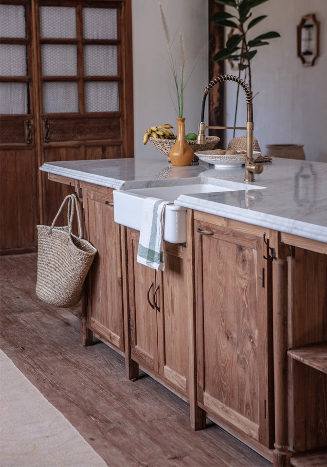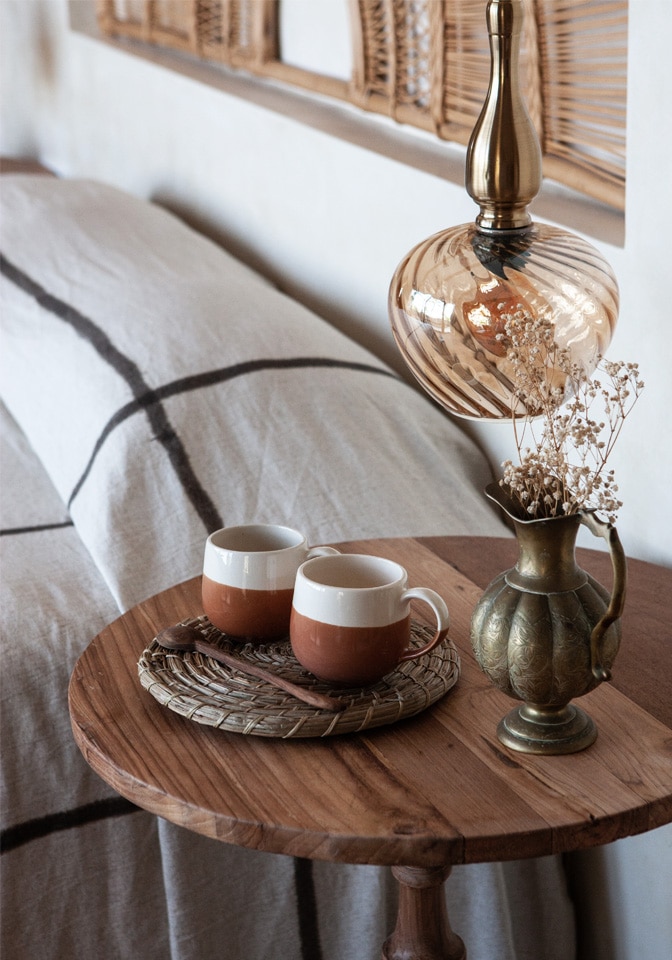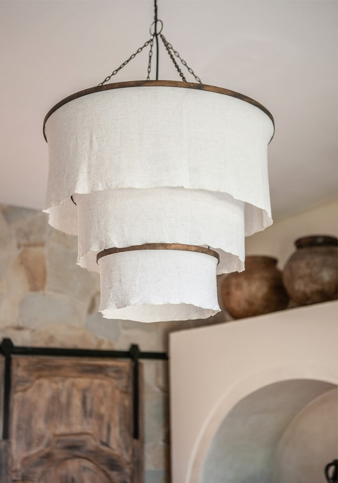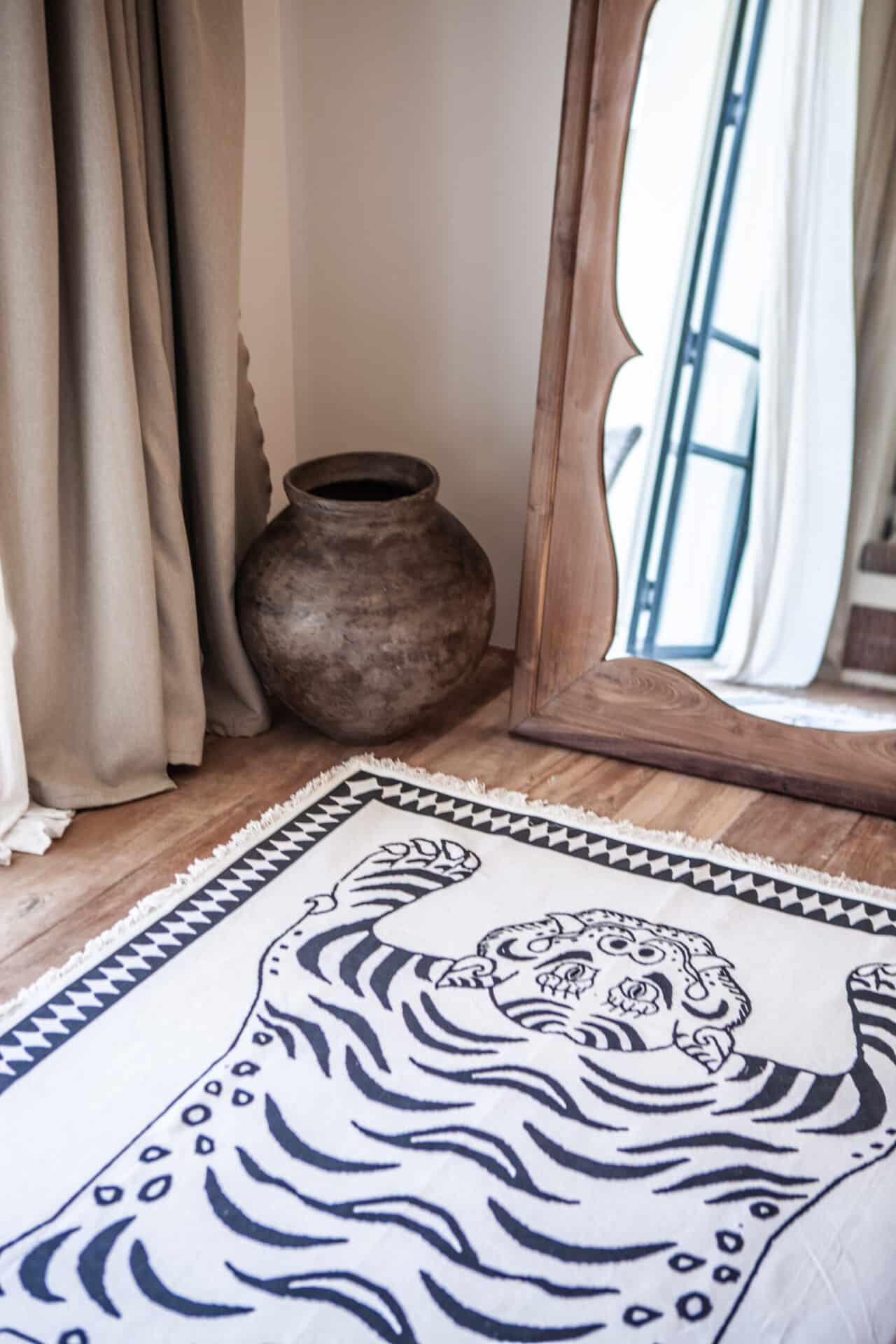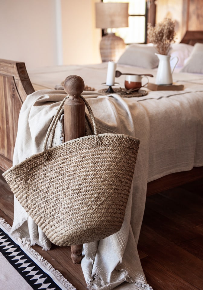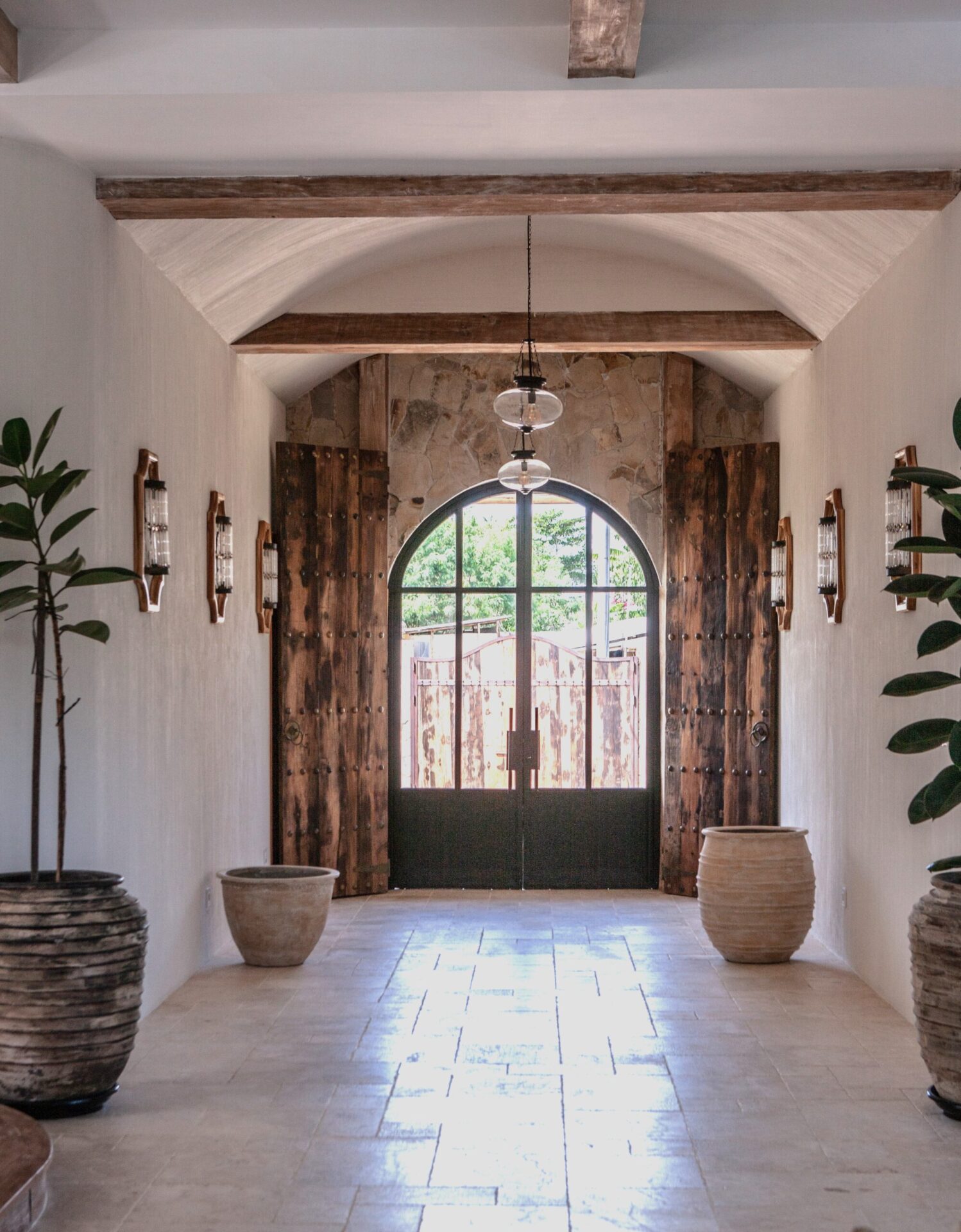 Natural stone walls, lime washed surfaces, warm timber flooring, and soft neutral textiles define the interior language. The palette draws from sun bleached landscapes with tones of sand, olive green, warm white, aged brass, and weathered wood. Texture and craftsmanship take precedence over ornament, allowing materials to shape the atmosphere.