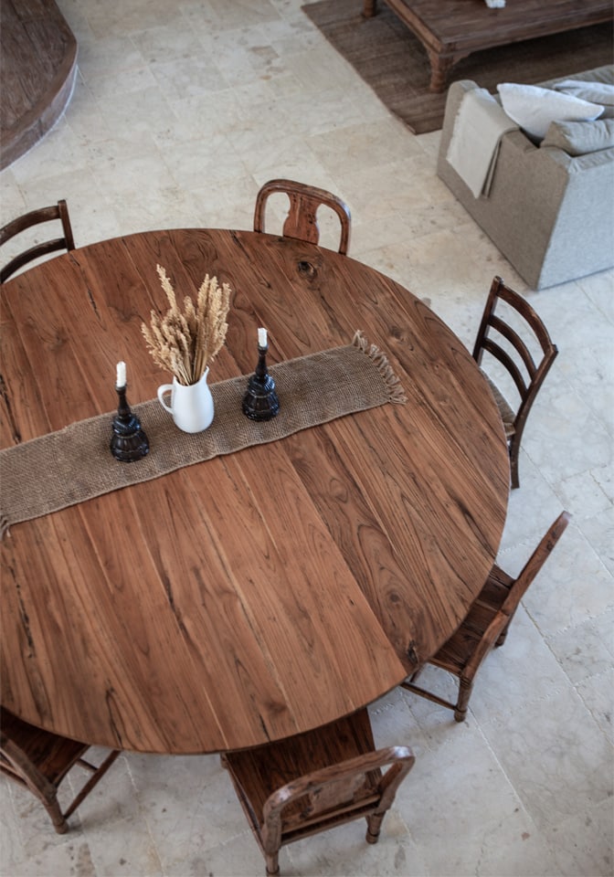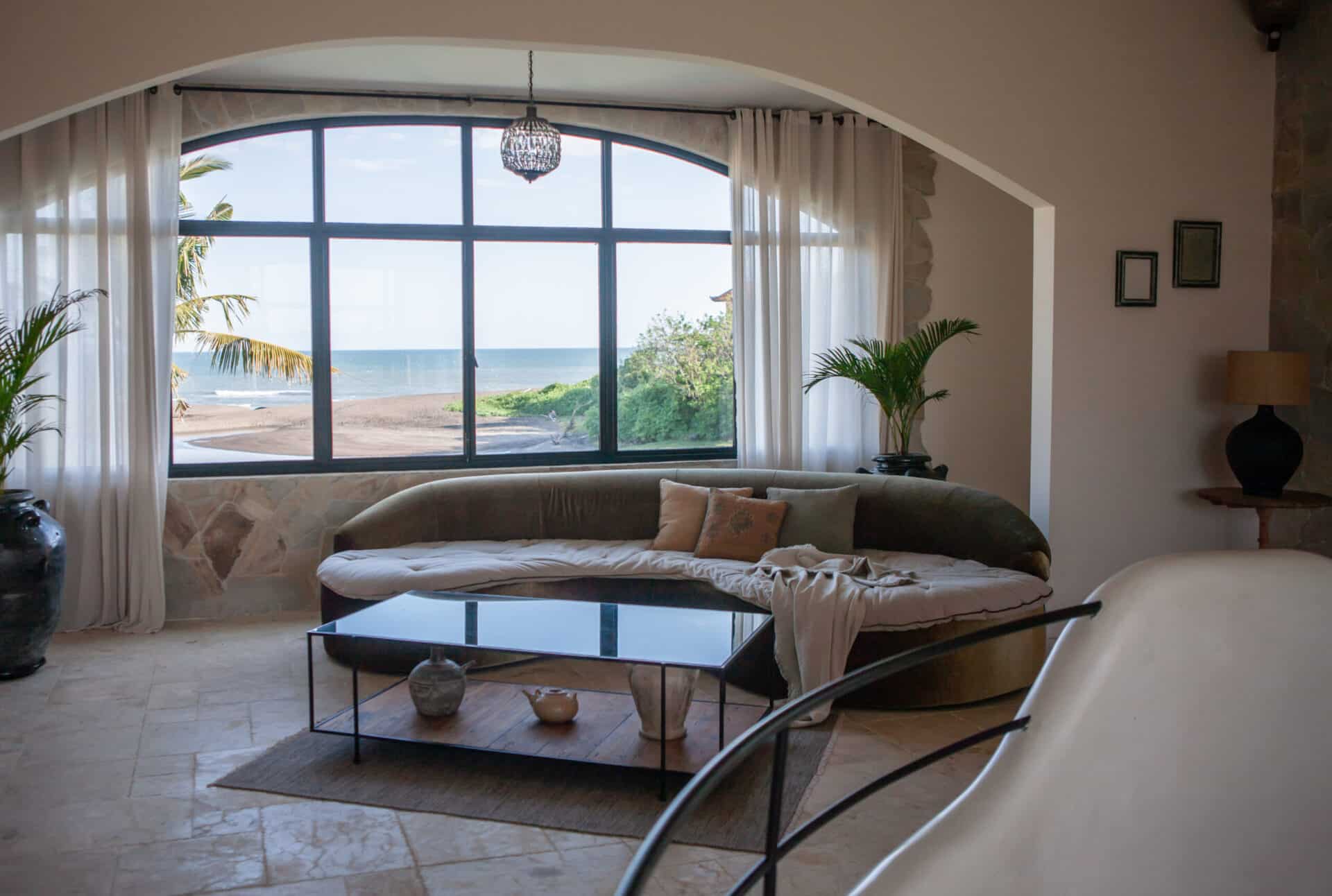 Large steel framed windows invite natural light into the spaces and frame garden views beyond. Arched openings and solid timber doors introduce architectural depth while maintaining simplicity. Throughout the villa, furniture remains generous in proportion yet restrained in detail, reinforcing a sense of Mediterranean calm adapted thoughtfully to Bali’s tropical climate.