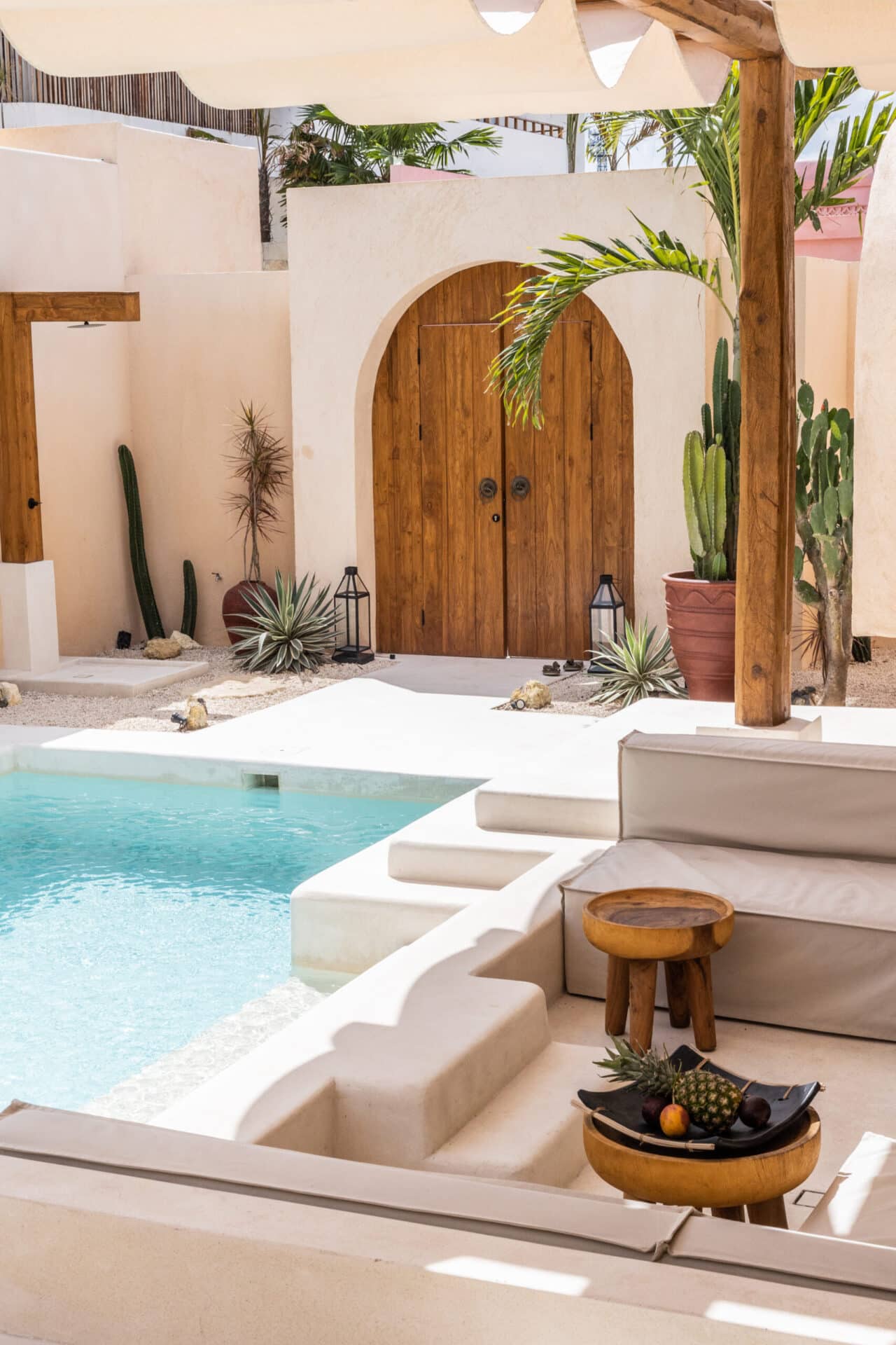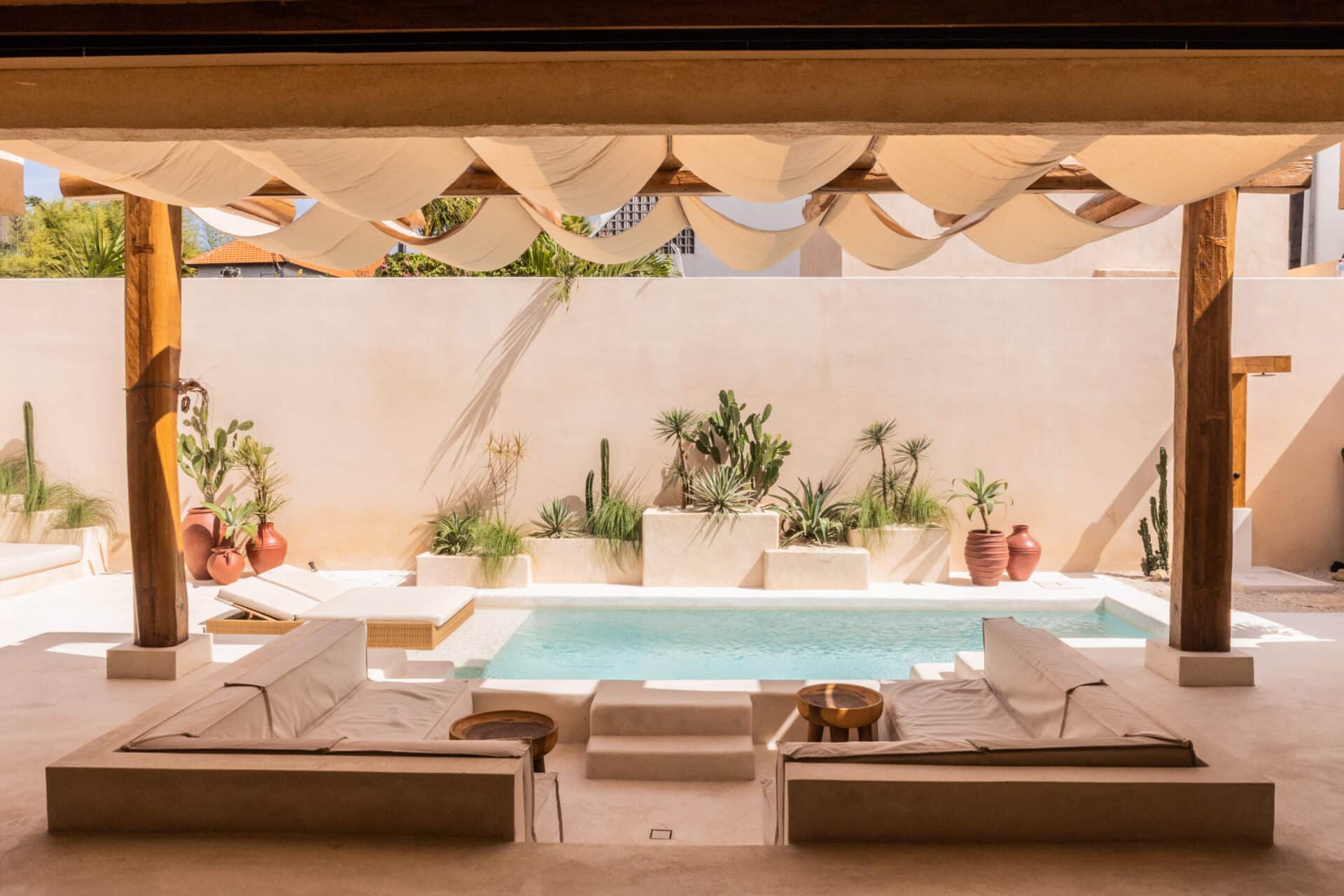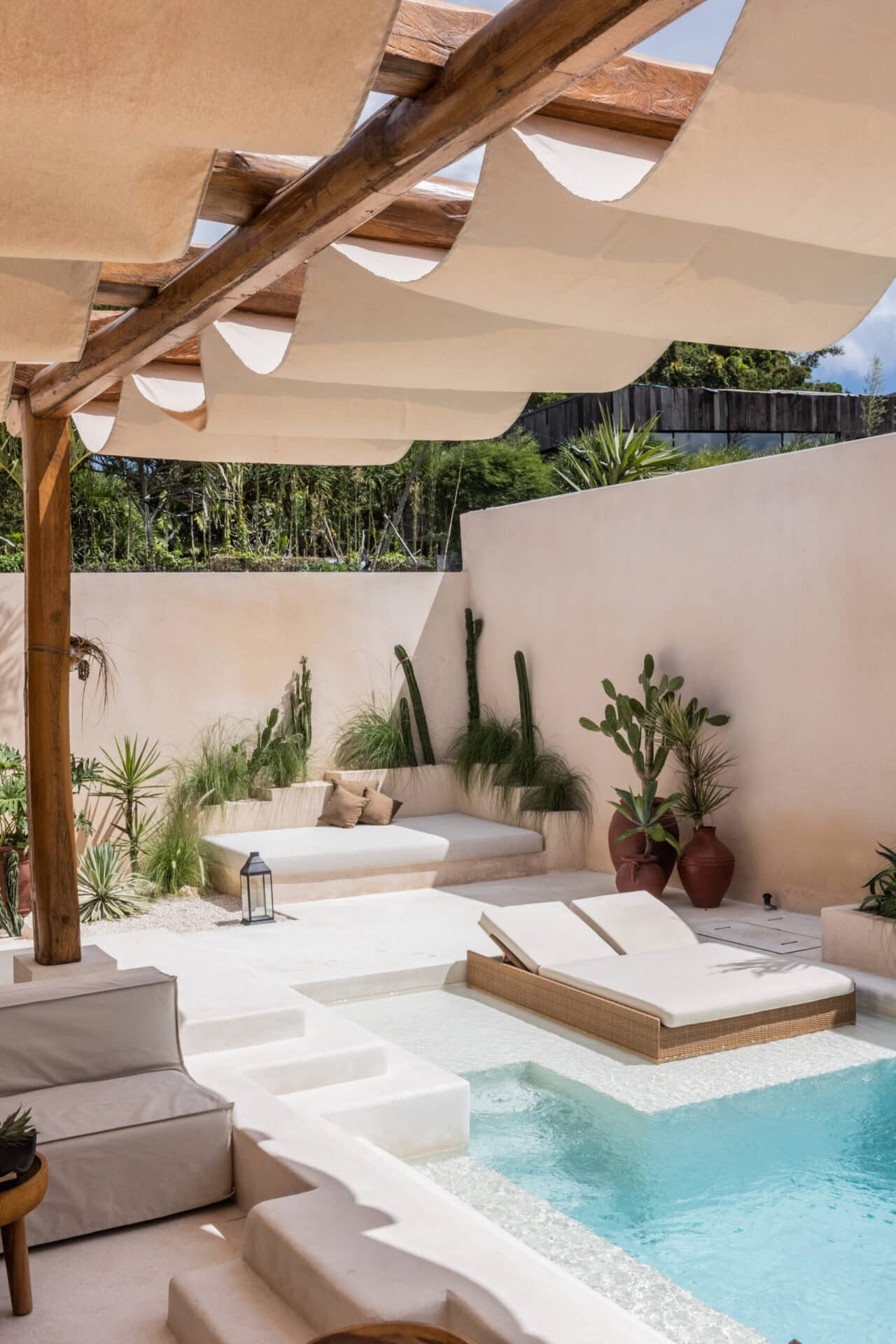 The central courtyard and private pool form the heart of the design, surrounded by desert style landscaping, sculpted white terraces, and handcrafted details. Pergola structures filter sunlight into shifting patterns, enhancing the tropical living experience while maintaining a strong architectural identity.