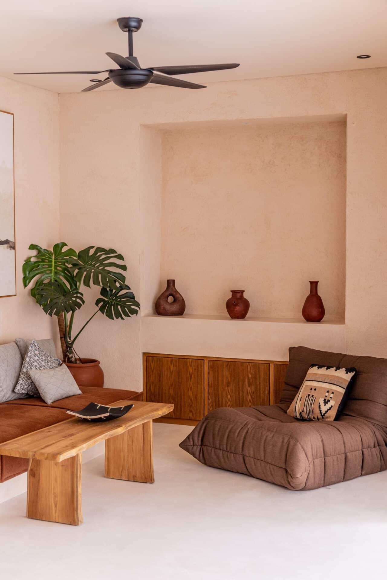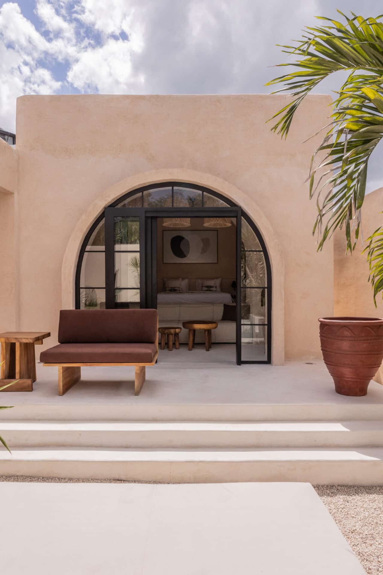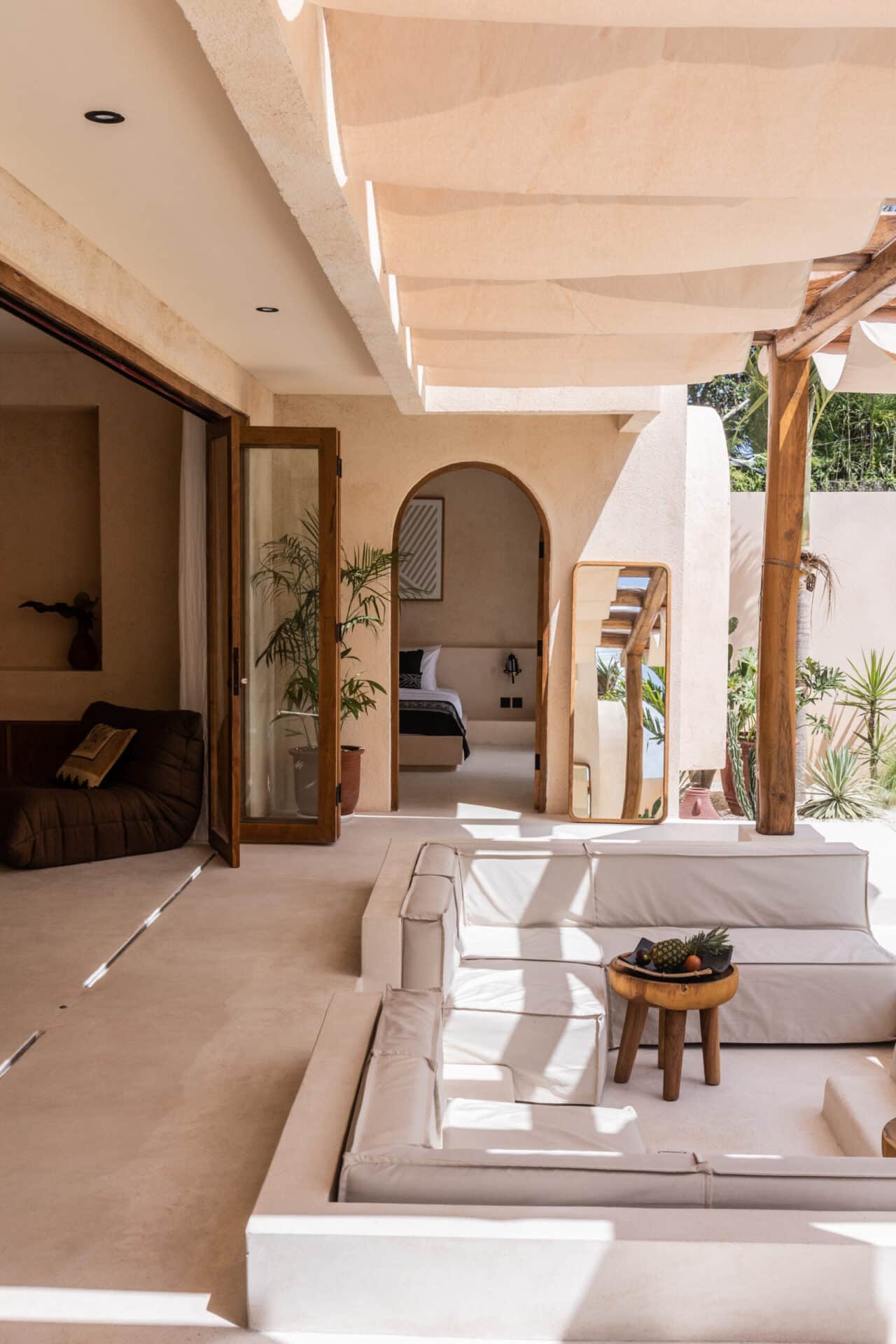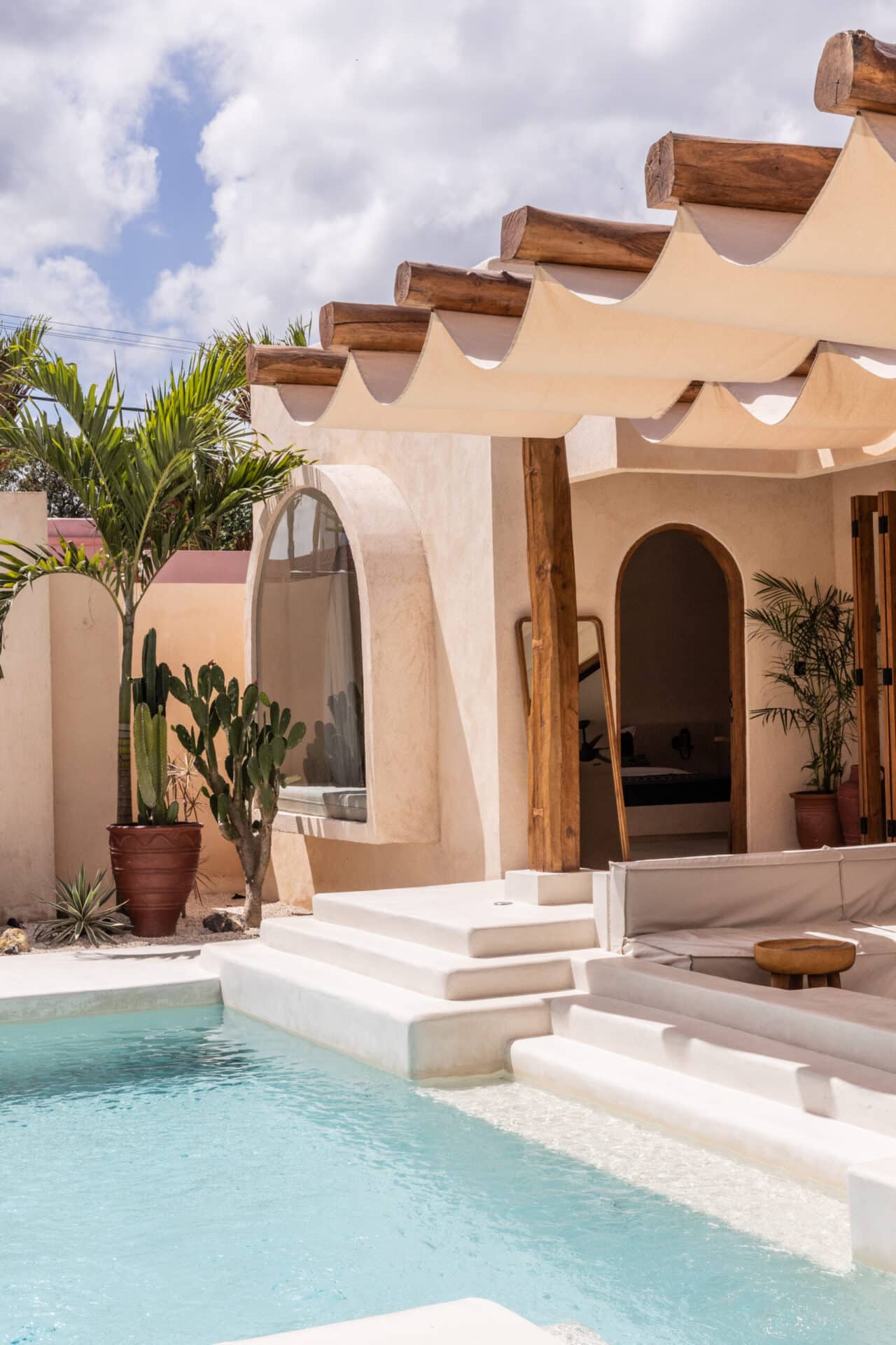 The central courtyard and private pool form the heart of the design, surrounded by desert style landscaping, sculpted white terraces, and handcrafted details. Pergola structures filter sunlight into shifting patterns, enhancing the tropical living experience while maintaining a strong architectural identity.