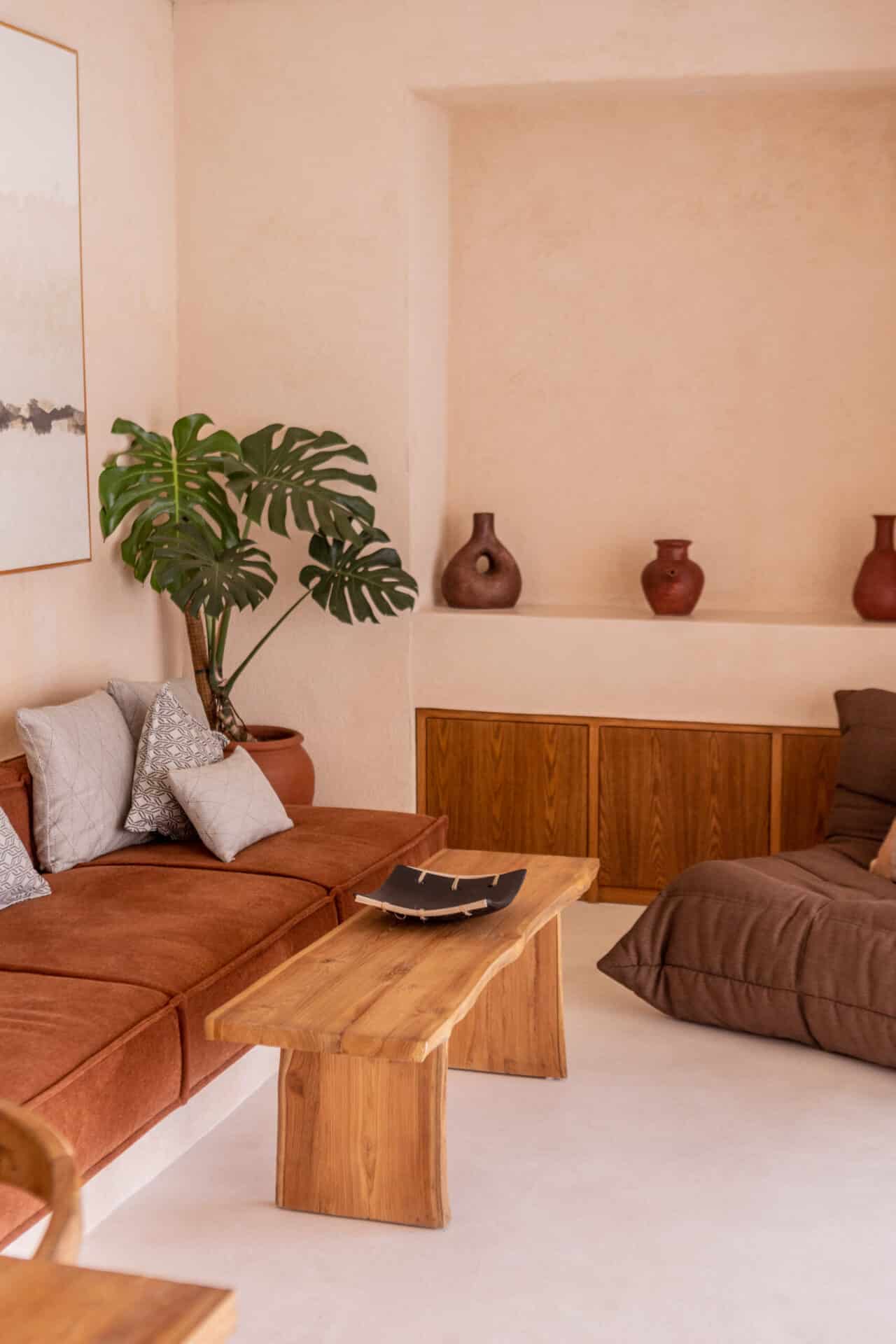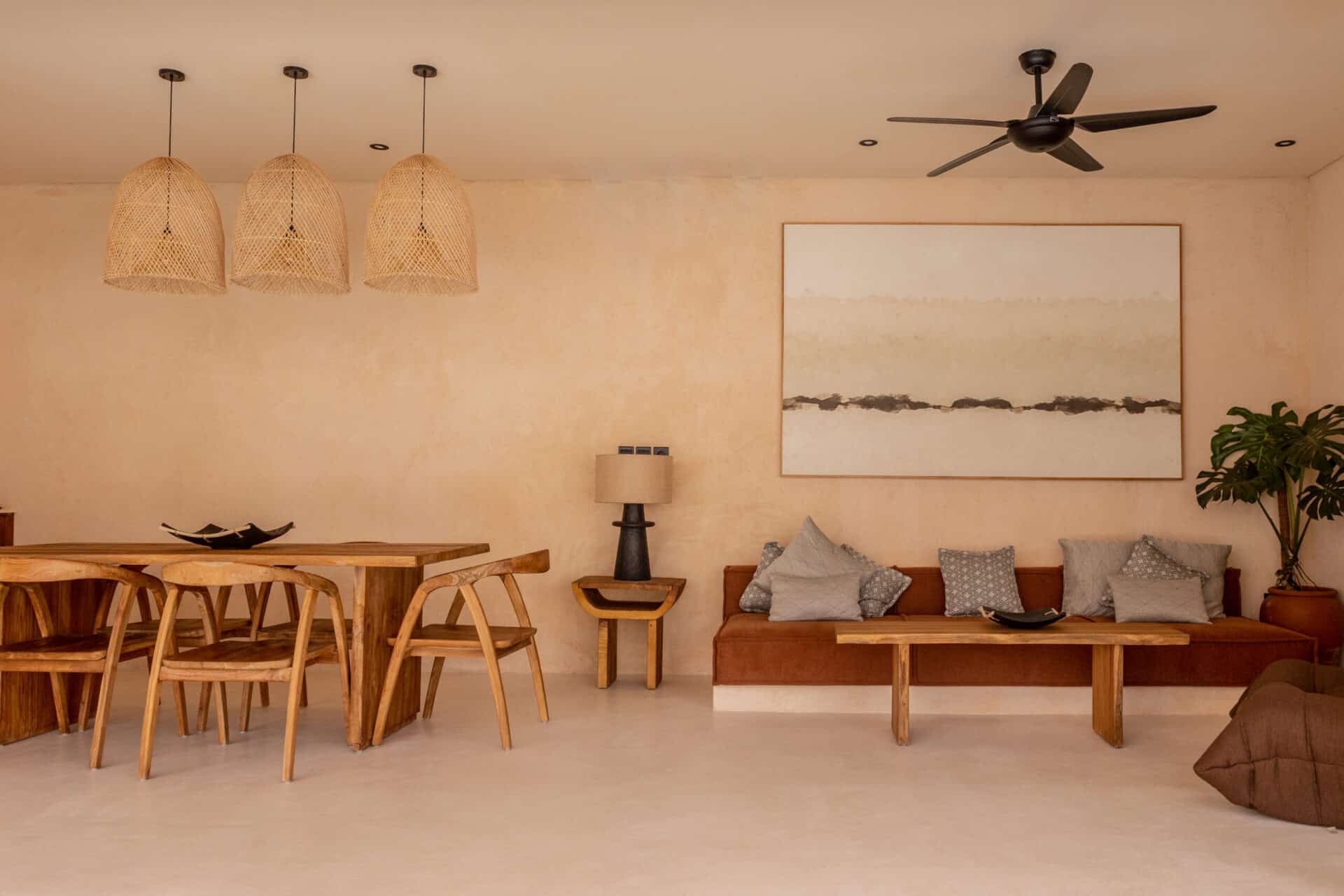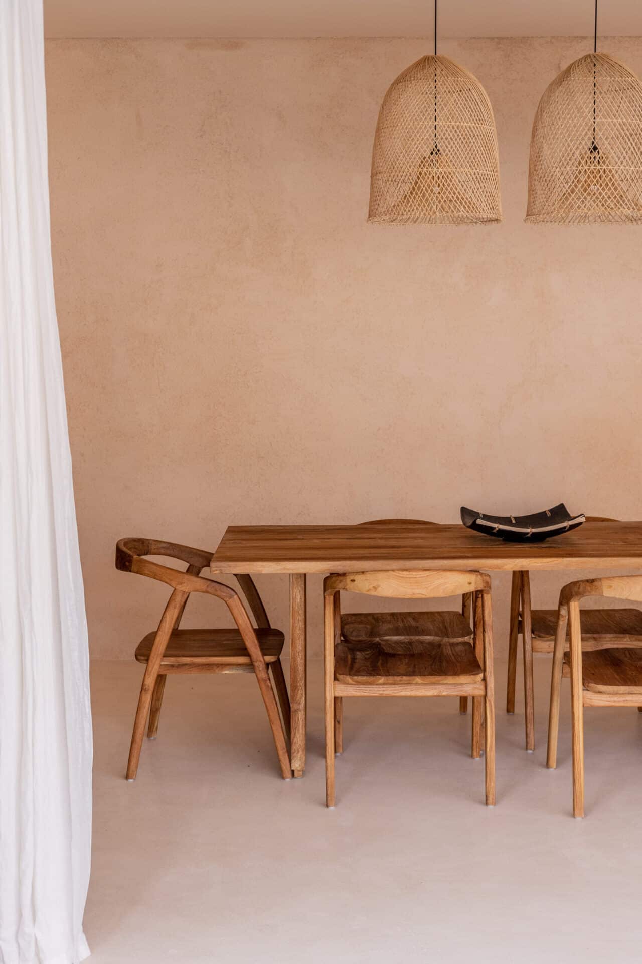Inside, the villa embraces natural materials such as lime washed plaster, solid wood furniture, linen textiles, and stone surfaces. This residential interior design project in Bali balances Moroccan character with Mediterranean restraint, creating a calm and cohesive space suited for modern tropical living.