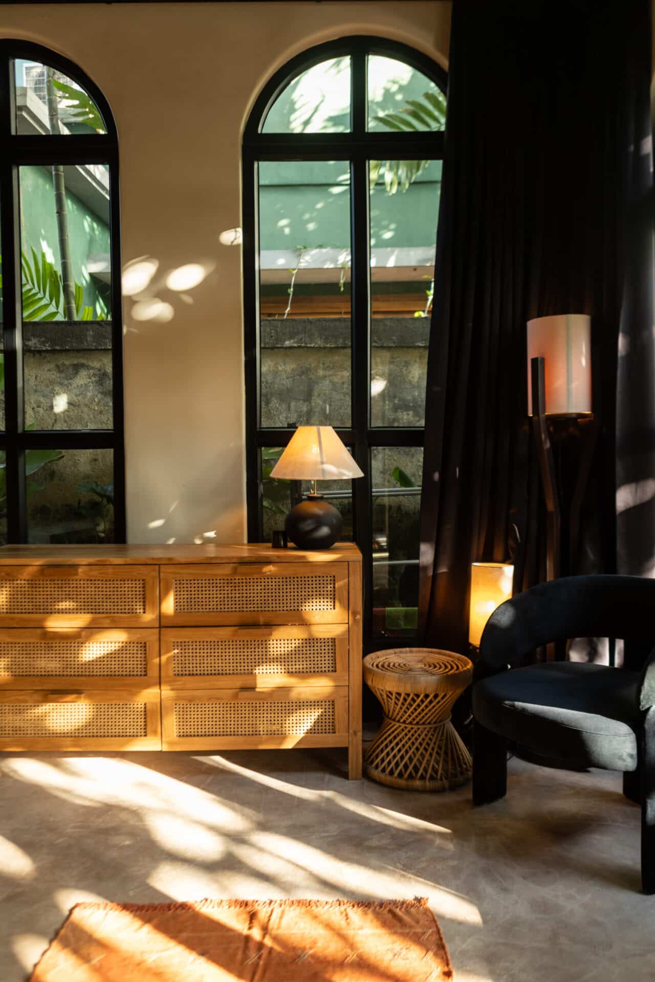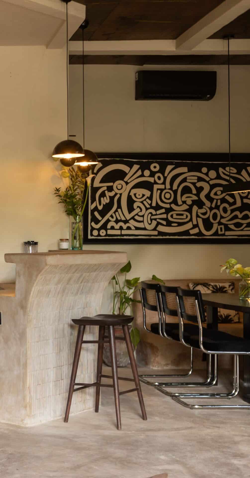 Our design philosophy for Villa Saki was to create a sanctuary that feels both timeless and deeply personal. We integrated lush indoor greenery and tall, weathered clay amphorae to bridge the gap between the structured interior and the wild, tropical beauty visible through the glass. Whether you are resting in the bedroom under the soft glow of pleated pendants or sharing a drink at the arched bar, the villa stands as a Paz Studio testament to the beauty of a life lived at the crossroads of different eras.