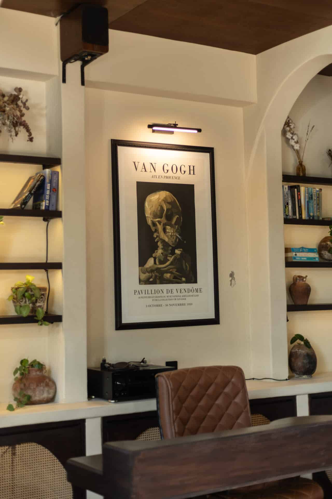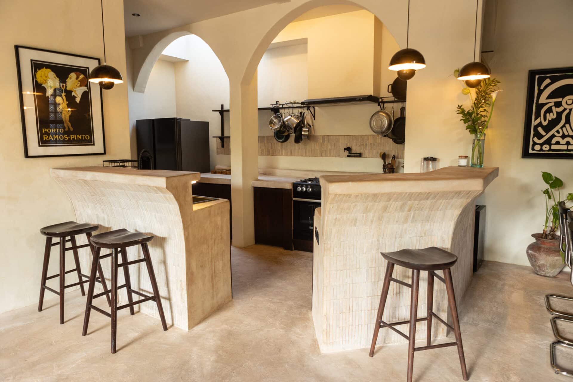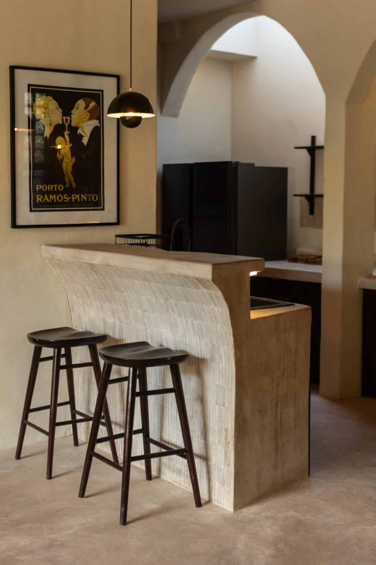The narrative of the villa is told through a curated collection of materials that celebrate both history and craftsmanship. We paired the dark, rich grains of walnut timber with tactile rattan accents and supple leather upholstery to create a layered, sensory experience. In the kitchen, sculptural, hand-tiled counters with dramatic curves serve as a functional centerpiece, while vintage-inspired posters and a classic record player setup invite a slower, more intentional pace of life. It is a space where every object, from the low-slung lounge chairs to the arched steel-framed windows, feels like a deliberate piece of a larger artistic puzzle.