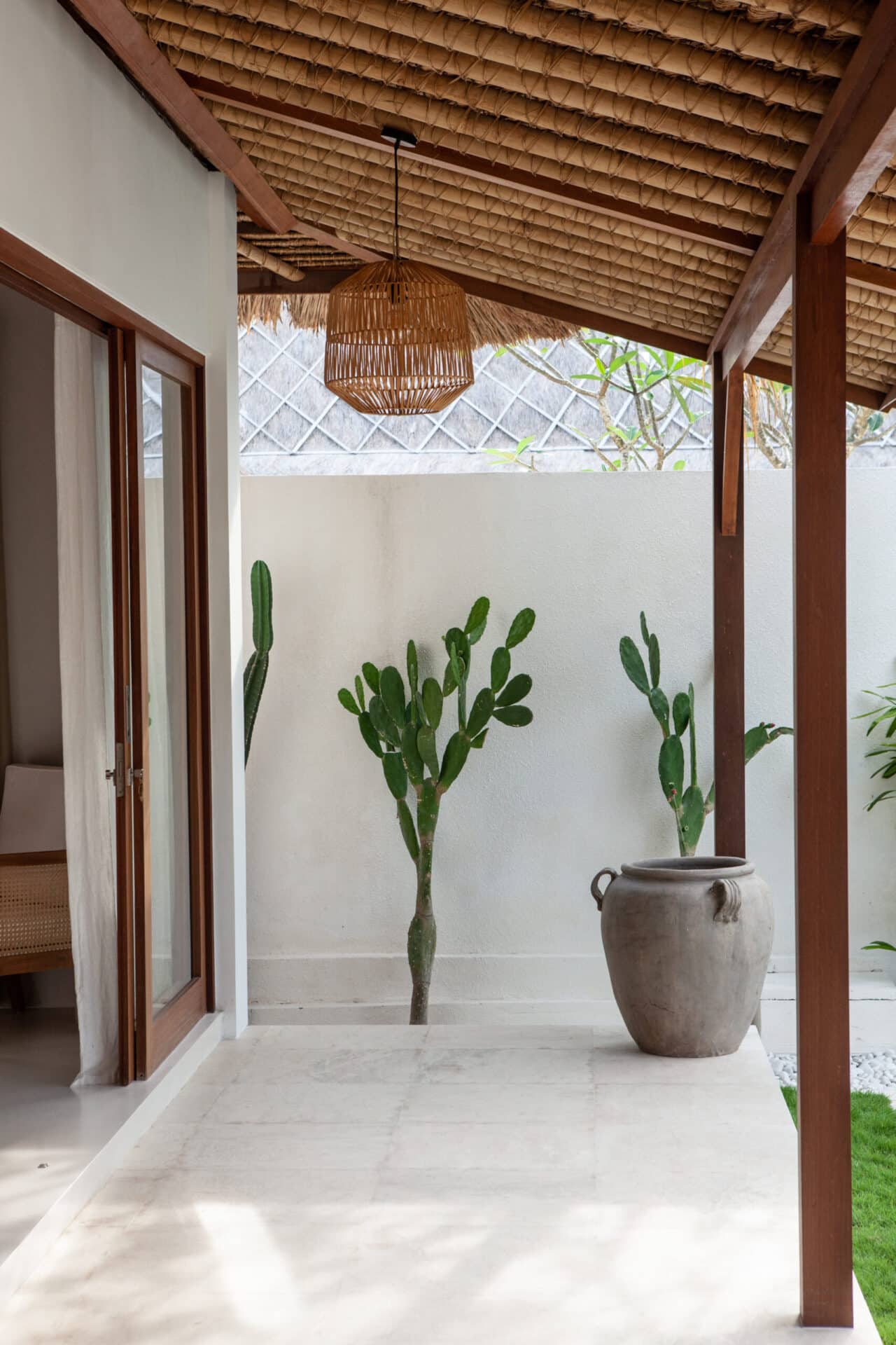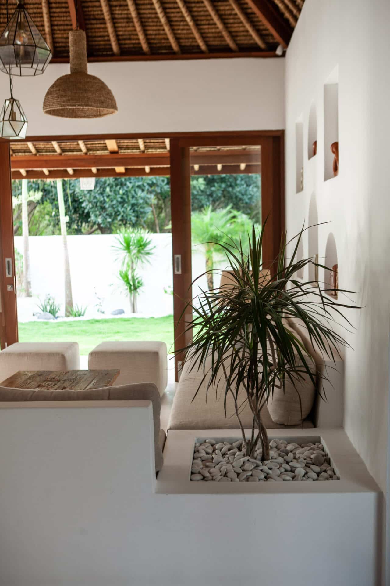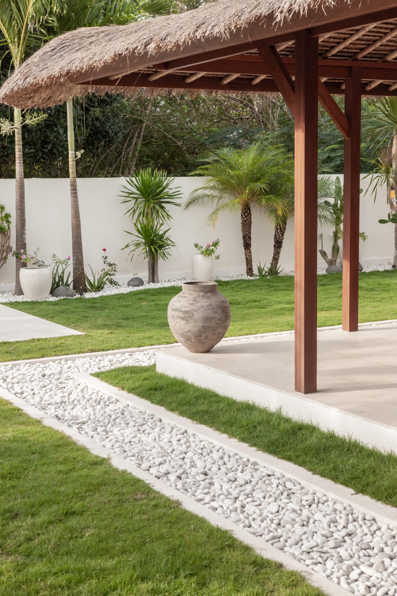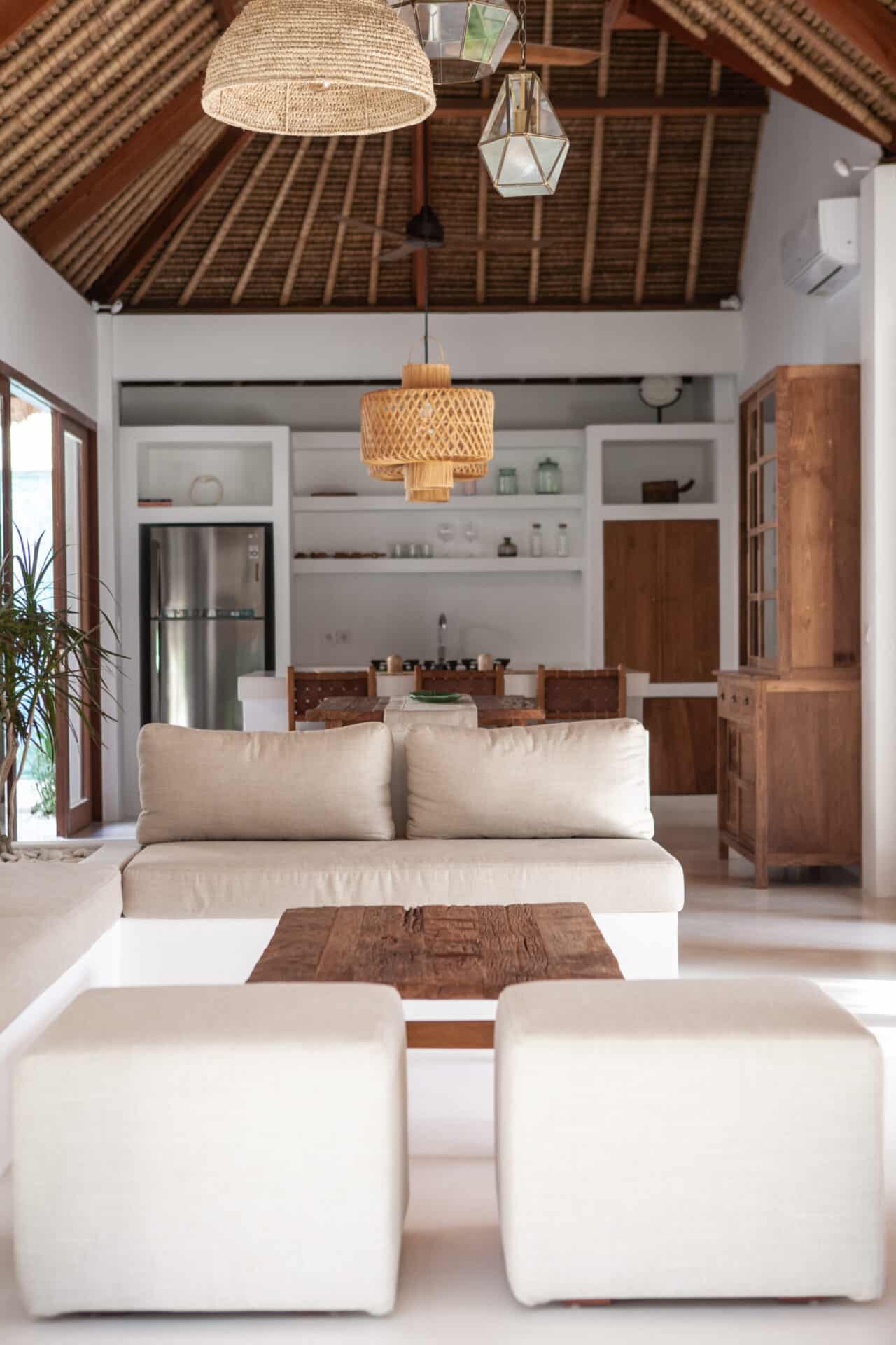 For the Villa Temple project, we embraced a sun drenched Mediterranean narrative that honors the slow, intentional pace of coastal living. We designed the expansive open plan living area under a traditional high vaulted alang alang roof, creating a breathable architectural volume that feels both grand and grounded.