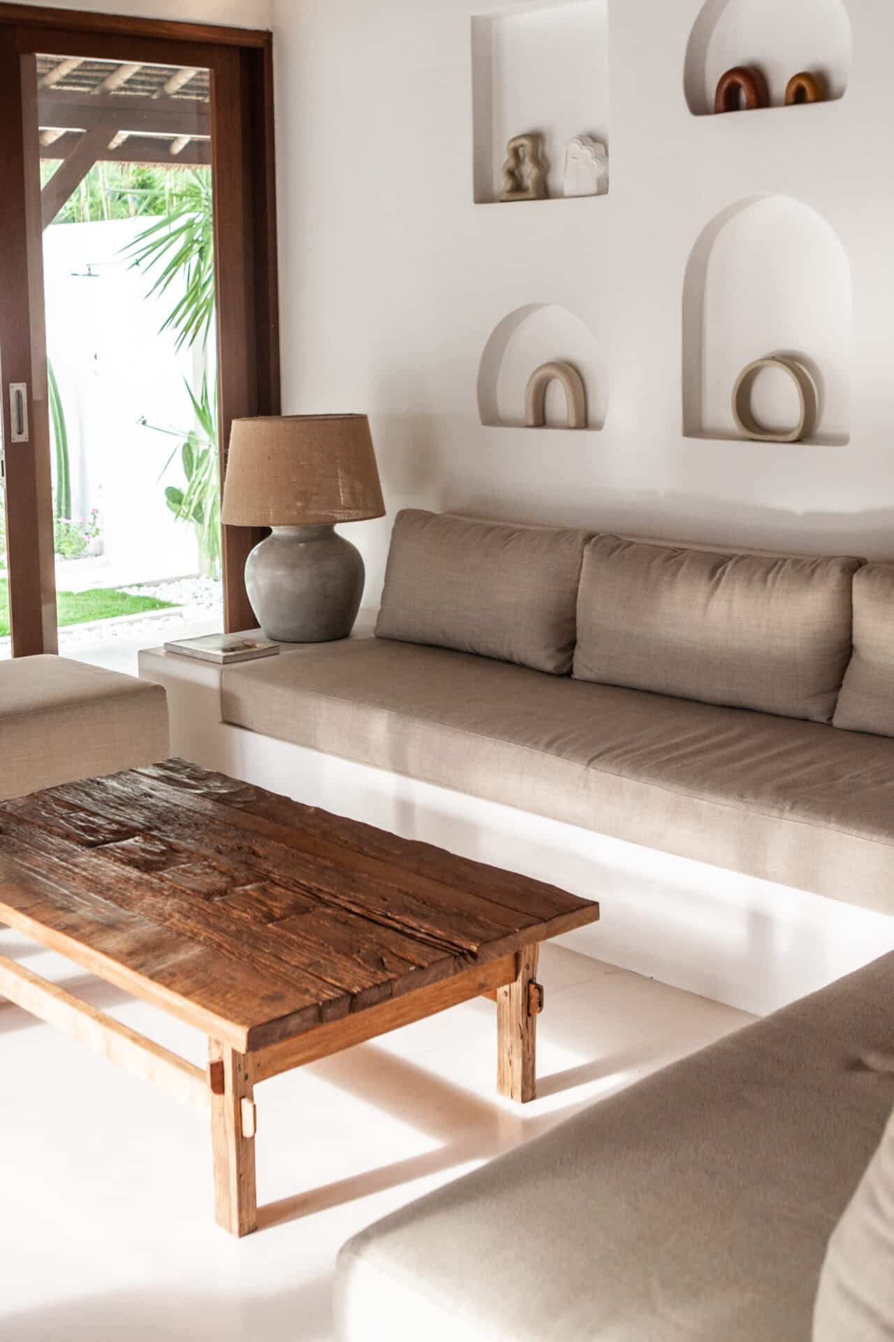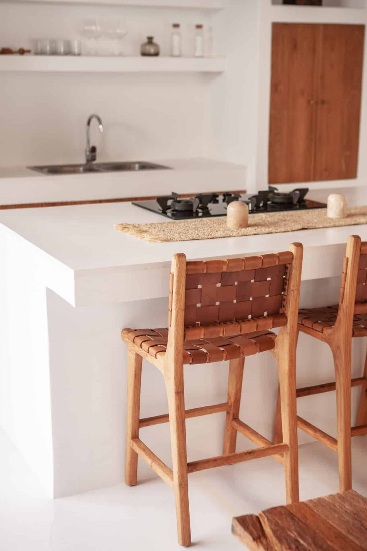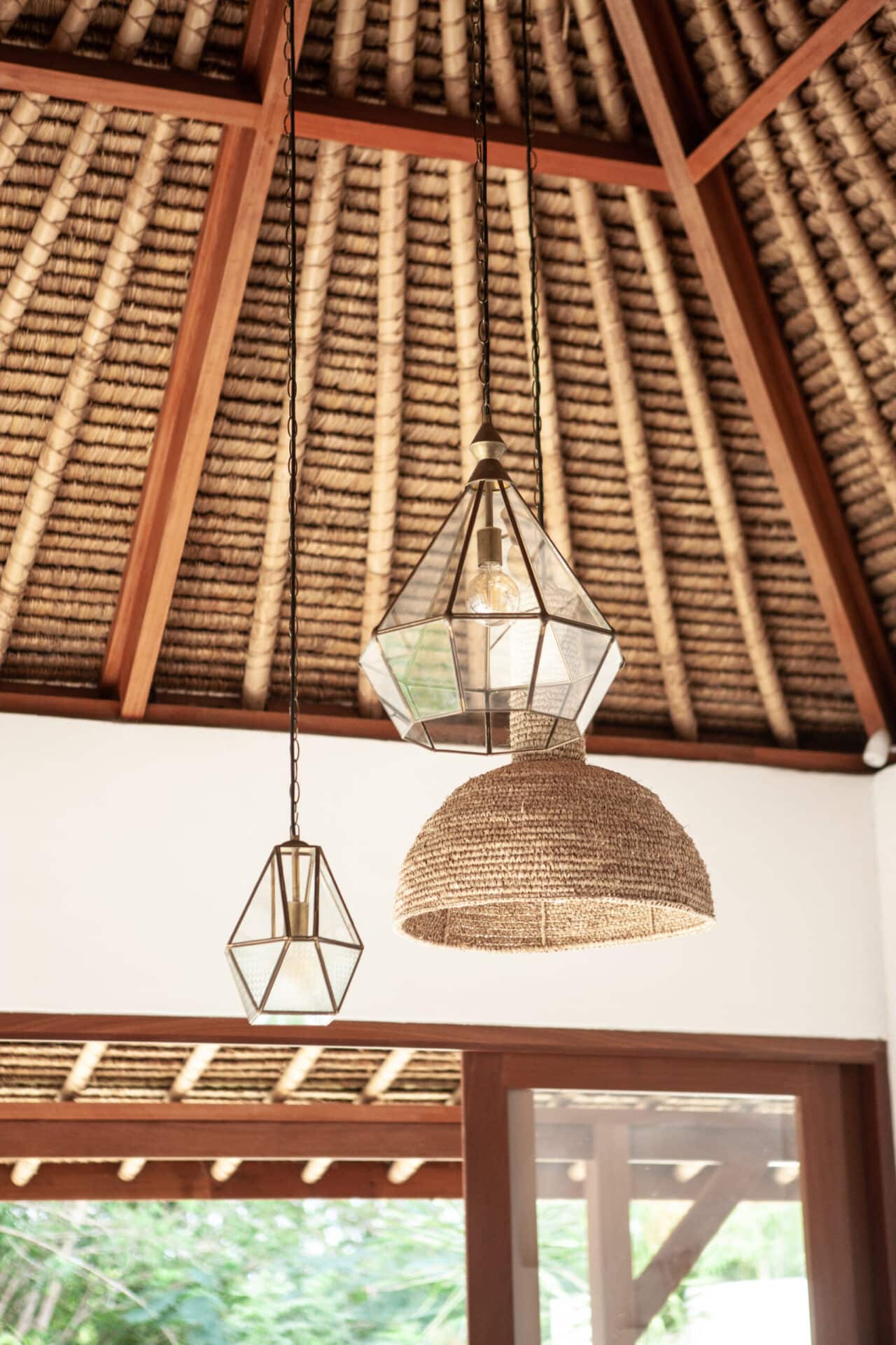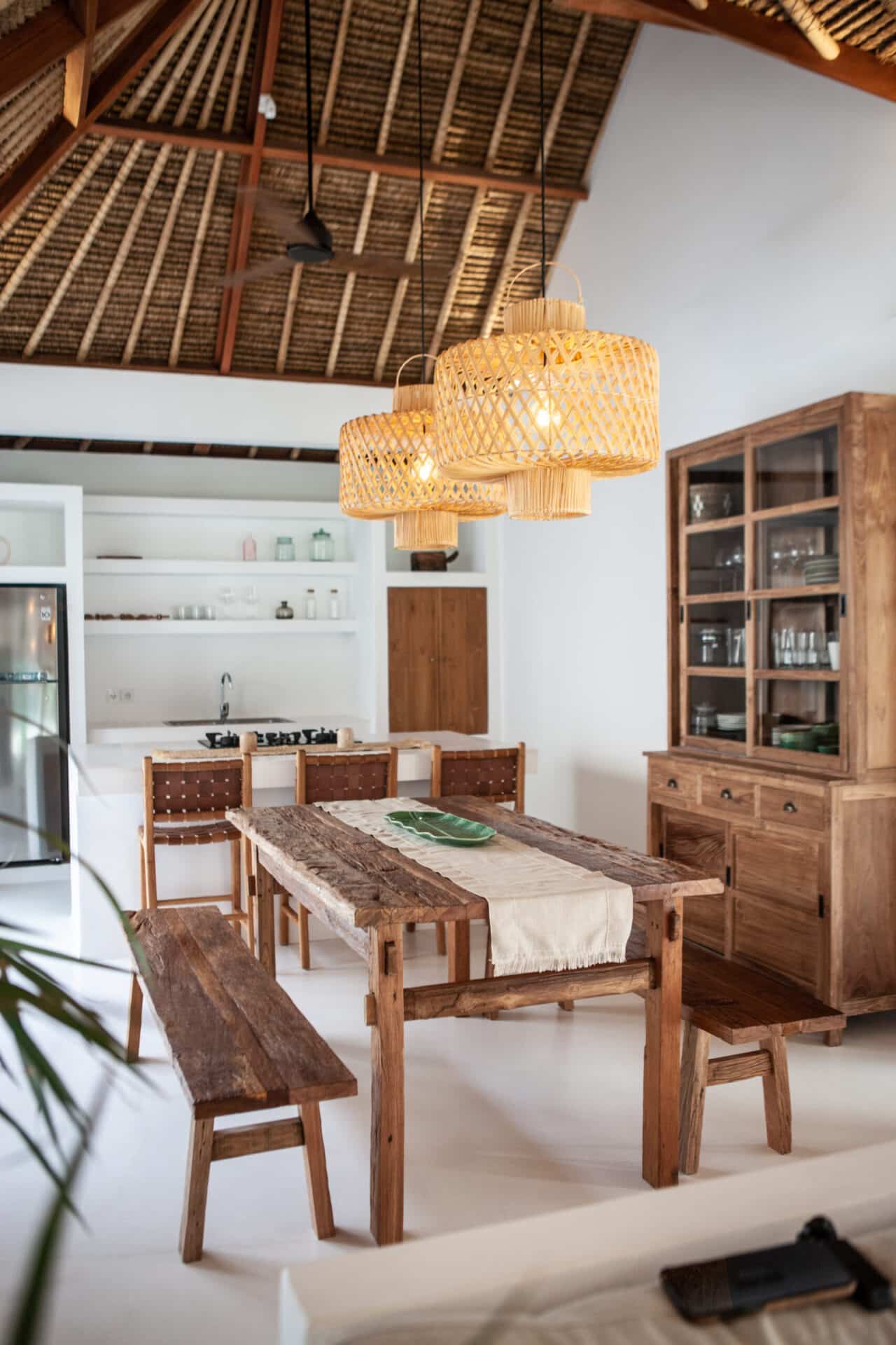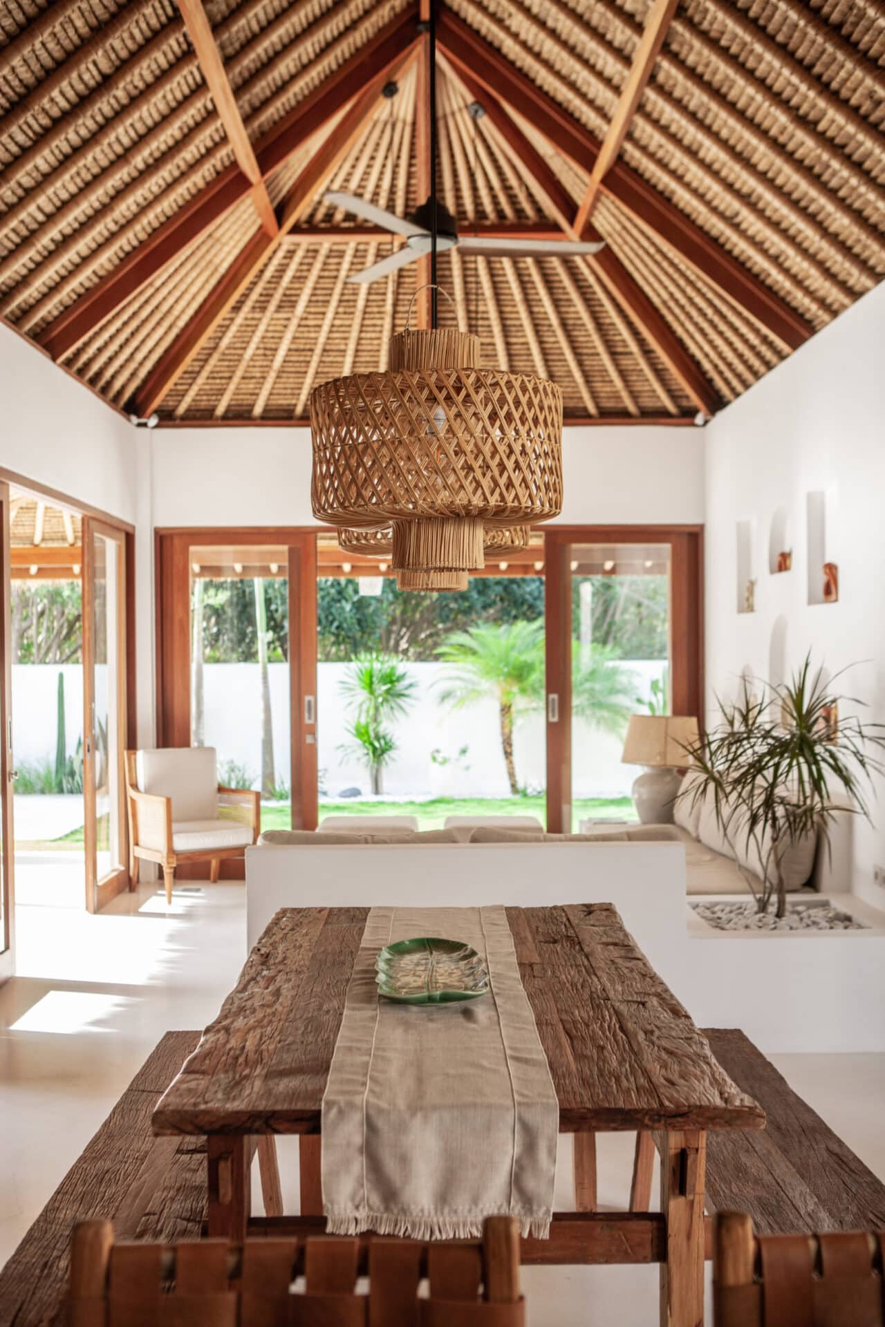 We focused heavily on the use of raw, noble materials to bring a sense of timelessness to the villa’s interior. In the heart of the home, we featured a bespoke dining table crafted from reclaimed tropical timber, paired with hand woven rattan pendant lights that cast intricate shadow patterns across the space.
