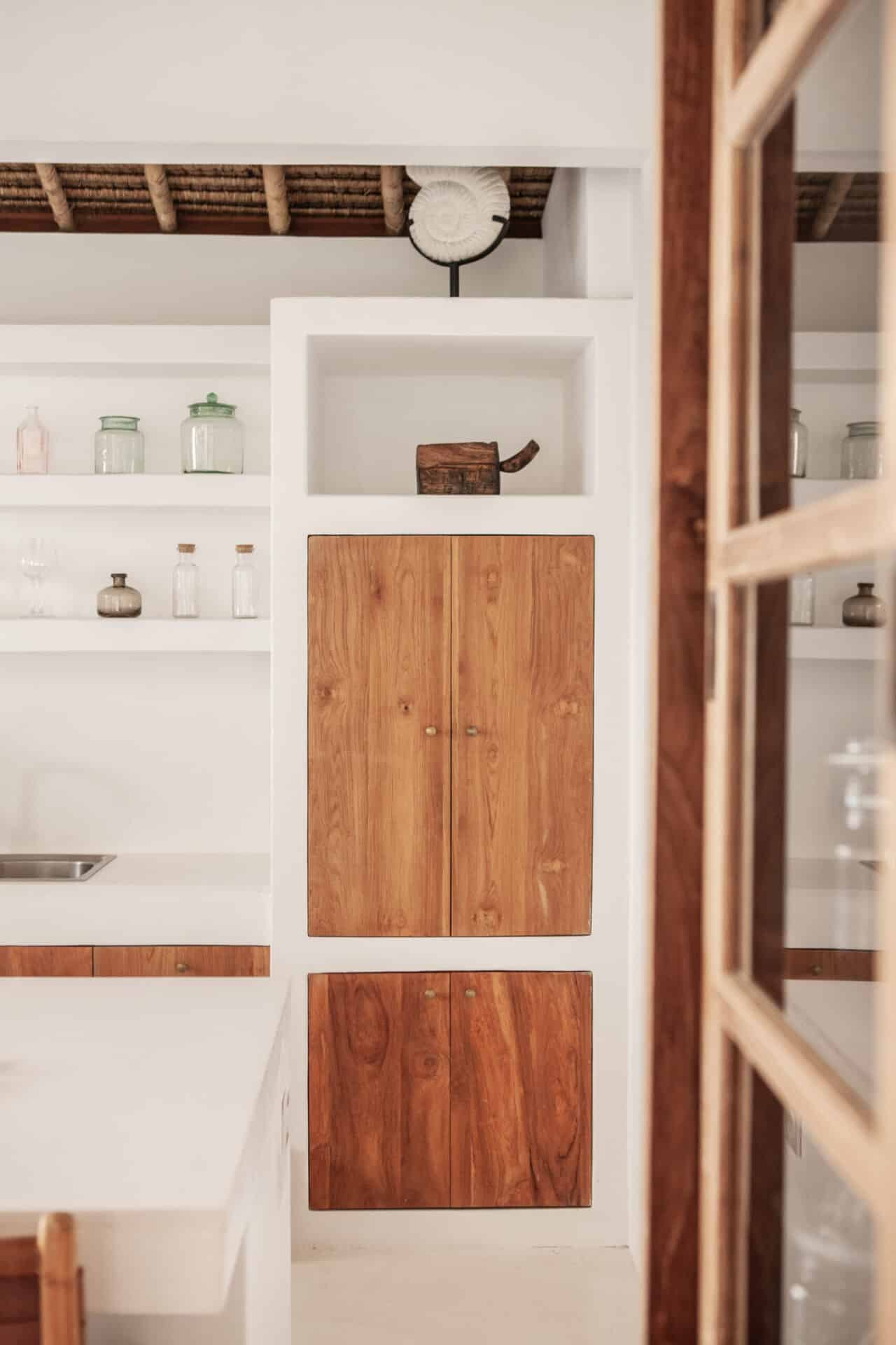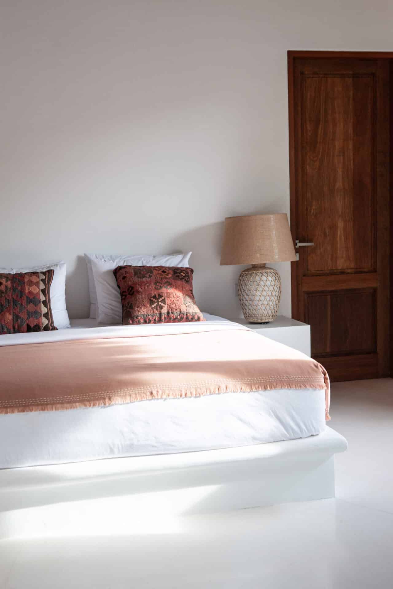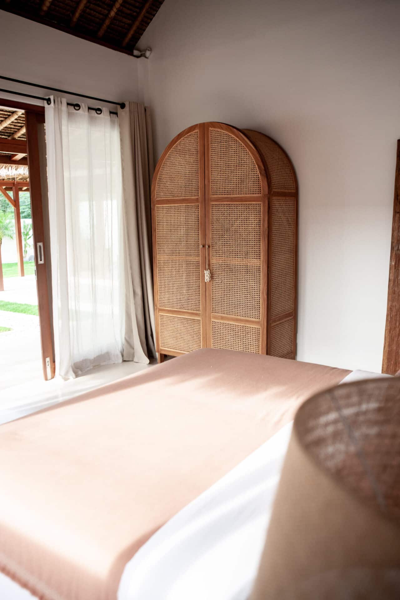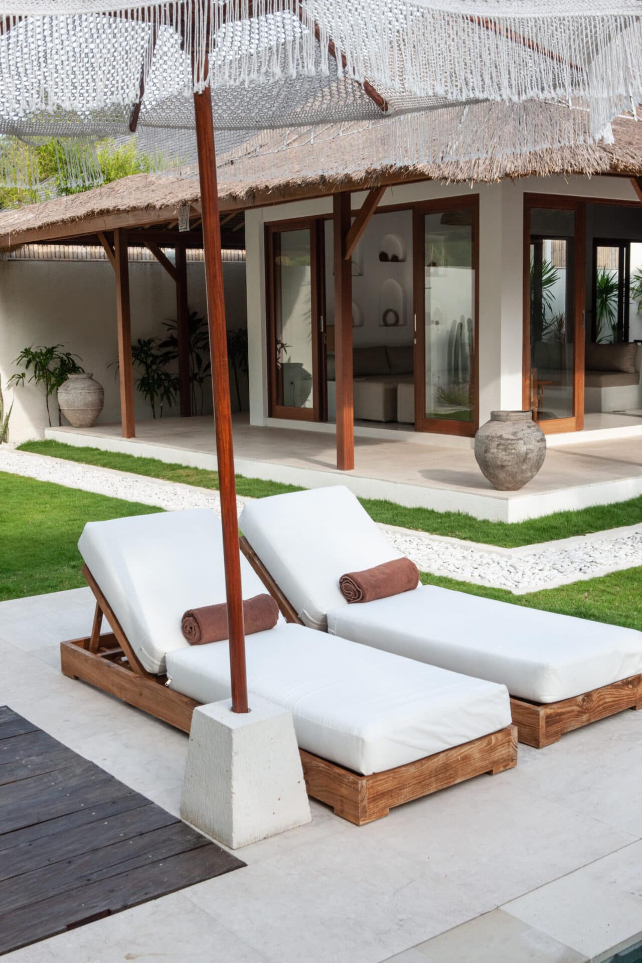 We focused heavily on the use of raw, noble materials to bring a sense of timelessness to the villa’s interior. In the heart of the home, we featured a bespoke dining table crafted from reclaimed tropical timber, paired with hand woven rattan pendant lights that cast intricate shadow patterns across the space.