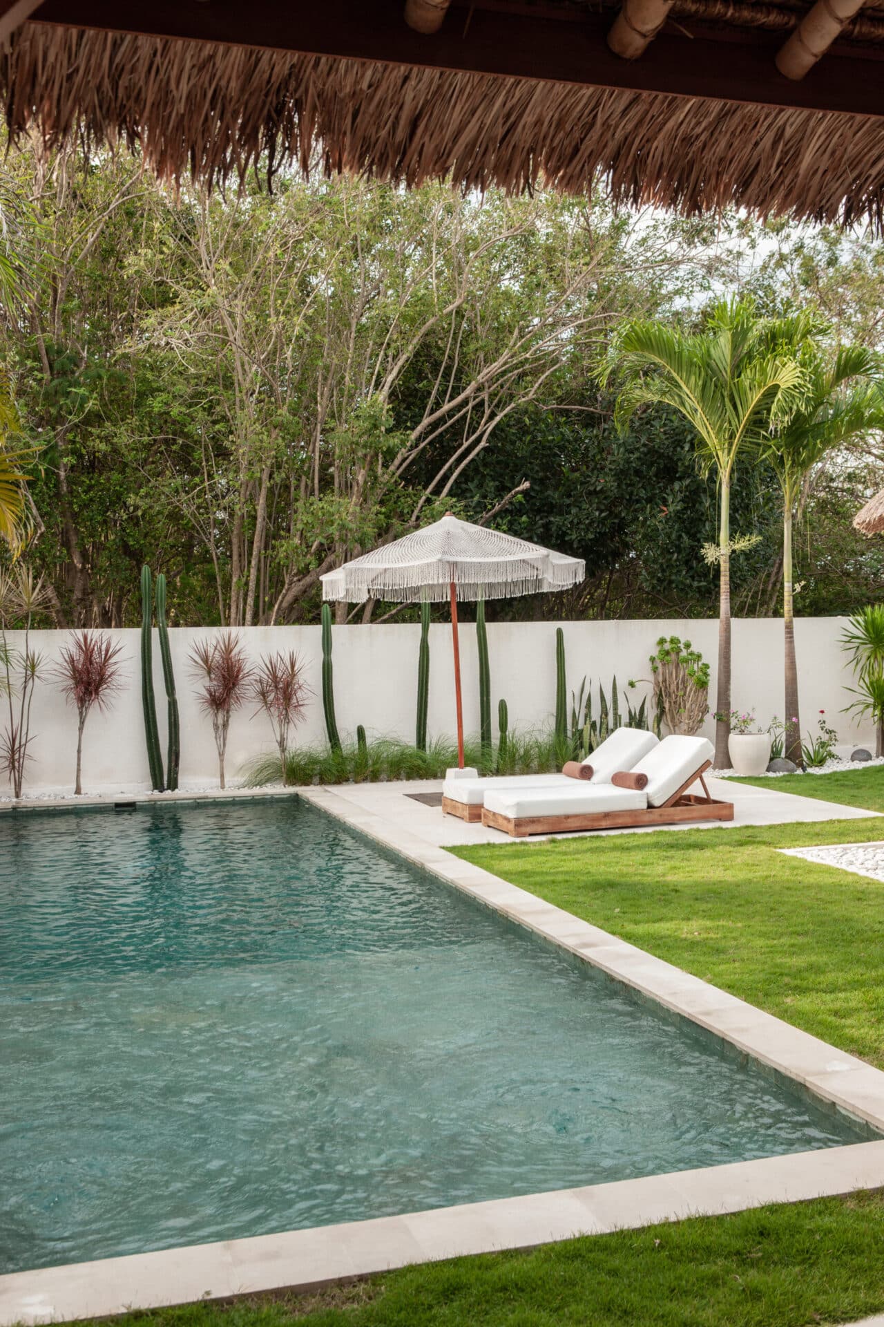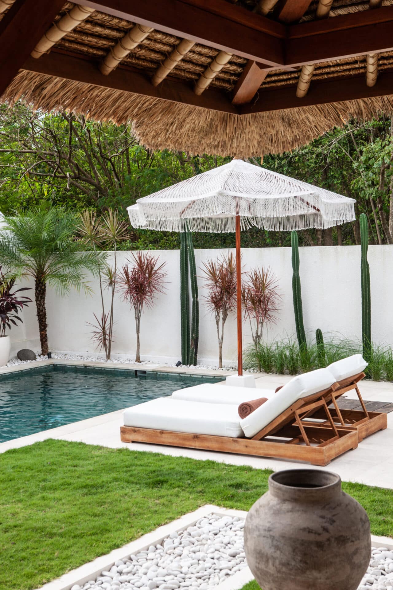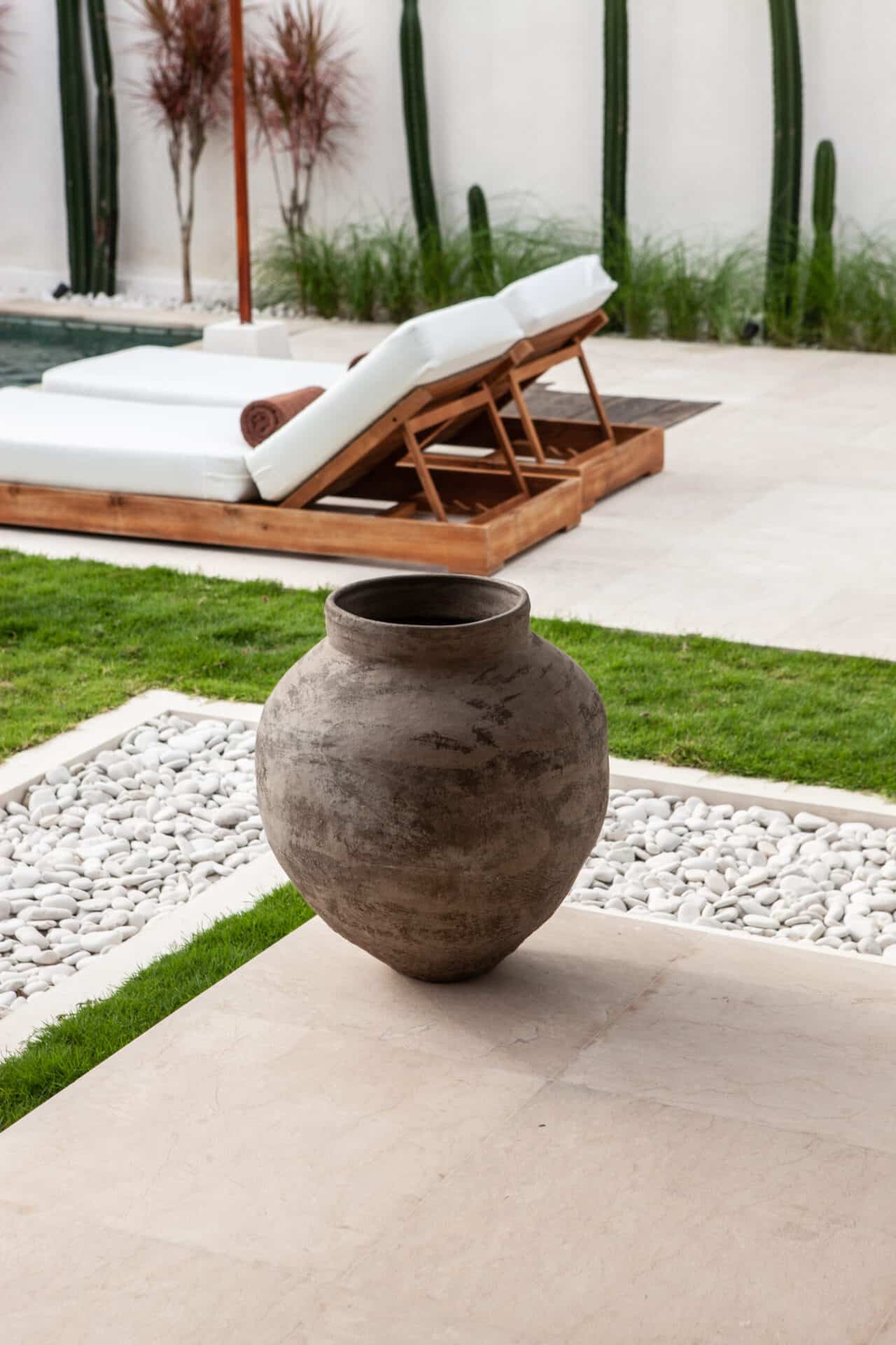 Outside, the Mediterranean influence continues with a pristine white stone terrace, a crochet fringed poolside umbrella, and weathered stone vessels that punctuate the manicured lawn. Every detail, from the built in masonry sofas to the strategic placement of desert flora, was chosen by our studio to evoke a sense of profound serenity and barefoot luxury.