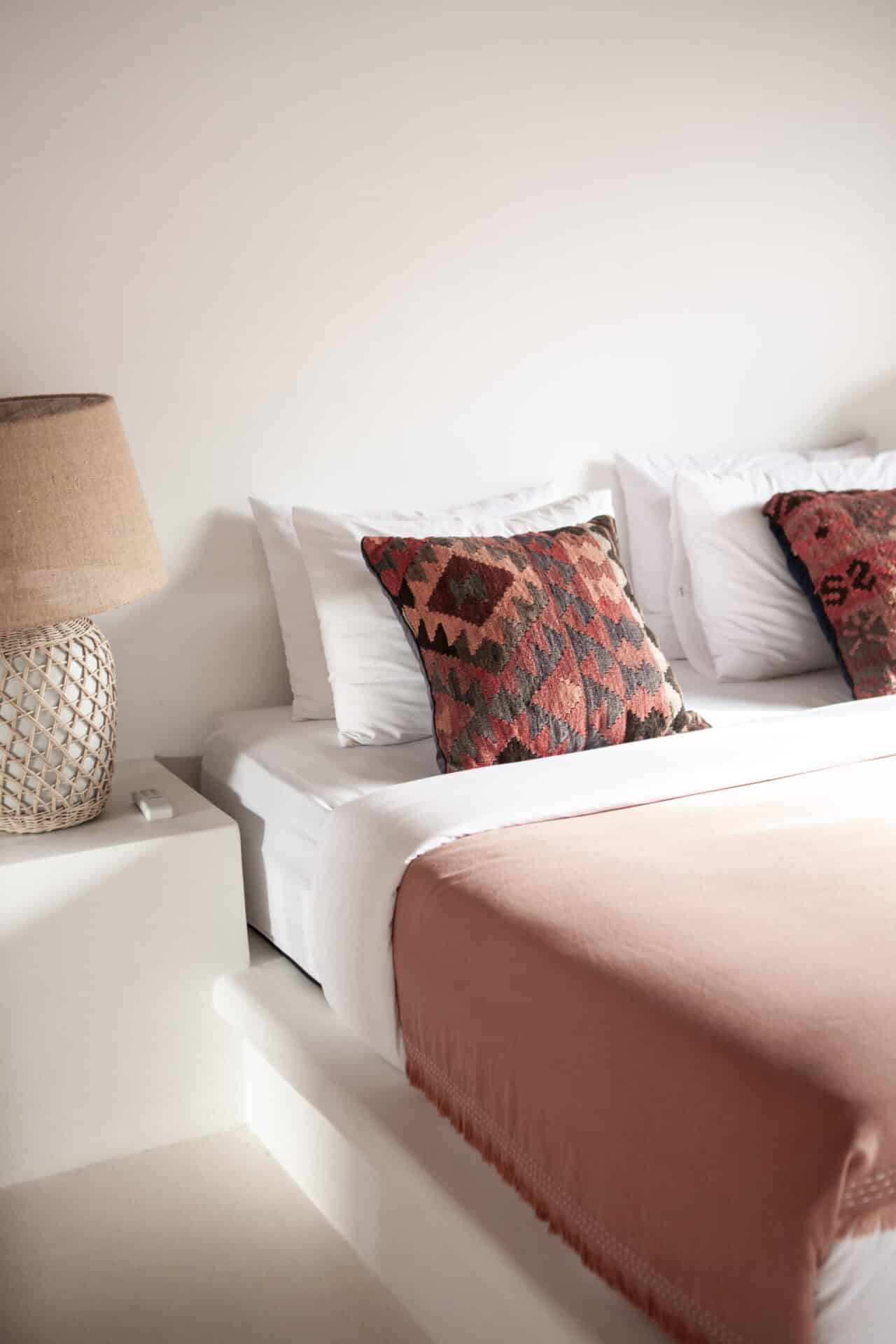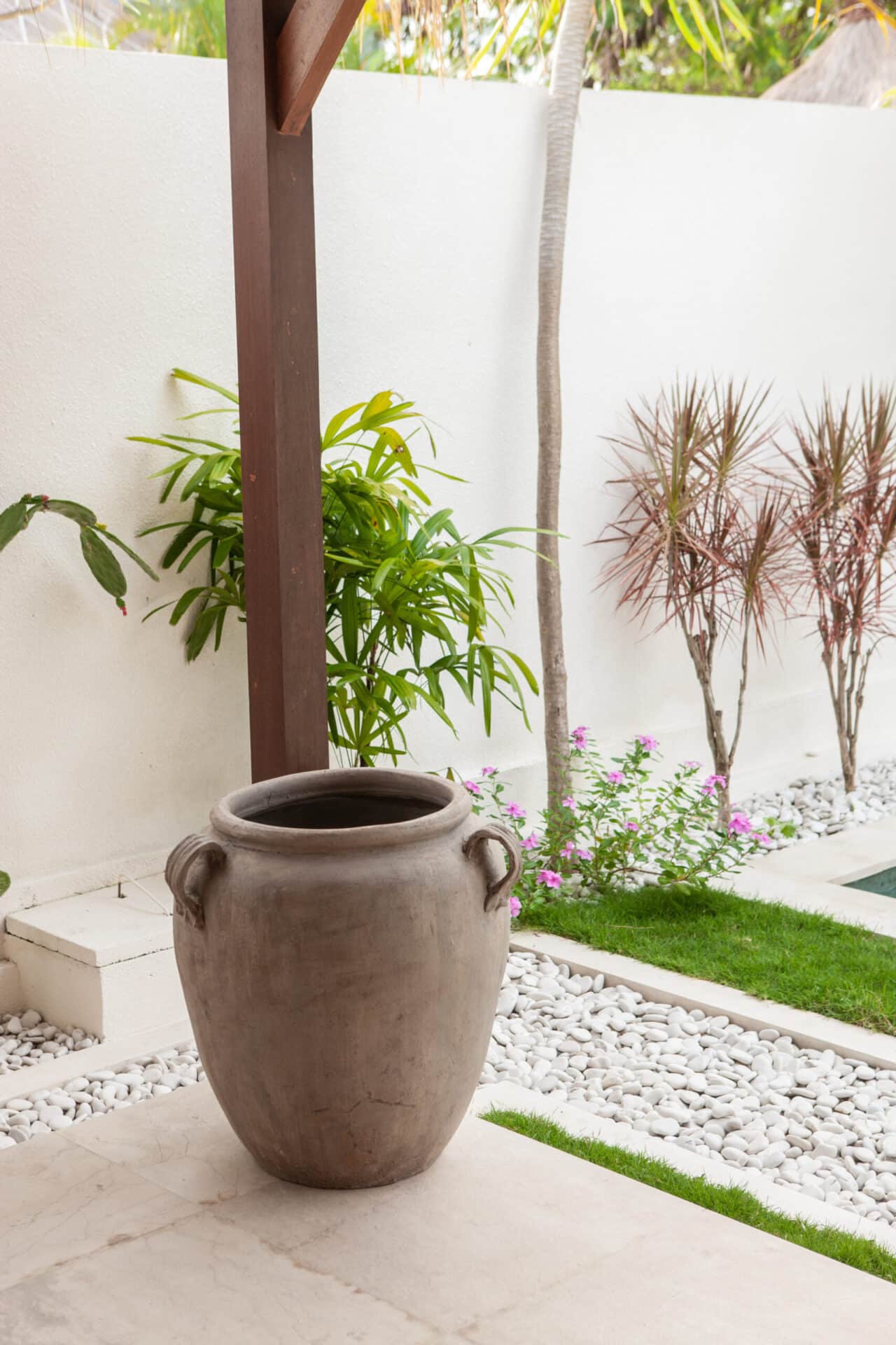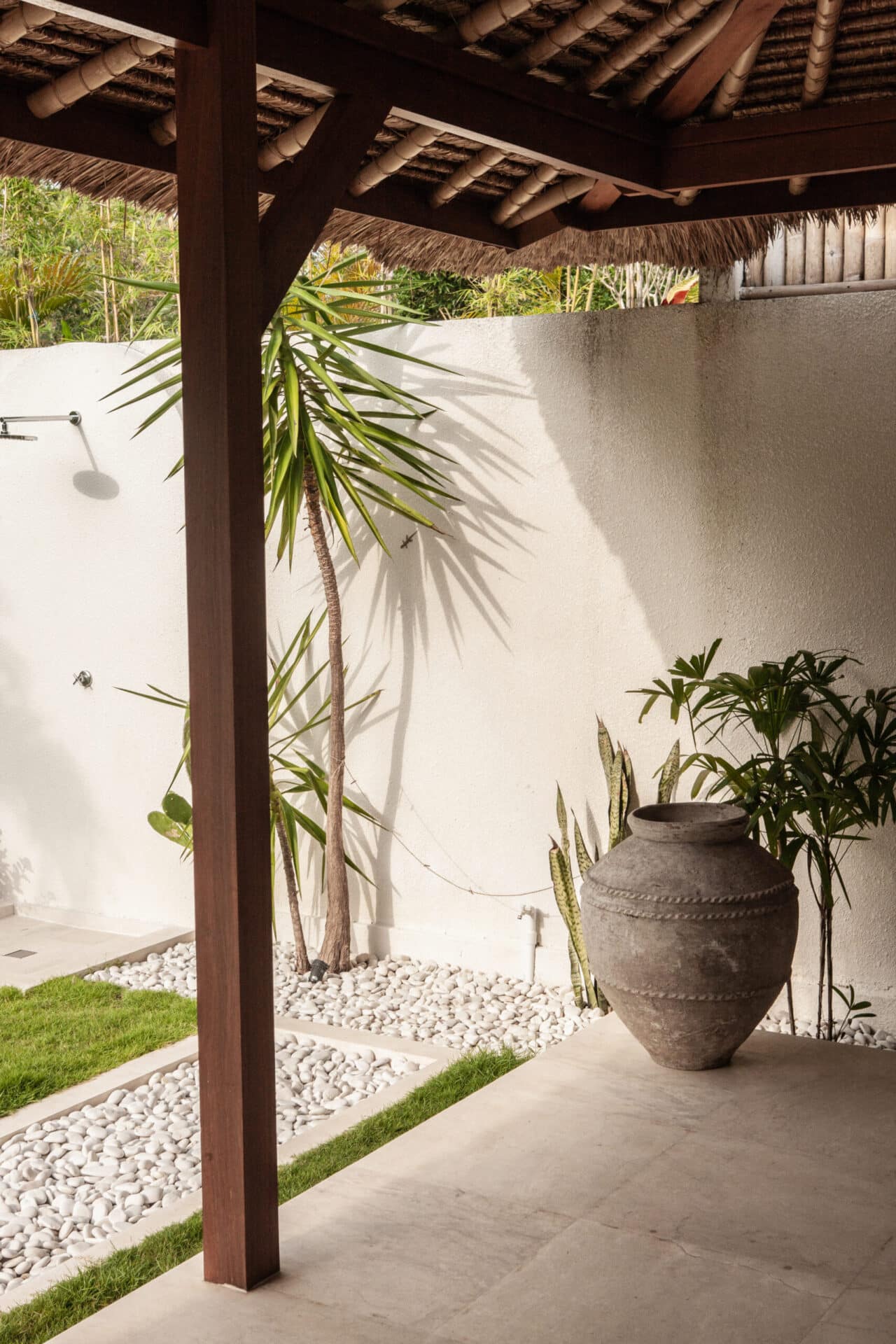 Outside, the Mediterranean influence continues with a pristine white stone terrace, a crochet fringed poolside umbrella, and weathered stone vessels that punctuate the manicured lawn. Every detail, from the built in masonry sofas to the strategic placement of desert flora, was chosen by our studio to evoke a sense of profound serenity and barefoot luxury.